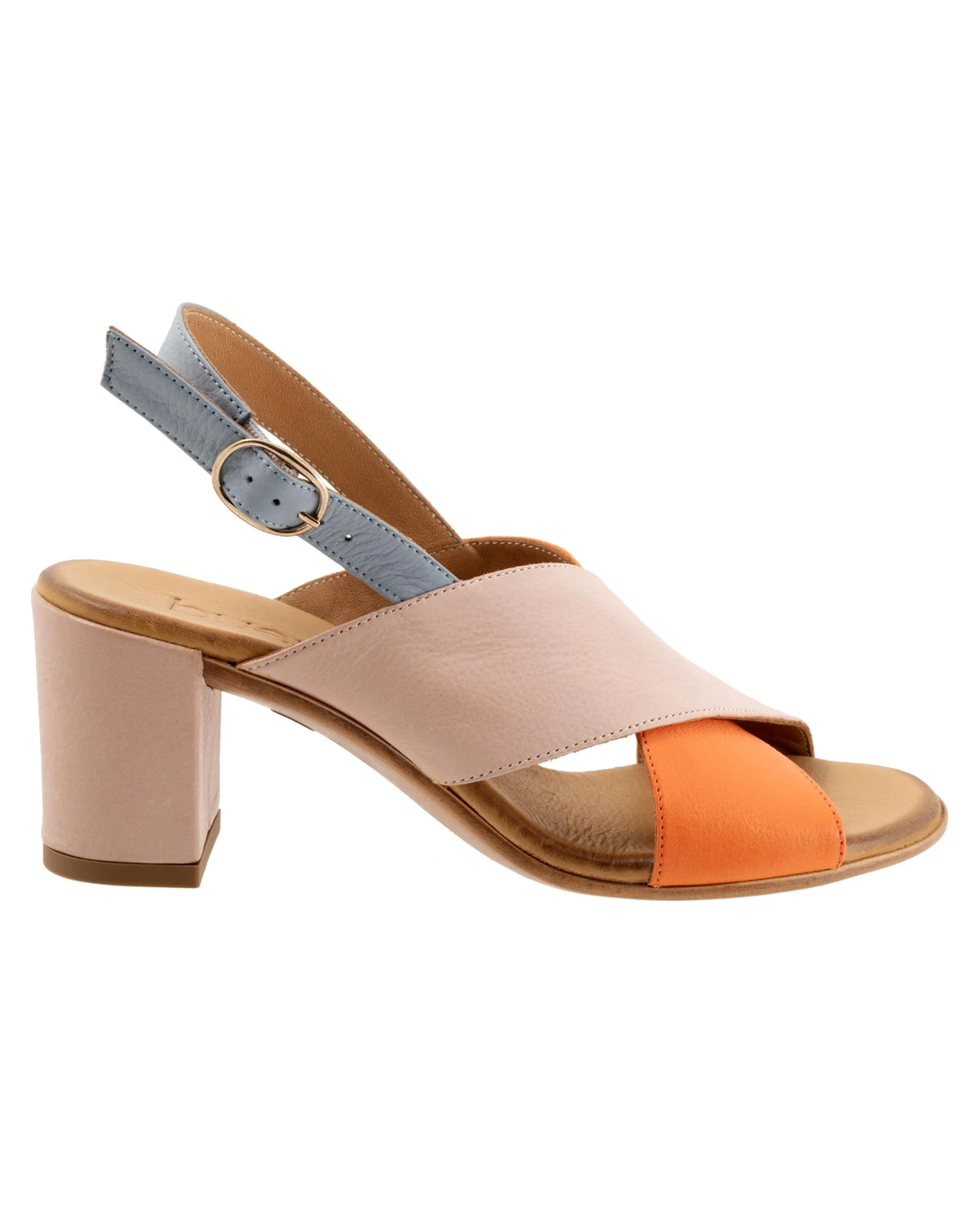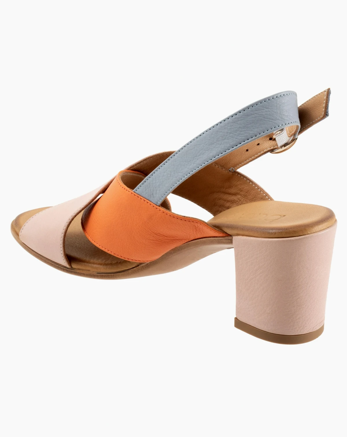 Criss crossing straps in multiple colors work with an adjustable sling and color-matched wrapped heel on the Natasha sandal.
