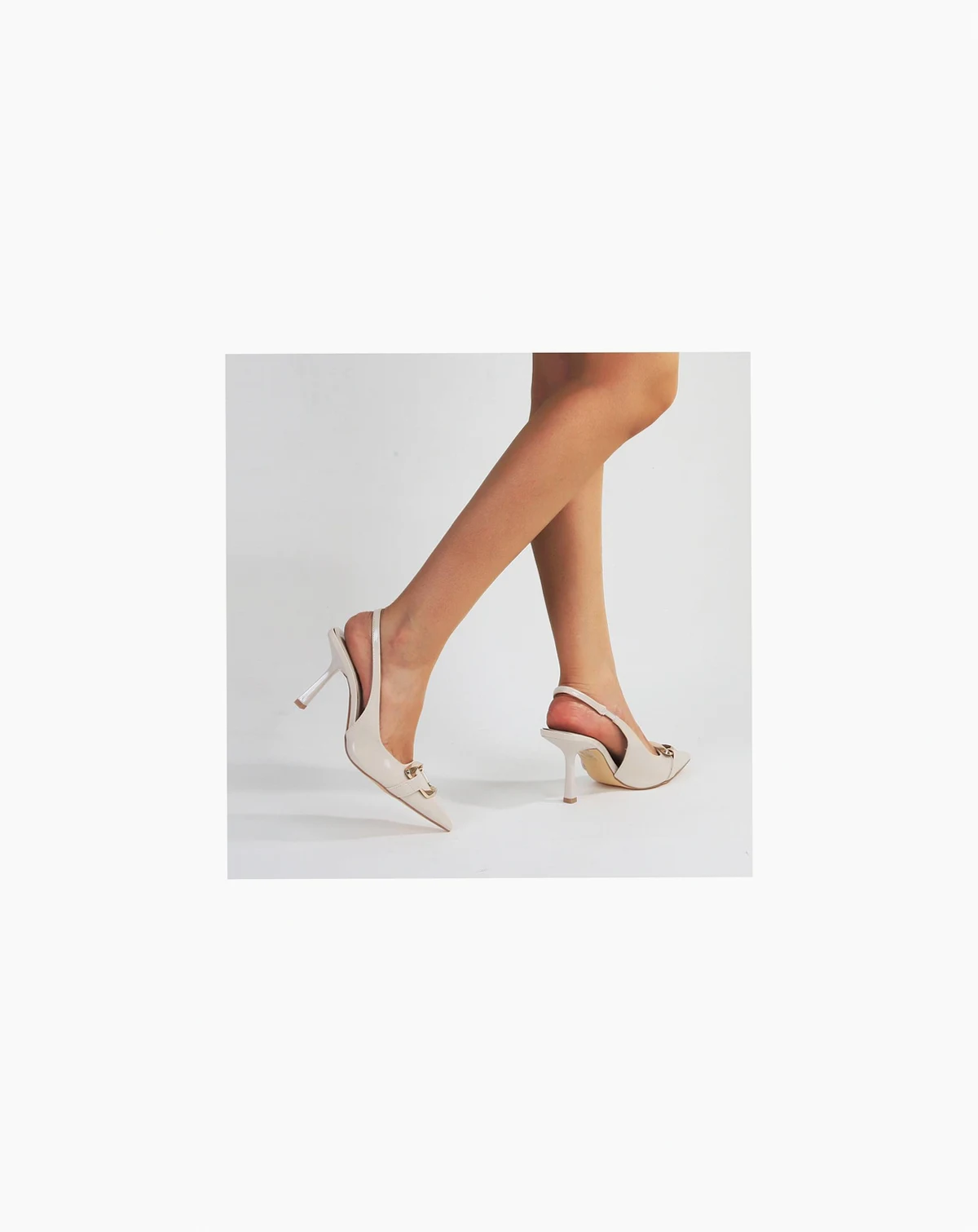 Cindy pointed-toe slingback heels showcase a statement metal ornament and glossy patent finish, adding a polished touch to any look.
