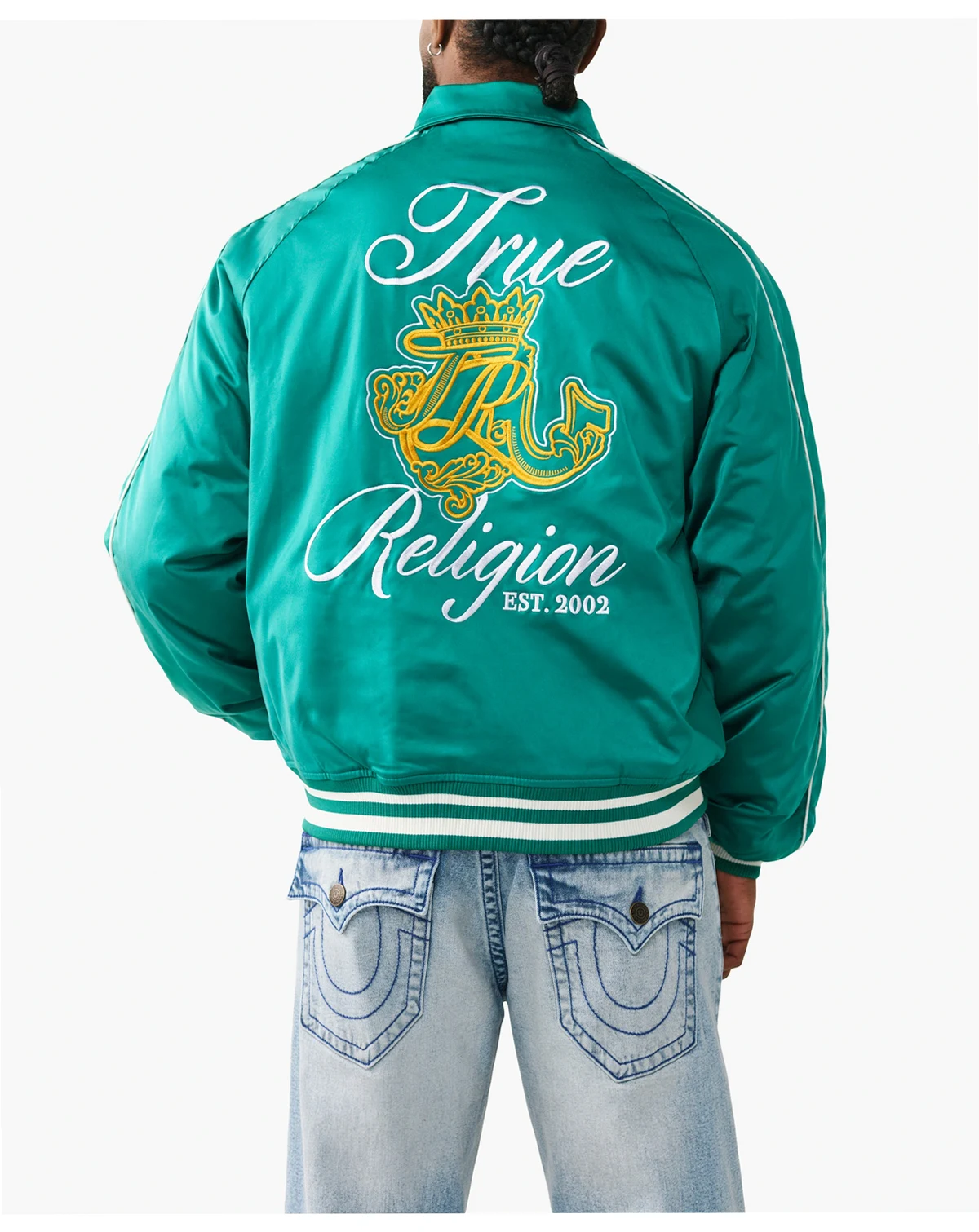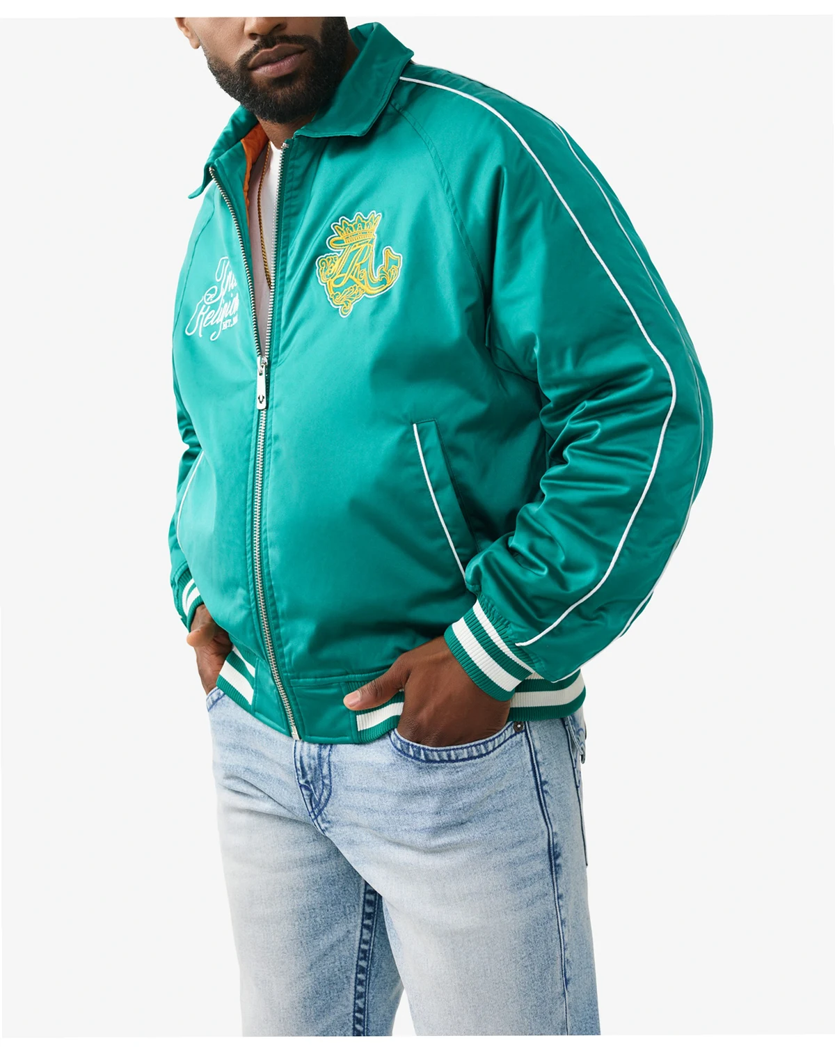 Crafted with a sleek satin outer-lining, this jacket features a zipper front, a classic collar, slanted front pockets, and striped trim. Complete with embroidered crest logo designs on the front.