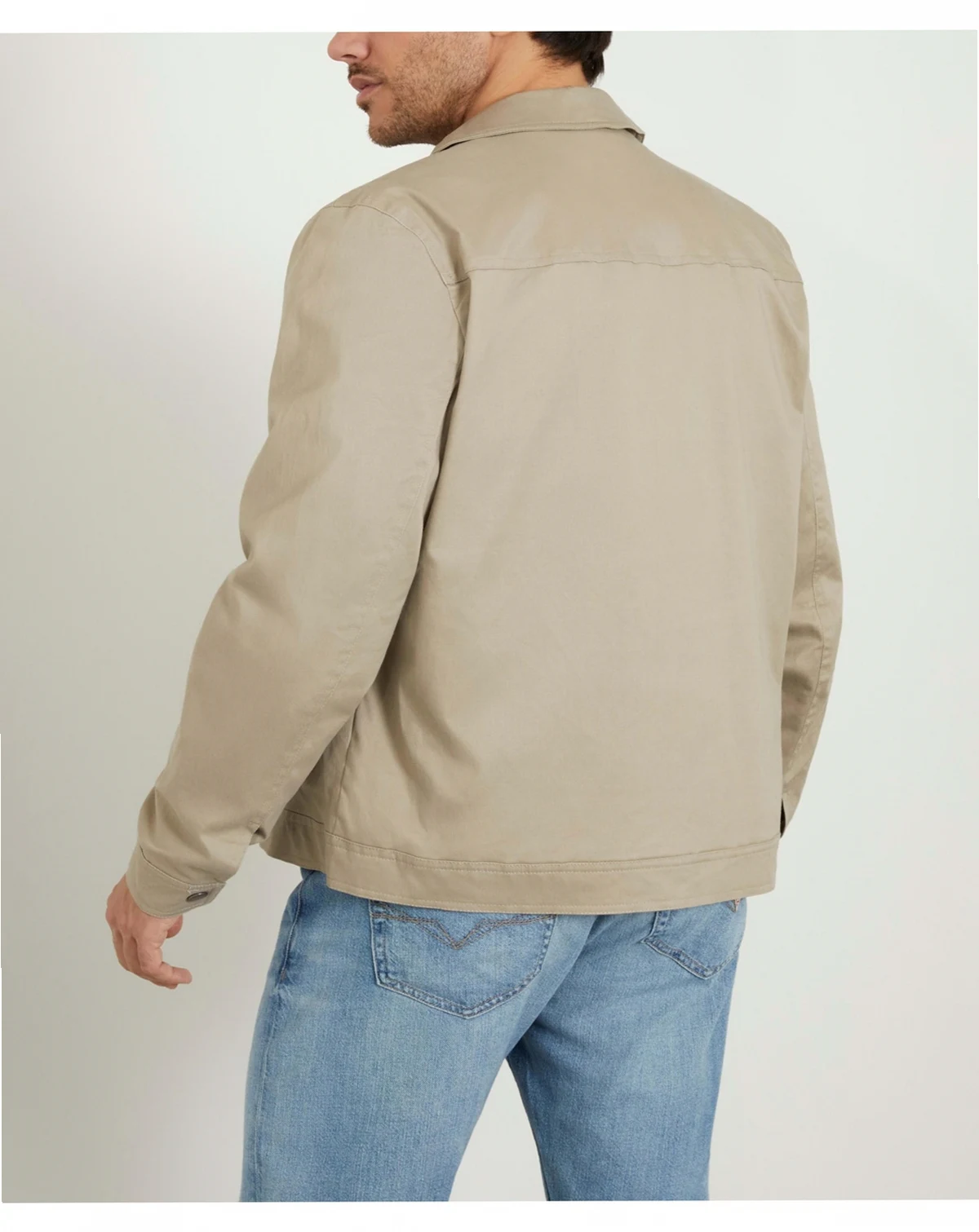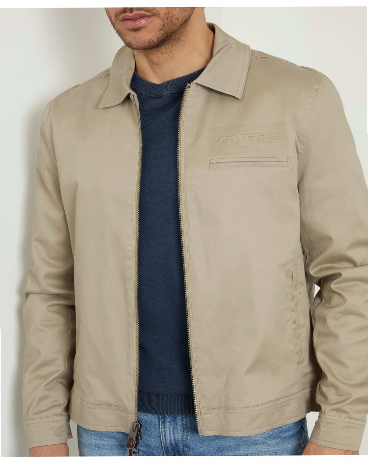 This twill zip jacket features a folded collar, side slip pockets, and an embossed GUESS logo.