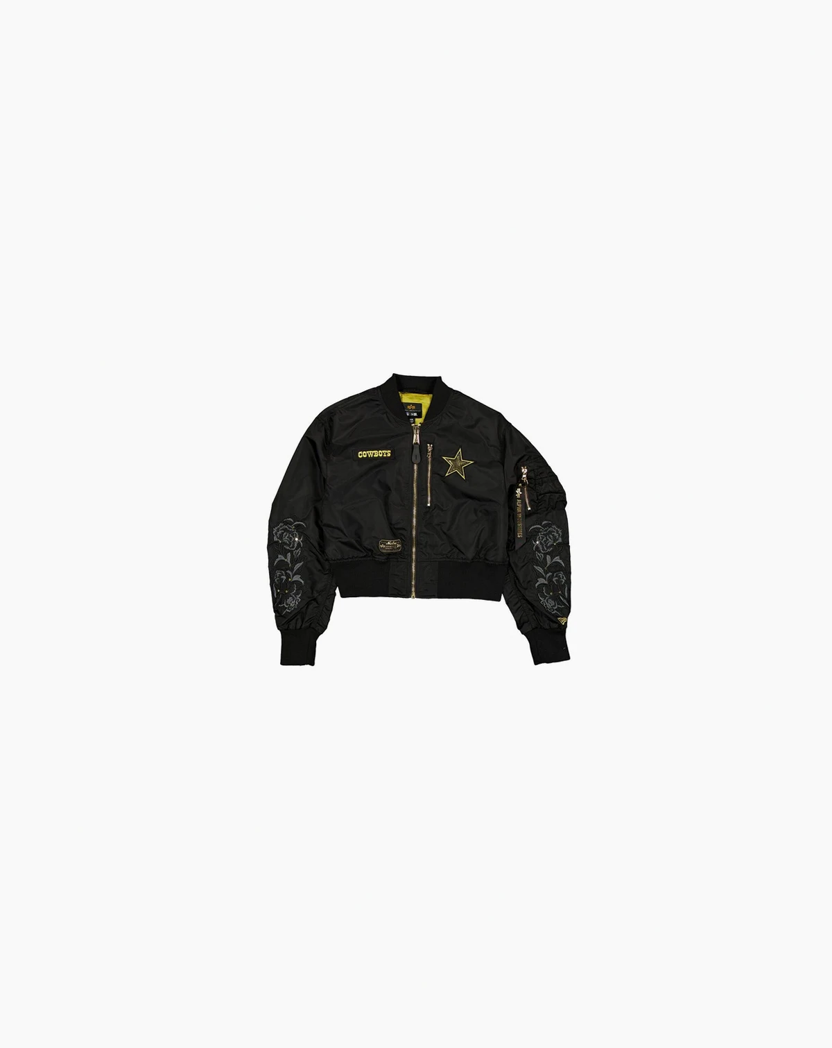 Alpha Industries has a long and storied history of crafting high-quality outerwear for the U.S. military and fashion-forward consumers alike, making this New Era collaboration a must-have. This luxurious Dallas Cowboys Full-Zip Crop Jacket has a cropped silhouette that sits perfectly at the waist, creating a chic and contemporary look. Featuring embroidered floral details down each sleeve and a team patch on the chest with a sequin logo, this lightweight jacket exudes a chic, modern aesthetic. The rib-knit collar, cuffs, and hem provide a snug, comfortable fit, while the multiple zippered pockets offer secure storage for your essentials. Level up your look and let everyone know who you rep by adding this jacket to your Dallas Cowboys wardrobe.