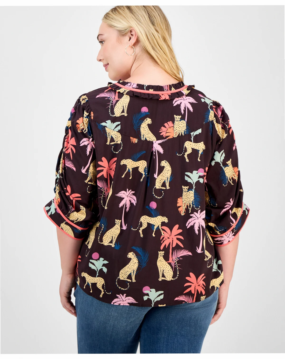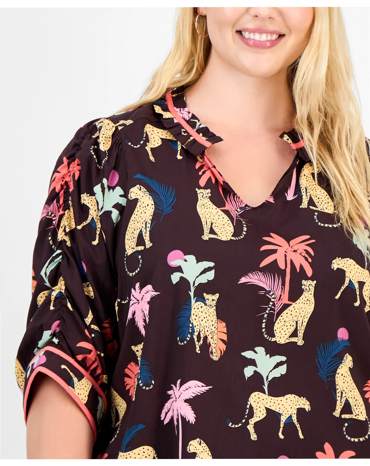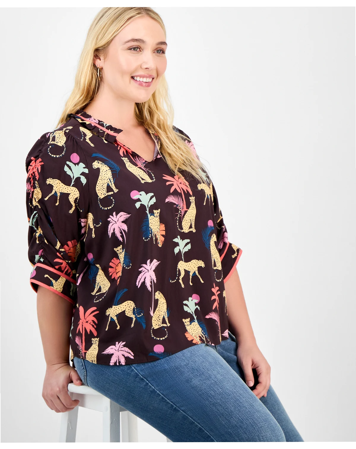 Boldly printed for eye-catching appeal and framed at the sides with ruched elbow-length sleeves for added coverage, Democracy's split-neck blouse instantly amps up the style in any outfit.