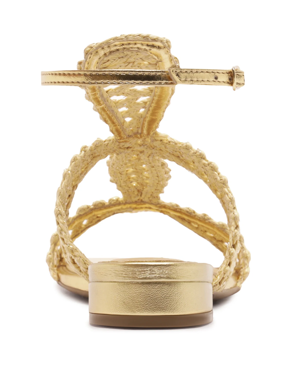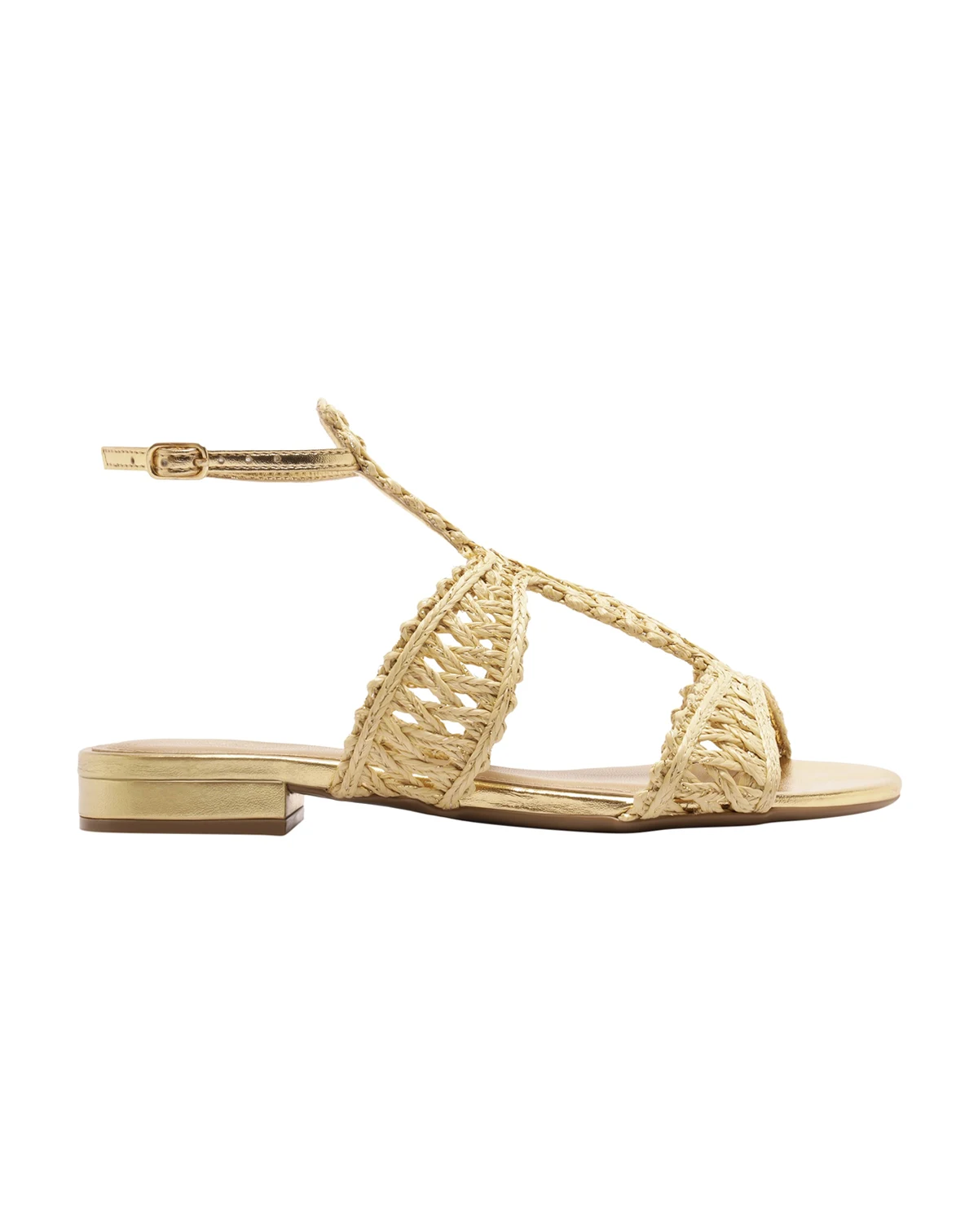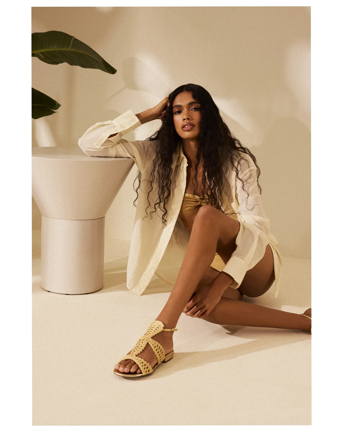 Light, airy, and effortlessly chic. The Ciara Flat Sandal features intricate woven straps and a secure ankle closure for a look that's both natural and refined. Perfect for warm days and relaxed elegance.