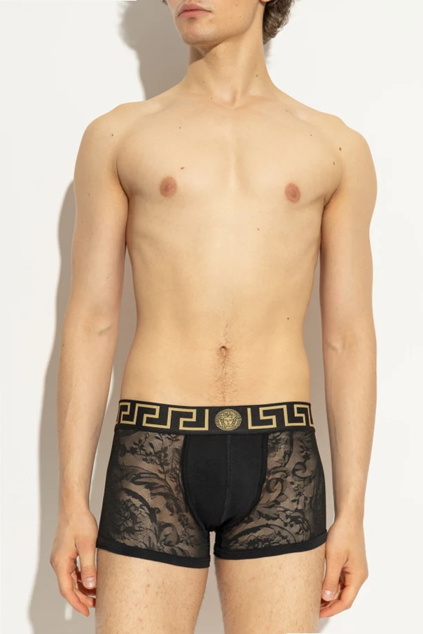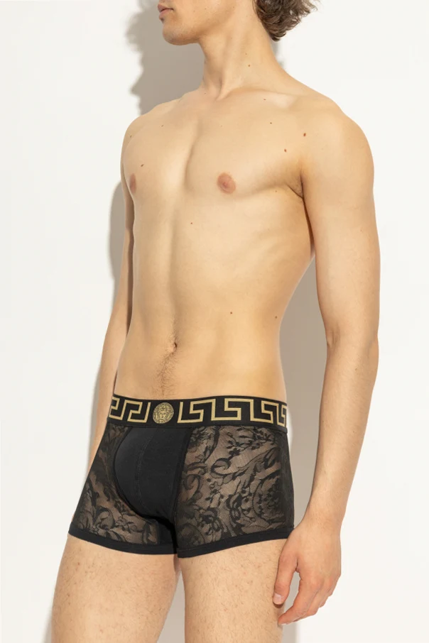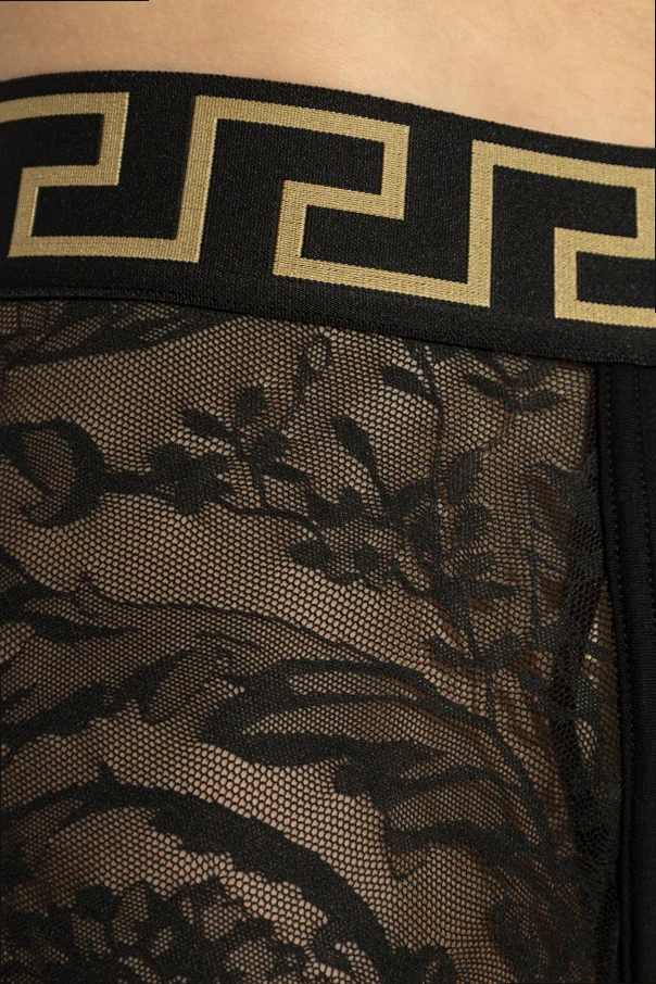 The front and sides are adorned with semi-sheer, floral-patterned lace, revealing a subtle interplay of light and shadow, while the opaque central panel ensures unwavering comfort and discretion. The hallmark wide waistband, woven with the brand's signature Greek Key motif in gold , is crowned by an iconic round Medusa head logo —a symbol of the house’s legendary heritage.