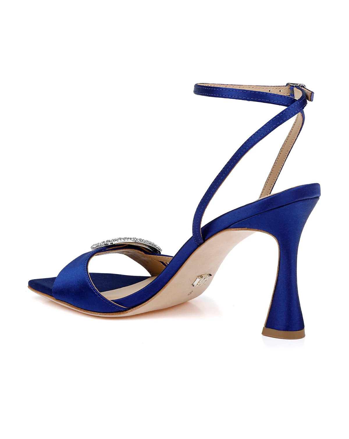 A jewel-encrusted buckle adorns the toe strap on a soiree-ready sandal balanced by an angular square toe and lofty Stiletto heel.
