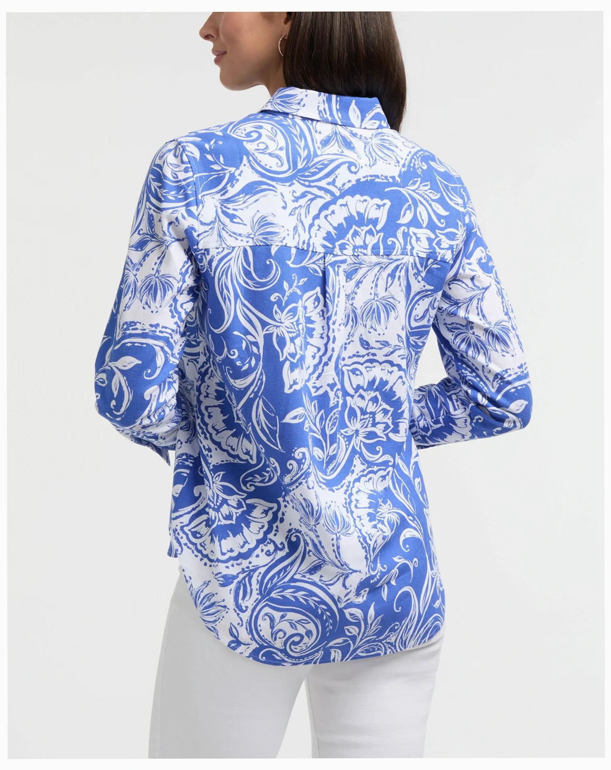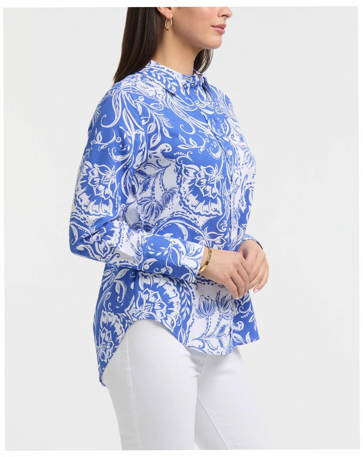 Effortlessly elegant, this button-front shirt features a classic collared neckline, high-low hem, and an easy, relaxed silhouette. Designed with functional double-button cuffs and back pleat detailing, it s a timeless staple that can pair perfectly with tailored bottoms or denim.