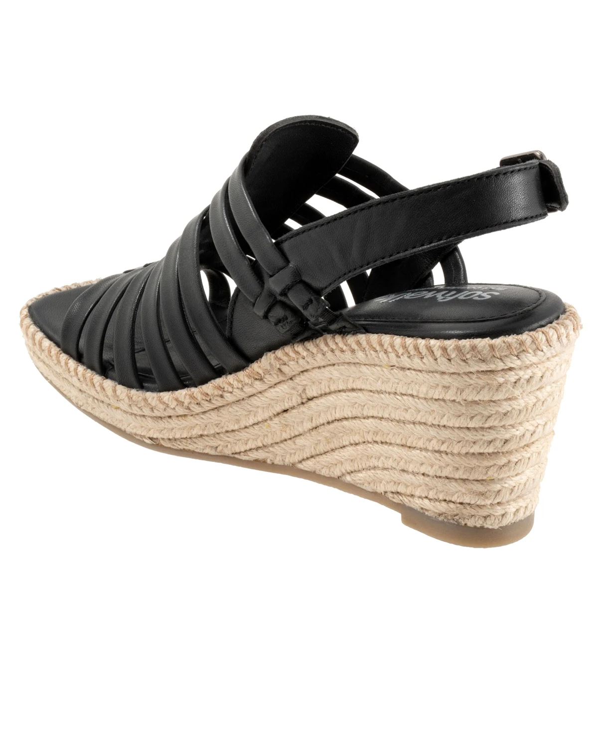 The Havana wedge sandal has multiple thin leather bands and a back strap with adjustable buckle. Hidden elastic goring provides a flexible fit and the artfully braided jute platform is set on a rubber sole.