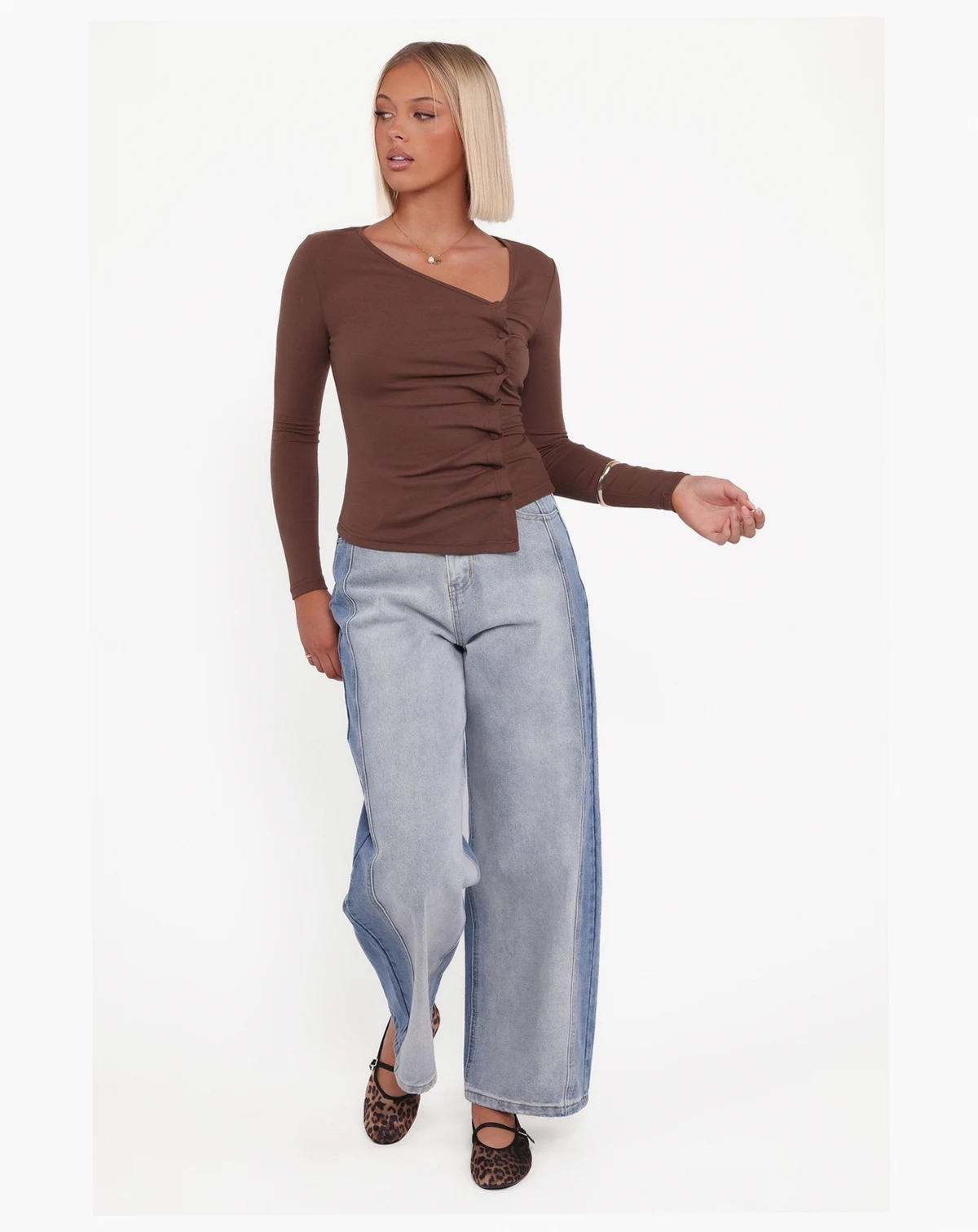 Slip into effortless elegance with the Ethel Asymmetrical Knit Top in Chocolate. Featuring a distinctive asymmetrical neckline and long sleeves, this light brown cotton top brings a polished edge to your wardrobe staples.