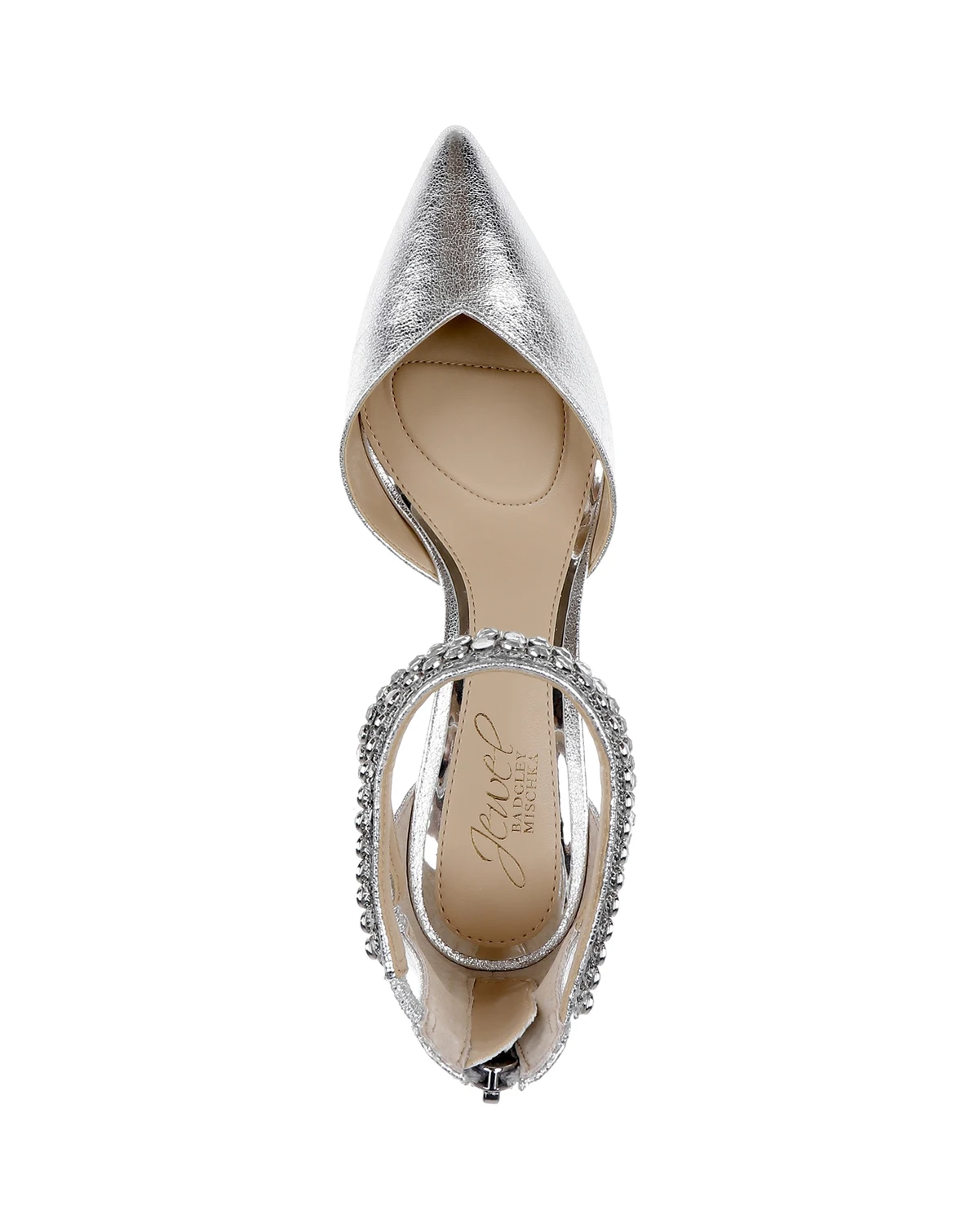 The crystal-adorned ankle straps securely hold the foot in this back-zipper pointed-toe pump style.