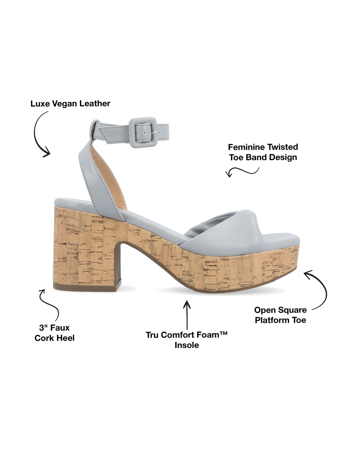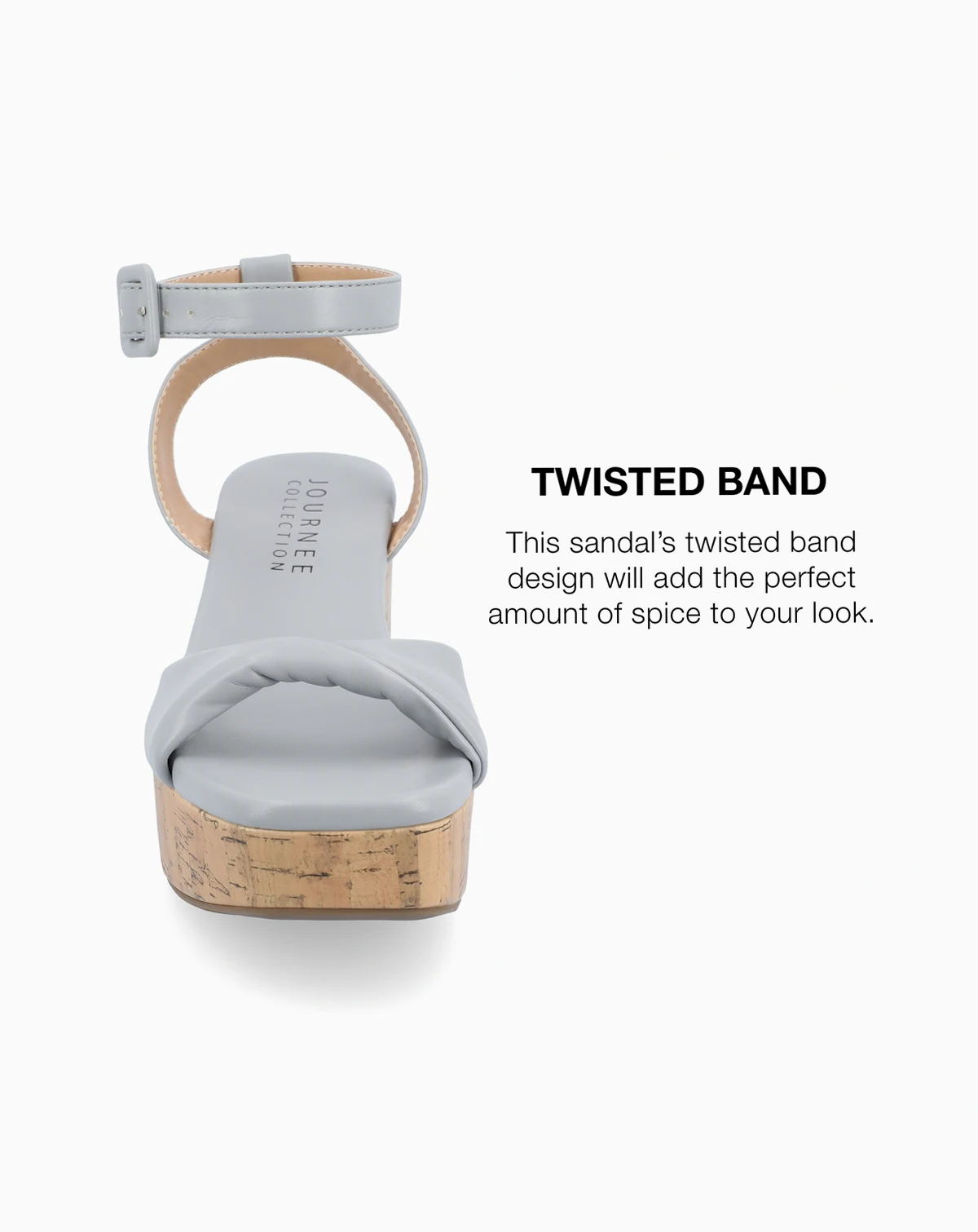 The Eianna sandals from Journee Collection will take you from work, a special event, or even out to dinner in comfort. Their luxe faux leather, faux cork platform, buckled ankle strap, and twist band design will give you all the style you need.