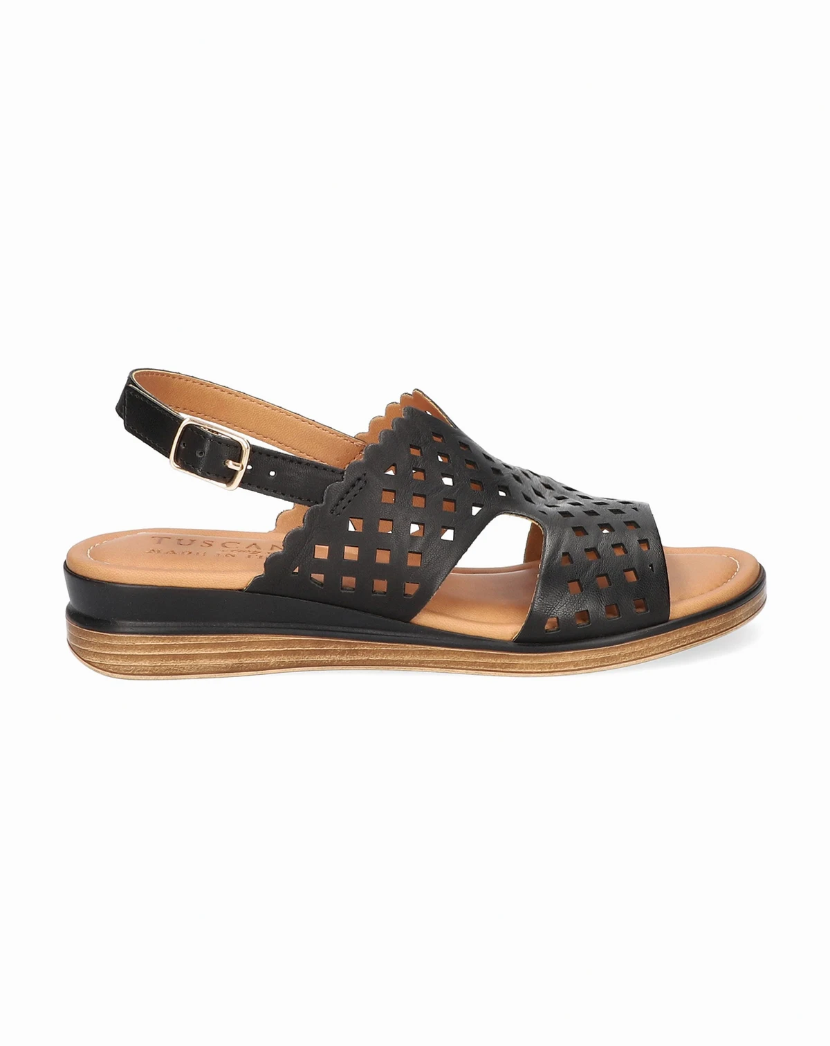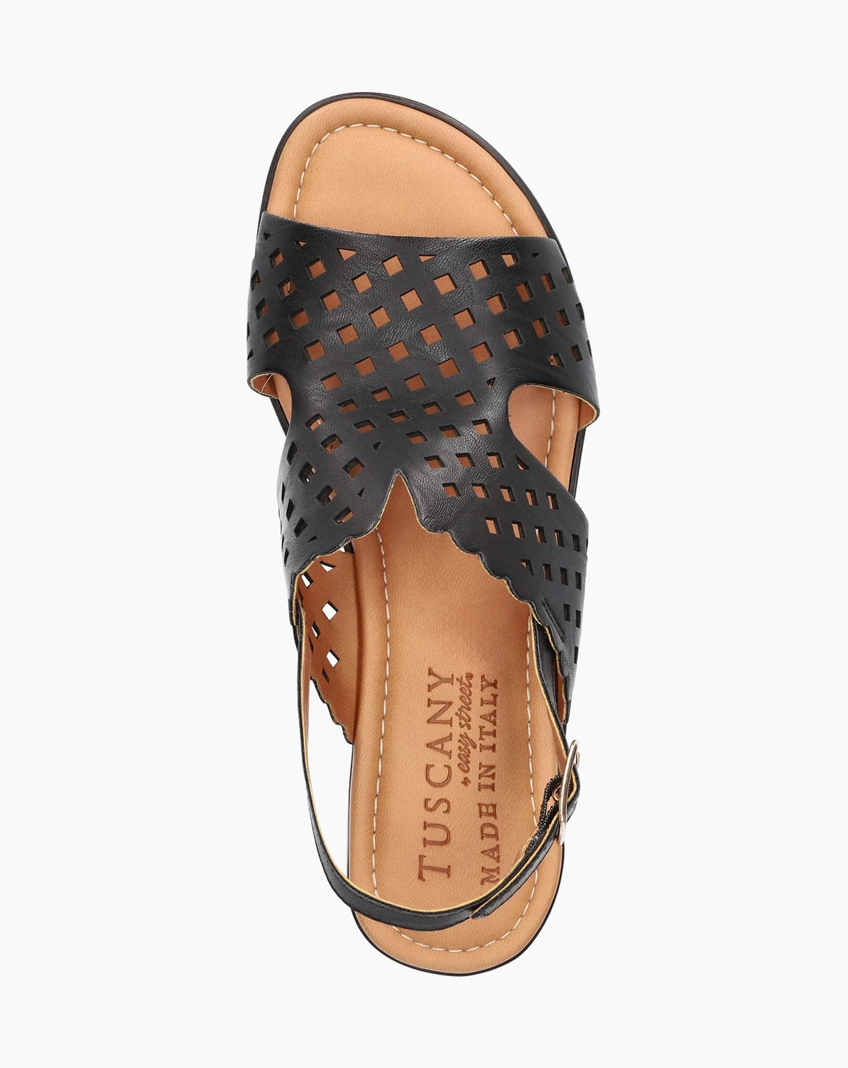 Experience effortless style with the Martella from Tuscany by Easy Street. Italian-made and beautifully crafted, this sandal features a laser-cut upper that brings sophistication to every step. The adjustable slingback provides a custom fit, while the cushioned footbed keeps you comfortable throughout the day. Finished with a lightweight wedge, the Martella is the perfect blend of Italian design and everyday ease.