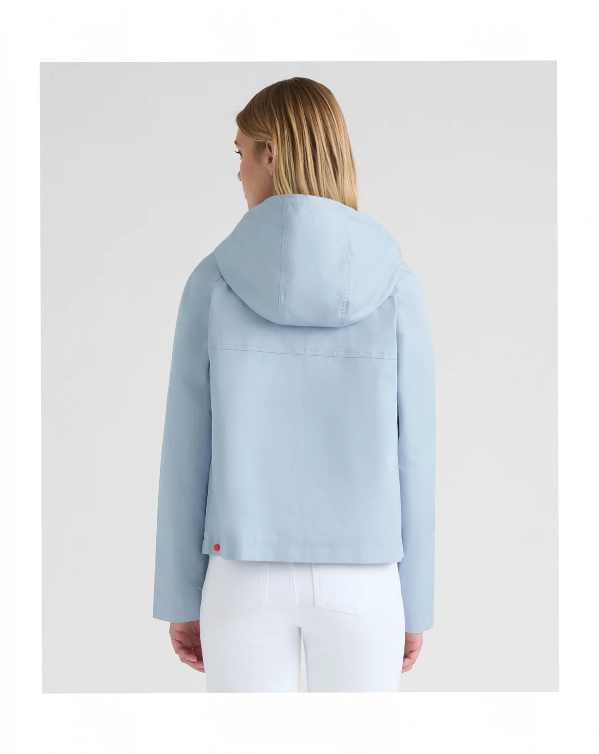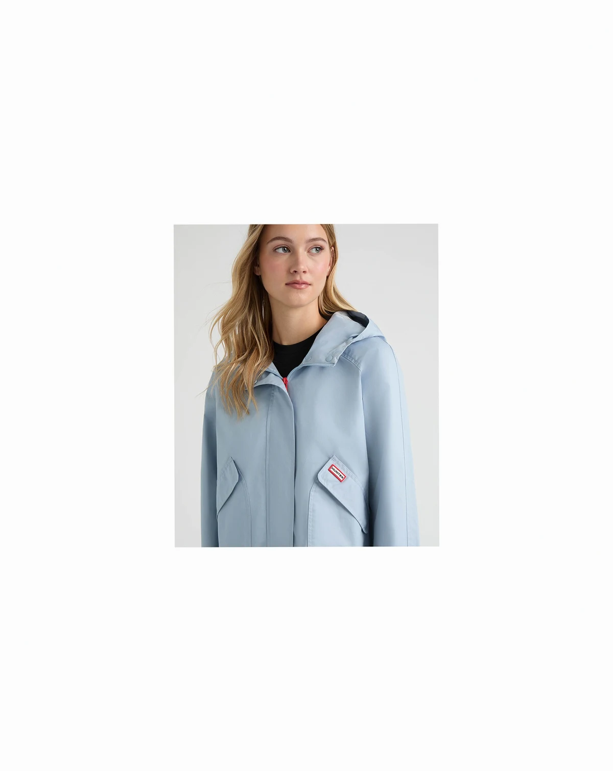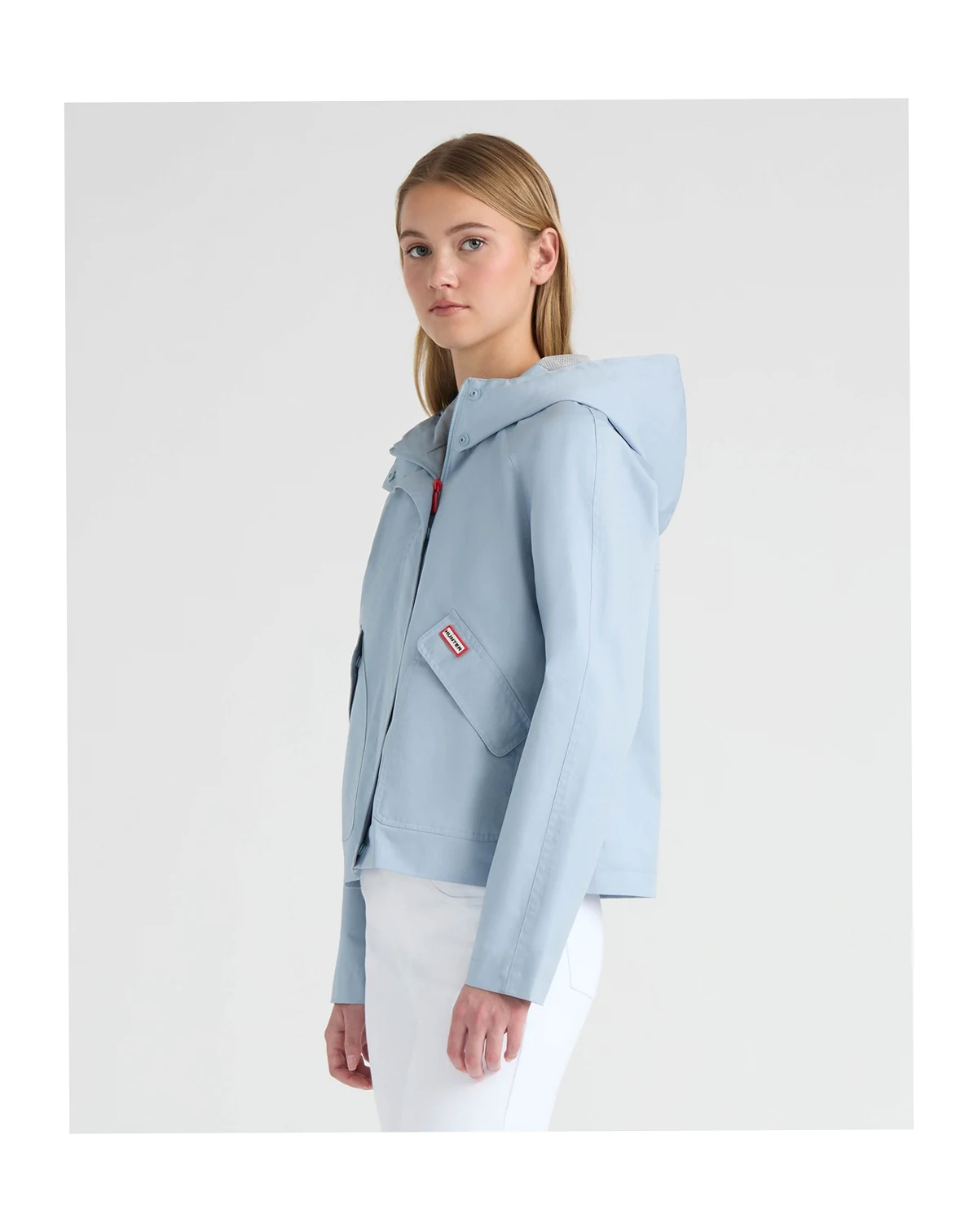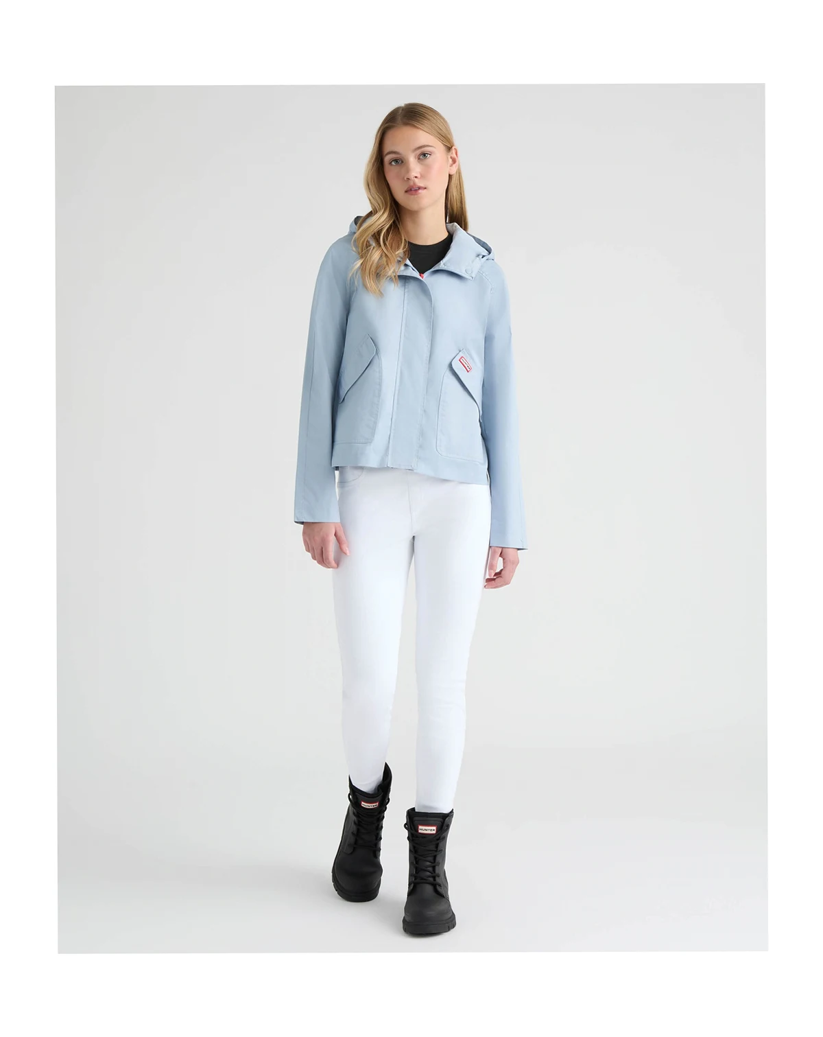 The Hunter Women's Julia Cotton Water Repellent Short Rain Jacket offers a streamlined, practical design for everyday wear. Its fixed hood, front zipper with hidden snap closure, and large patch pockets provide both functionality and style. Accented with a Hunter stitch at the back yoke, it's a lightweight jacket that keeps you polished and protected in wet weather.