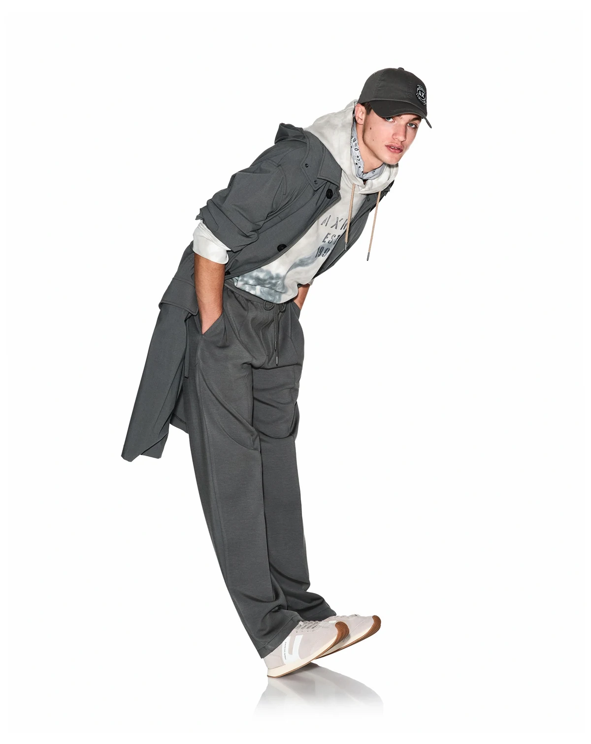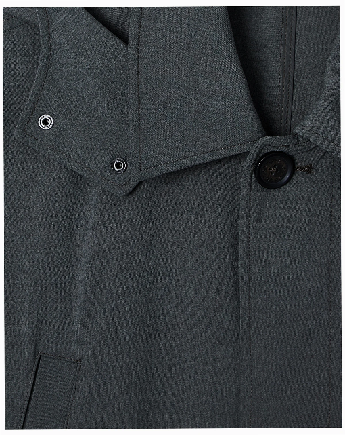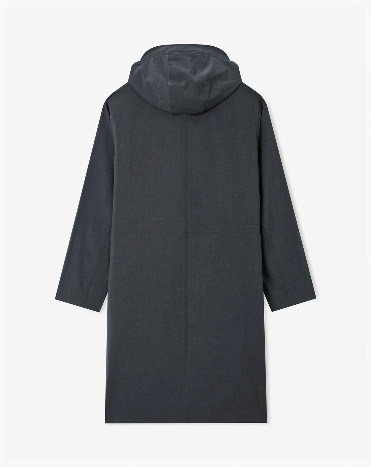 Long trench coat with button front, drawstrings, flap pockets, and ribbed cuffs. Features a detachable hood for versatile styling. A functional and stylish outerwear piece for cooler weather.