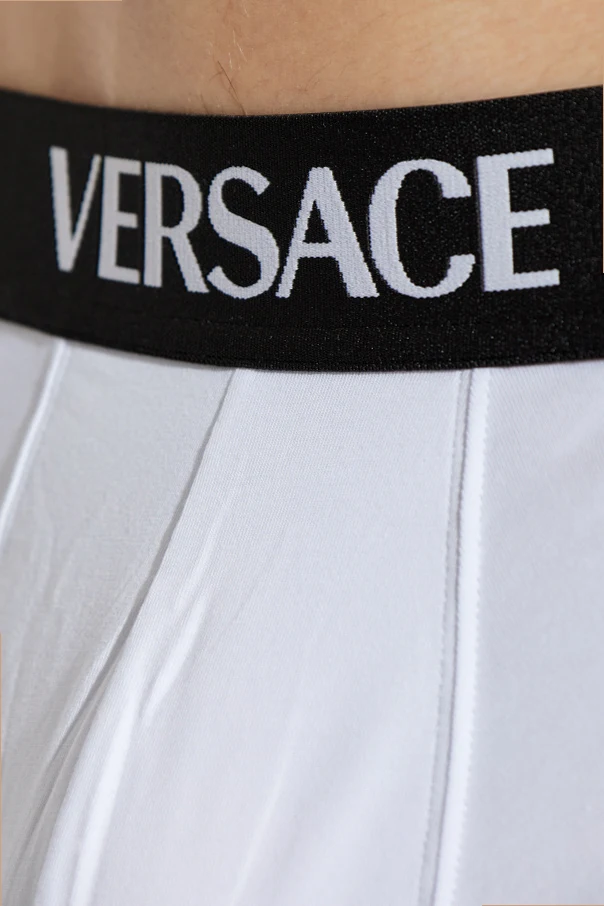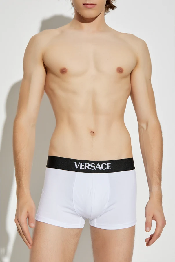 Distinct in their understated elegance, each pair features a smooth, unadorned fabric, accentuated by precise stitching and a signature vertical front seam. The highlight—the bold, contrast VERSACE logo emblazoned on a black, wide elastic waistband—instantly elevates their allure, capturing the spirit of modern luxury.