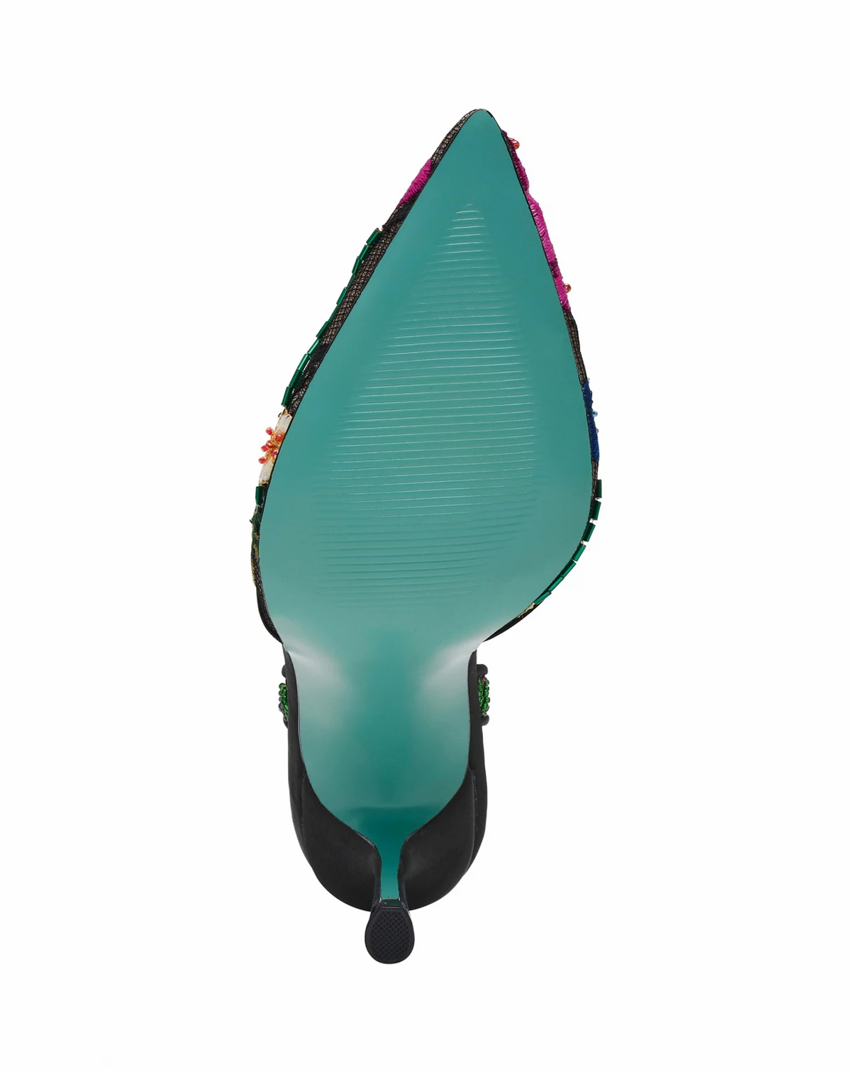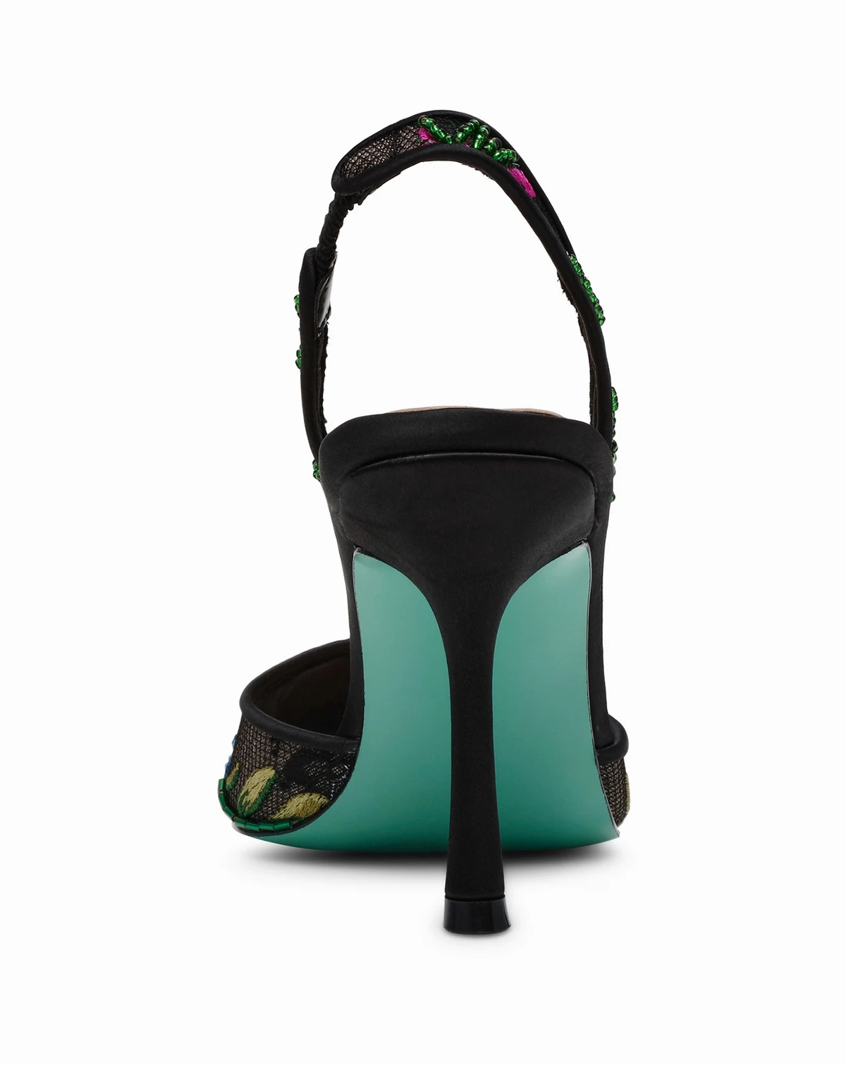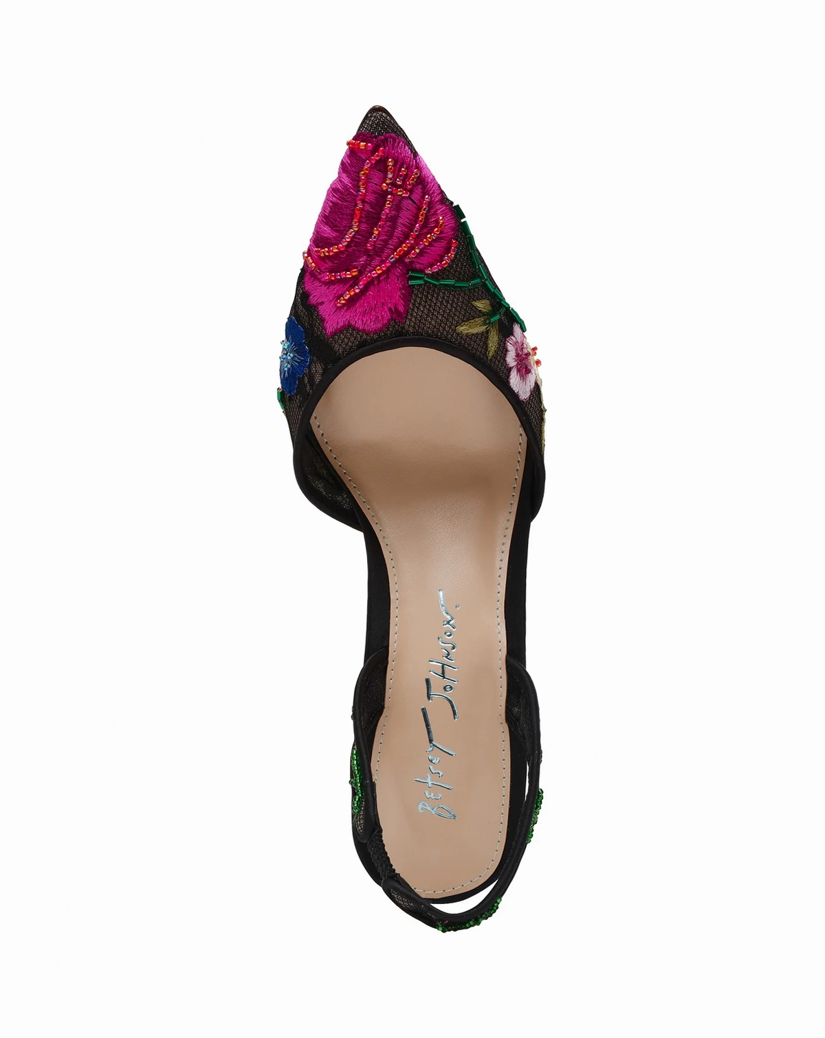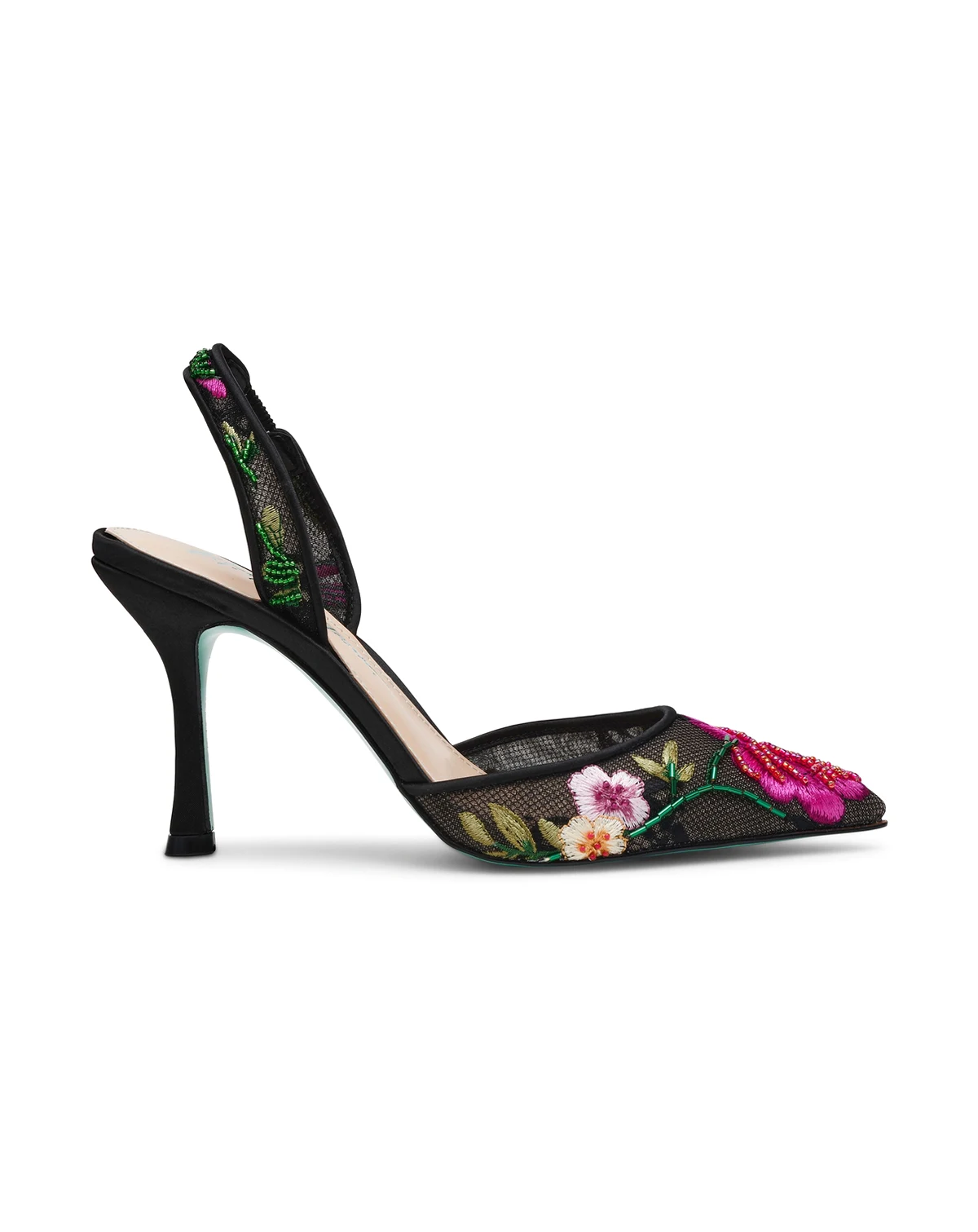 Embroidered florals over sheer mesh create a vibrant, garden-inspired design on these Betsey Johnson April floral pumps. The stiletto heels and slingback add a feminine, elegant touch.