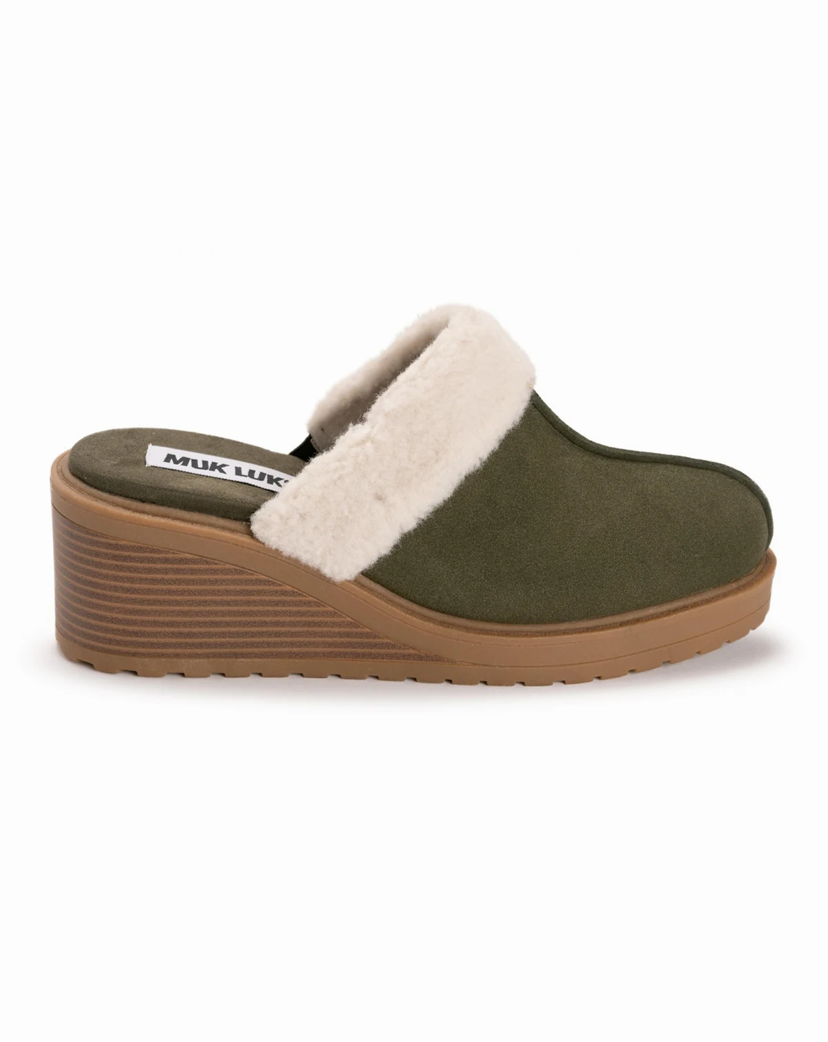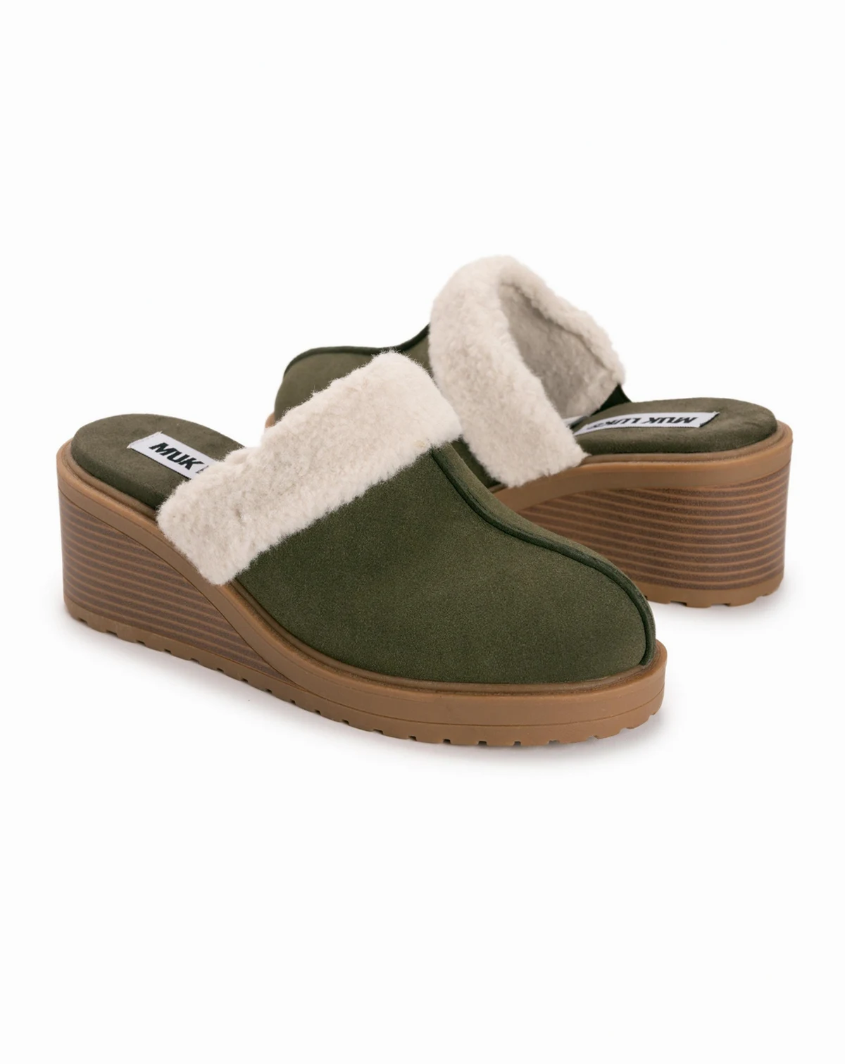 Meet your new Fall footwear: the MUK LUKS Women's Sophia Wedged Mule! With an adorable faux shealing cuff, these mules are as cute as they are cozy. The Memory Sole foam insoles ensure every step feels great for your feet. Elevate your autumn wardrobe with these must-have wedges!