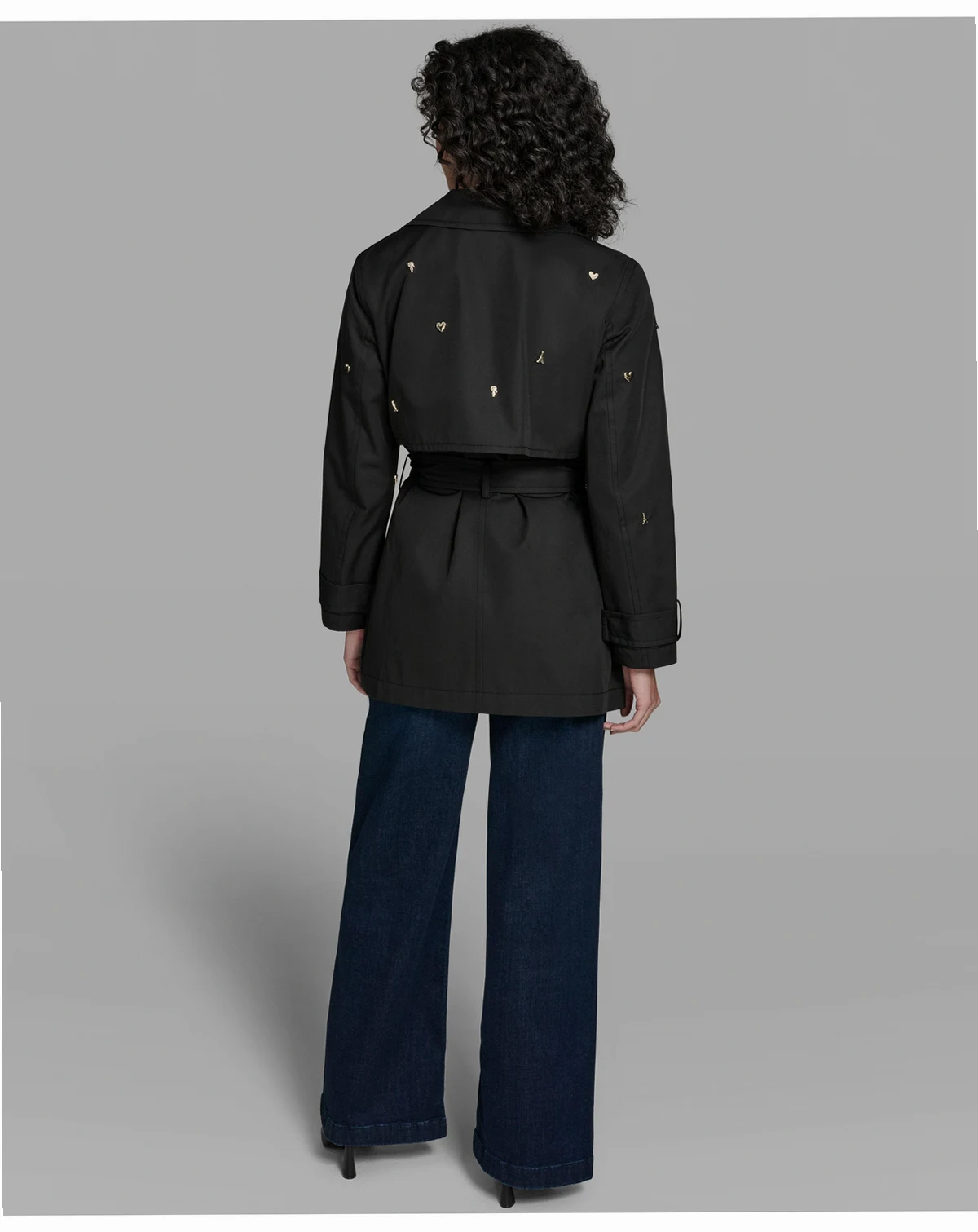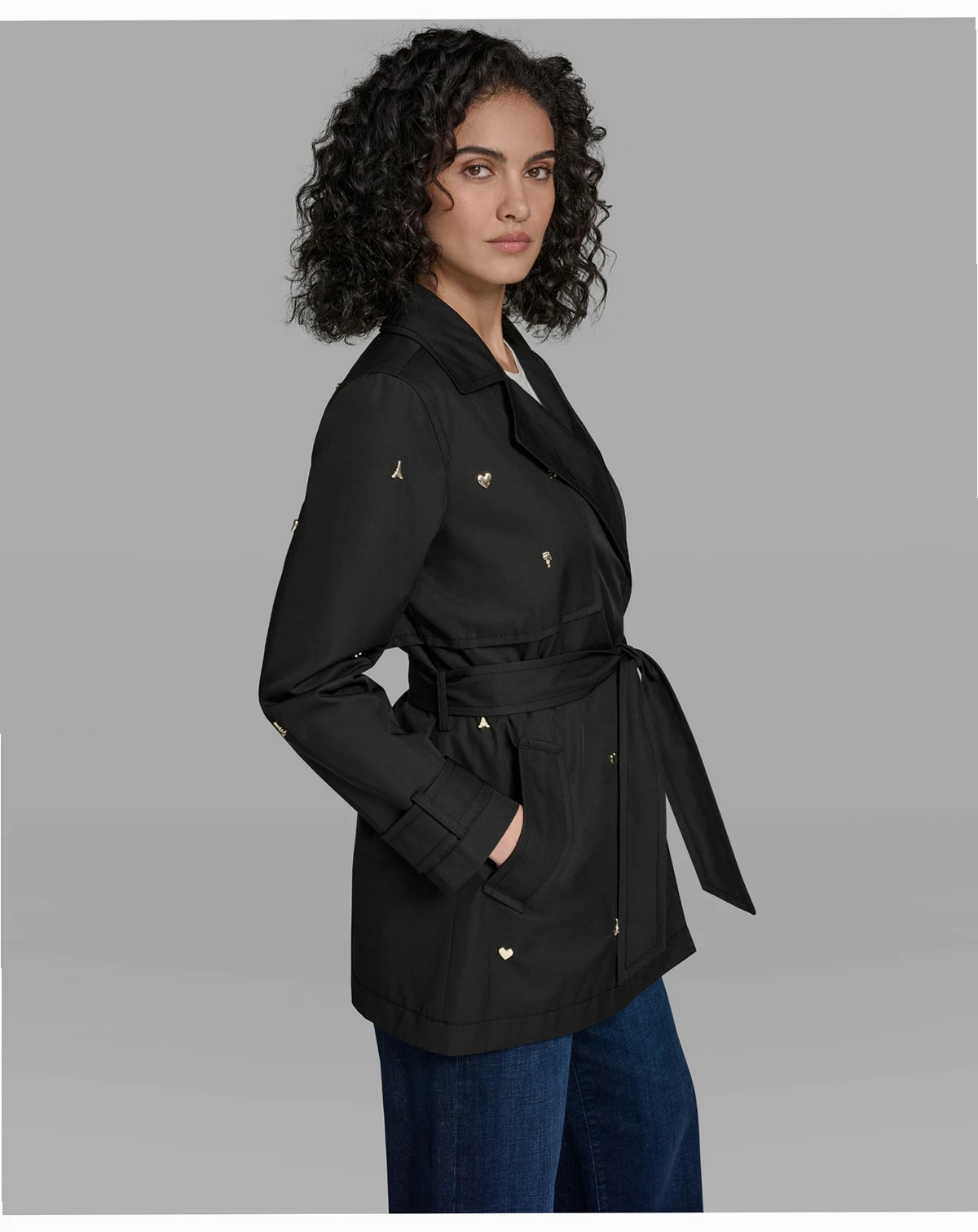 Exude charm and sophistication with the Karl Lagerfeld Paris Double Breasted Studded Trench Coat. Mid-length with flap pockets and cuff tabs, this piece is elevated by a removable belt for styling flexibility. The perfect blend of practicality and polished design.
