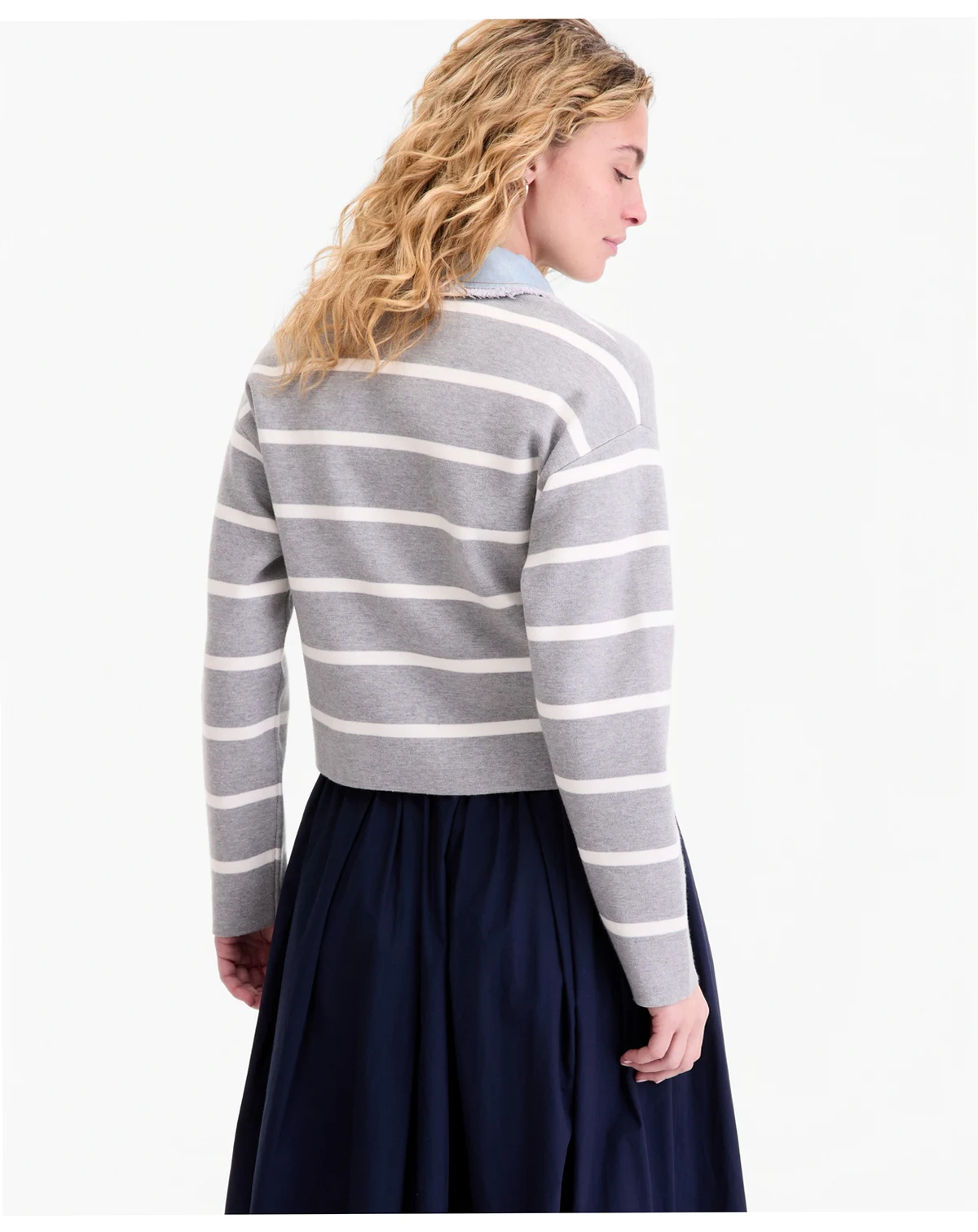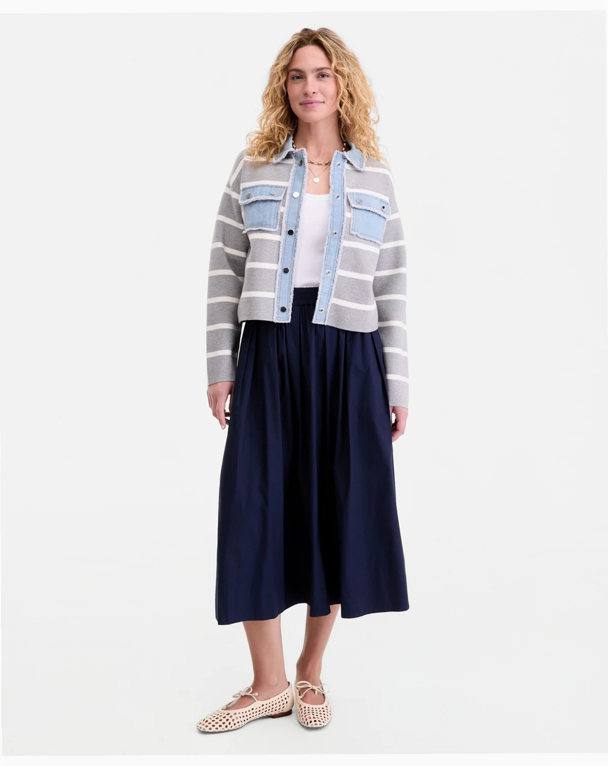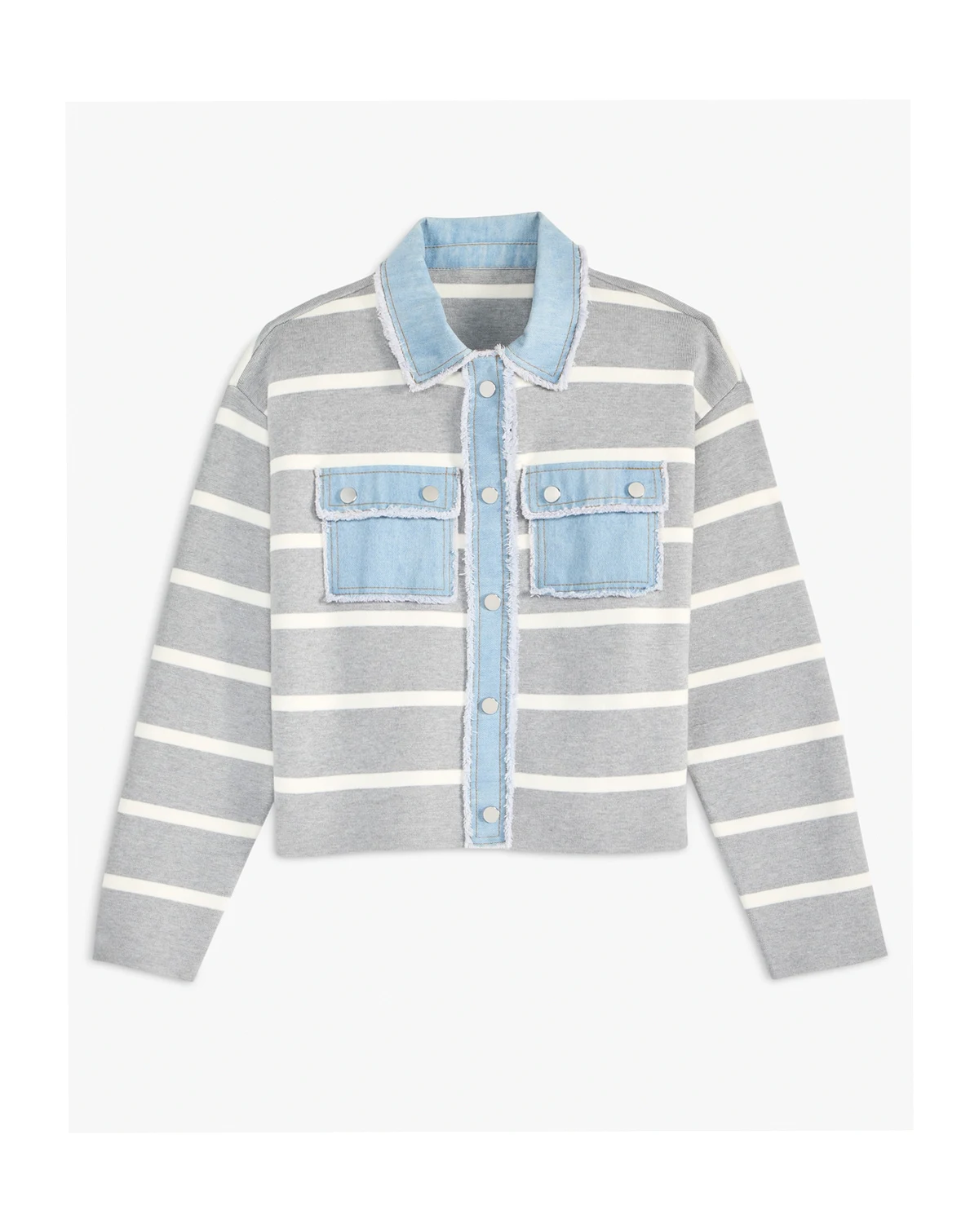 Half sweatshirt, half jacket, our striped topper features cardigan-like details and frayed denim trim. ABOUT THE BRAND: On 34th was designed for and with women like you. Made for your body, your style, and your truth. As your wardrobe's BFF, these mix-and-match pieces work with everything in your closet.