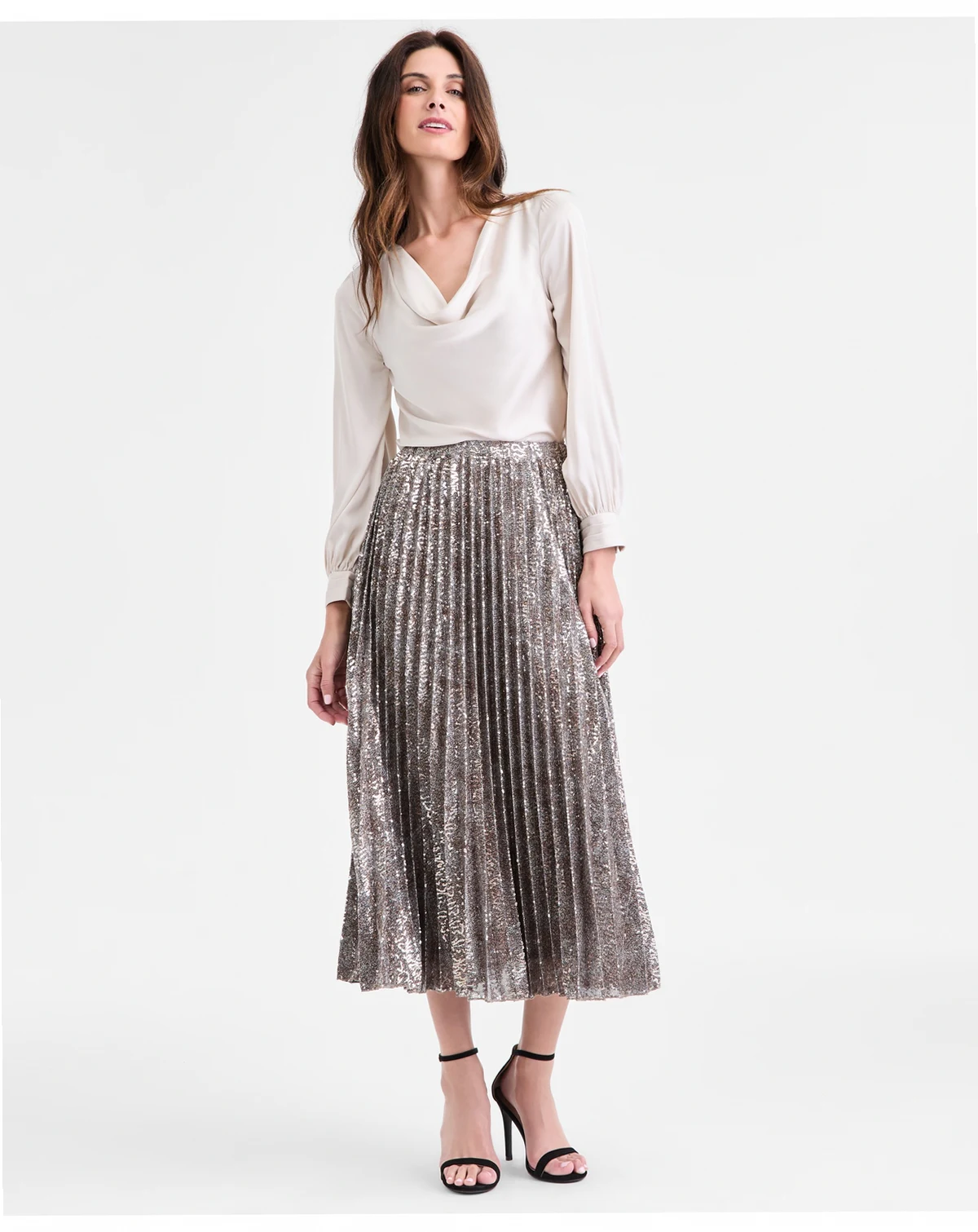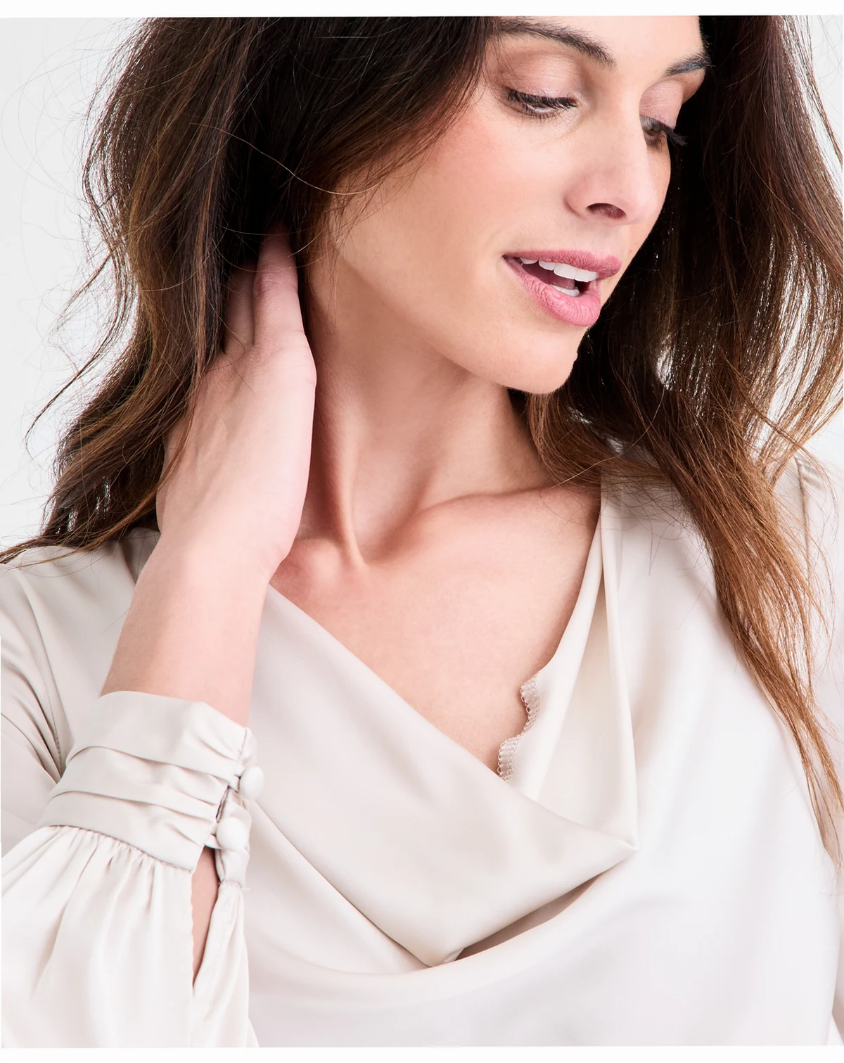 Instant elegance happens when you pull on this petite top from Anne Klein, featuring soft lines, pleated cuffs and a draped neck.