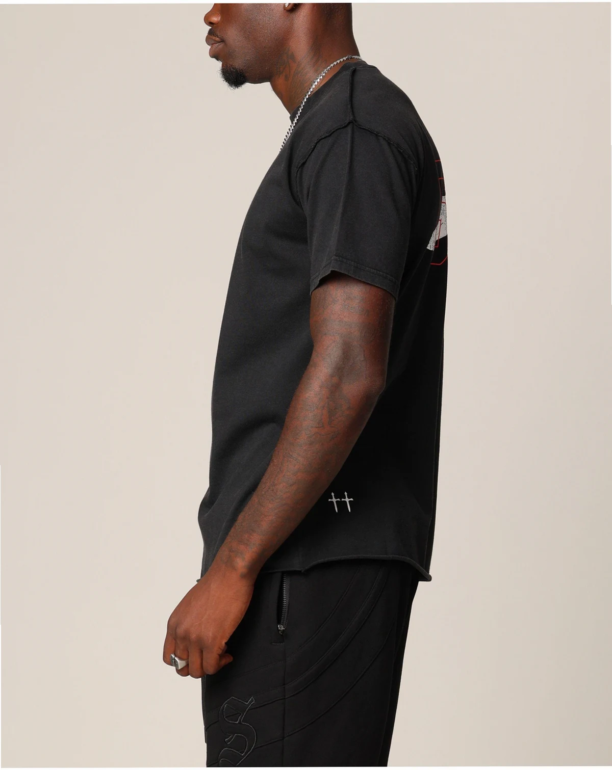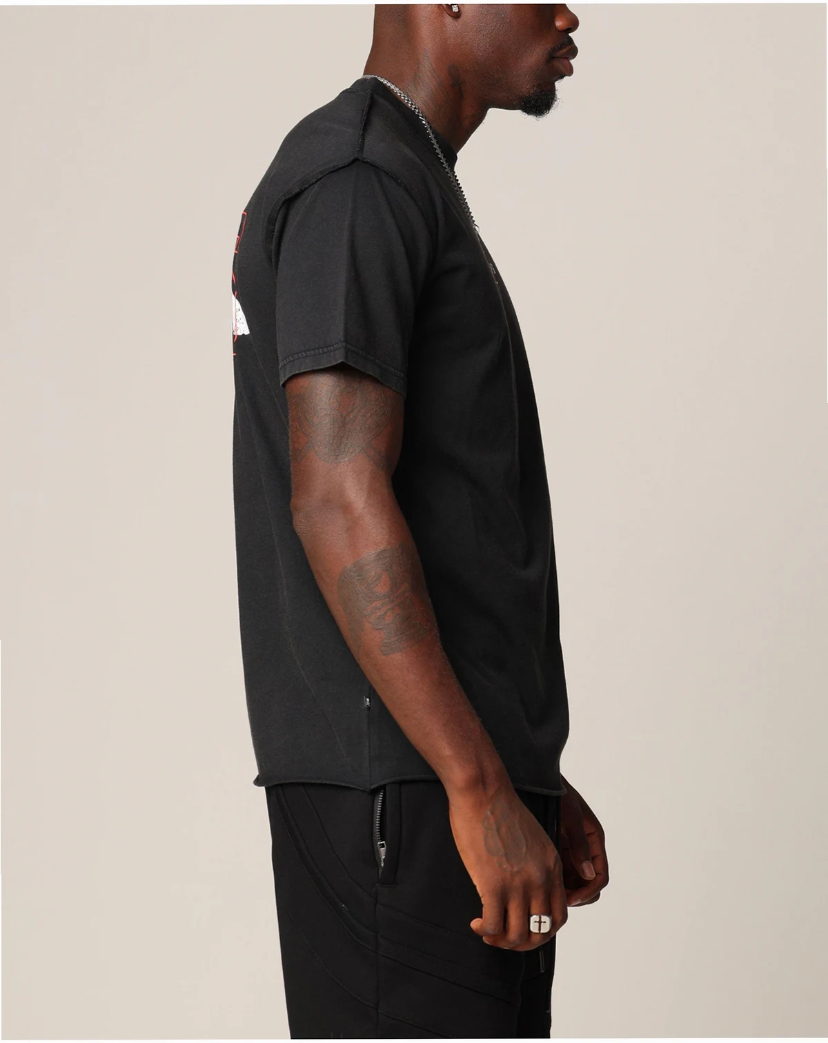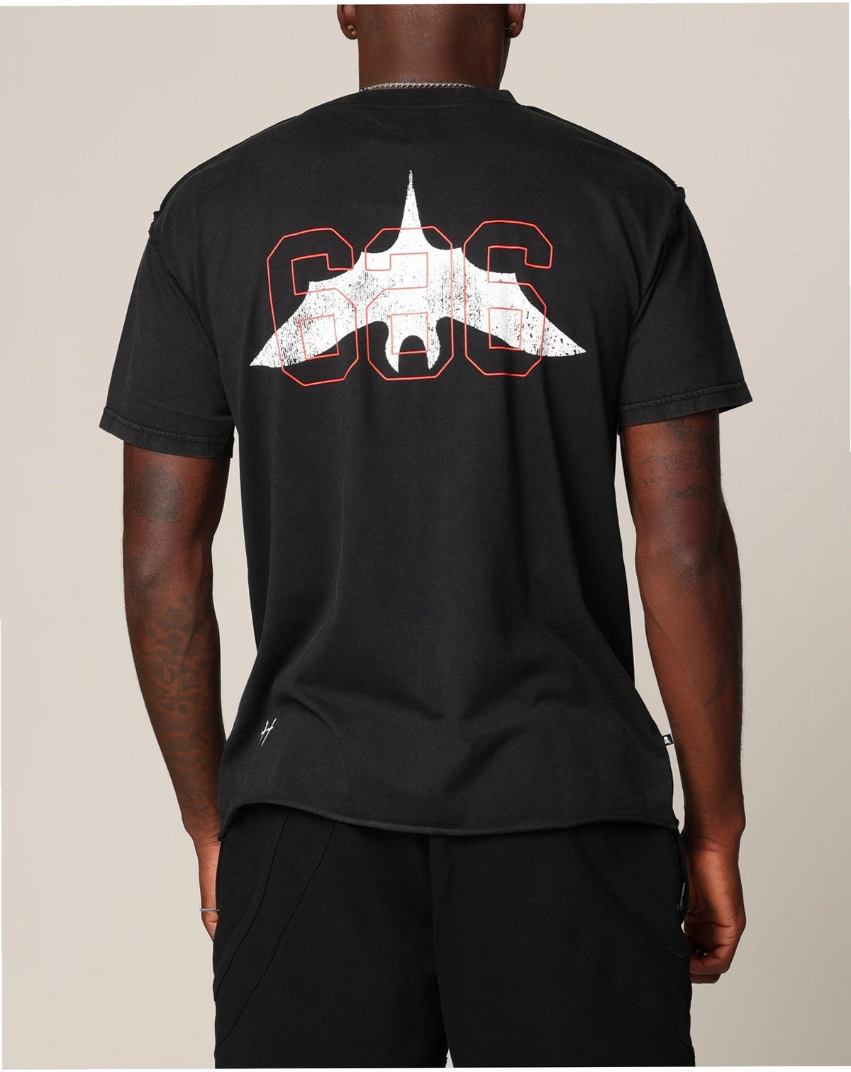 Created to give you all the edge, the 666 Cut tee features custom printed graphics, exposed stitching along the shoulders and a raw hem.