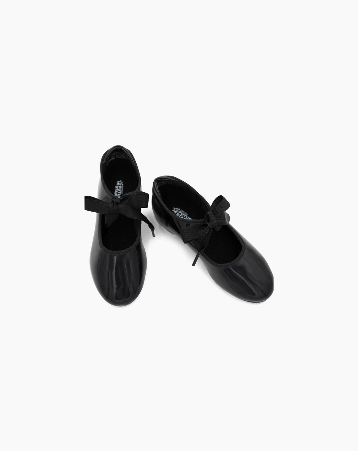 Let your child tap into their potential with Capezio's Future Star Tap Shoe. Available in PU (CAR) or PVC (PAT) upper options, these shoes are designed for both style and durability. Equipped with toe and heel taps, they deliver a clear, crisp sound, while the scored rubber non-skid pad ensures secure footing. The moisture-absorbent brushed microfiber lining keeps feet dry, and the padded collar with Achilles notch provides lasting comfort. A grosgrain ribbon tie adds a classic touch, and the elastic-attached eyebrows offer a snug fit. With a 3/4" heel height, these tap shoes are perfect for beginner dancers.