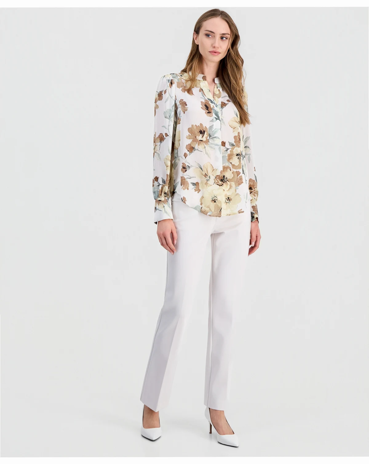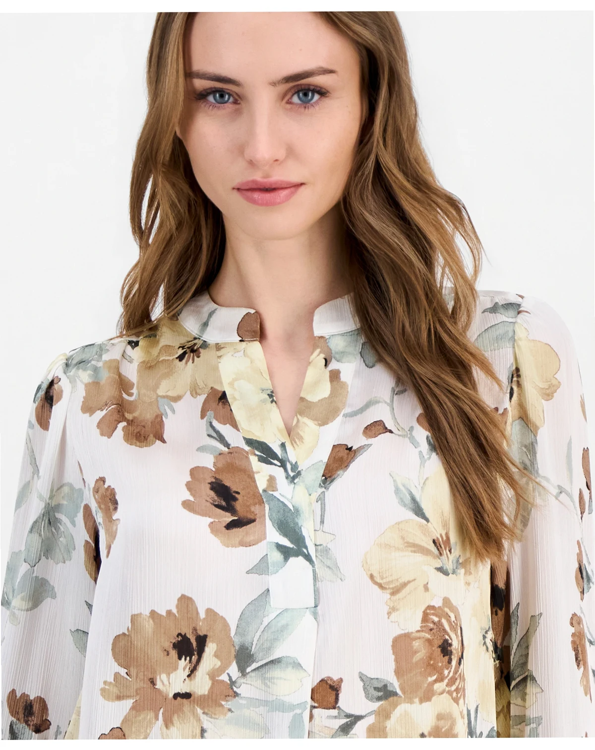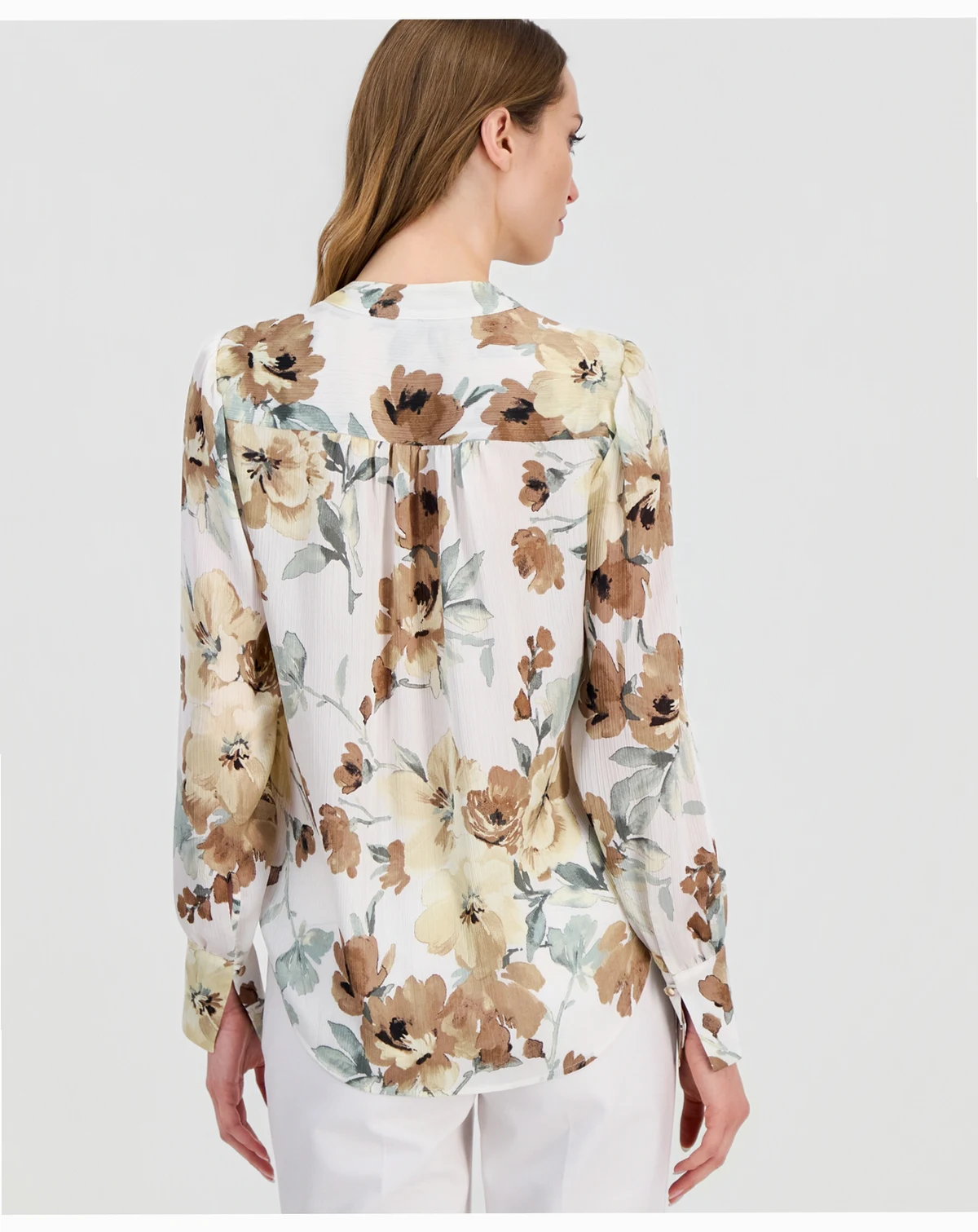 Take on a fresh new feel in this pretty floral blouse from Anne Klein designed with tiny pleats throughout.