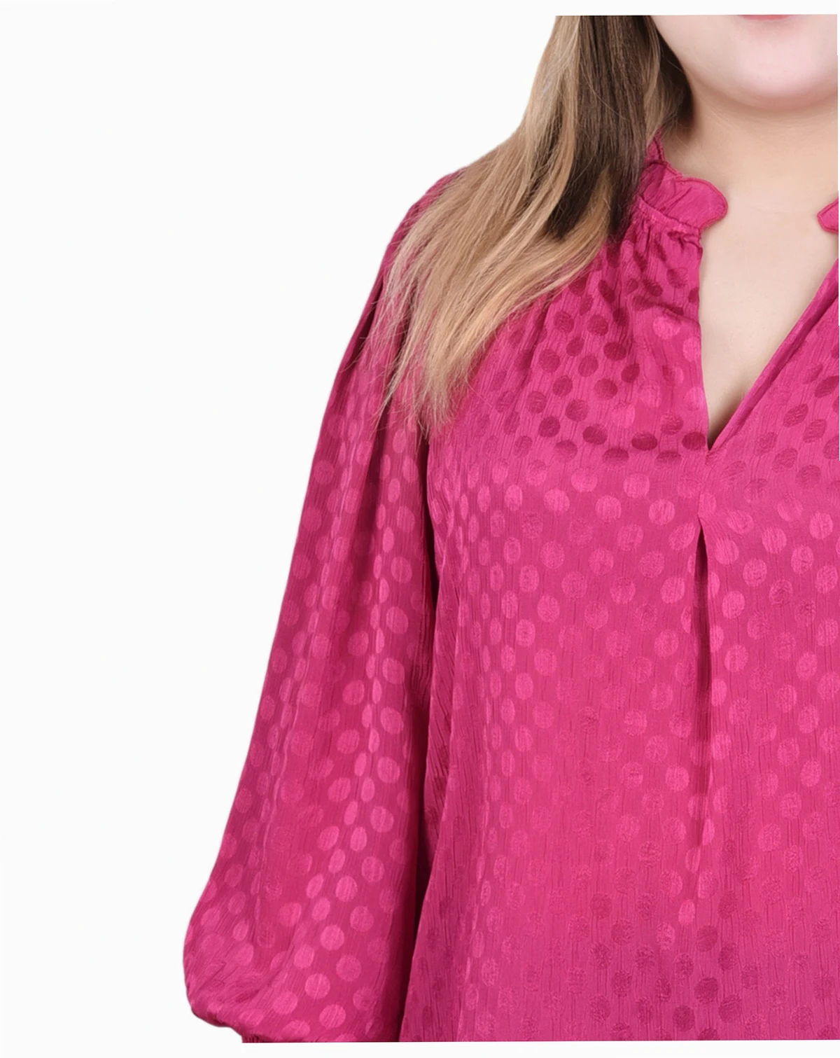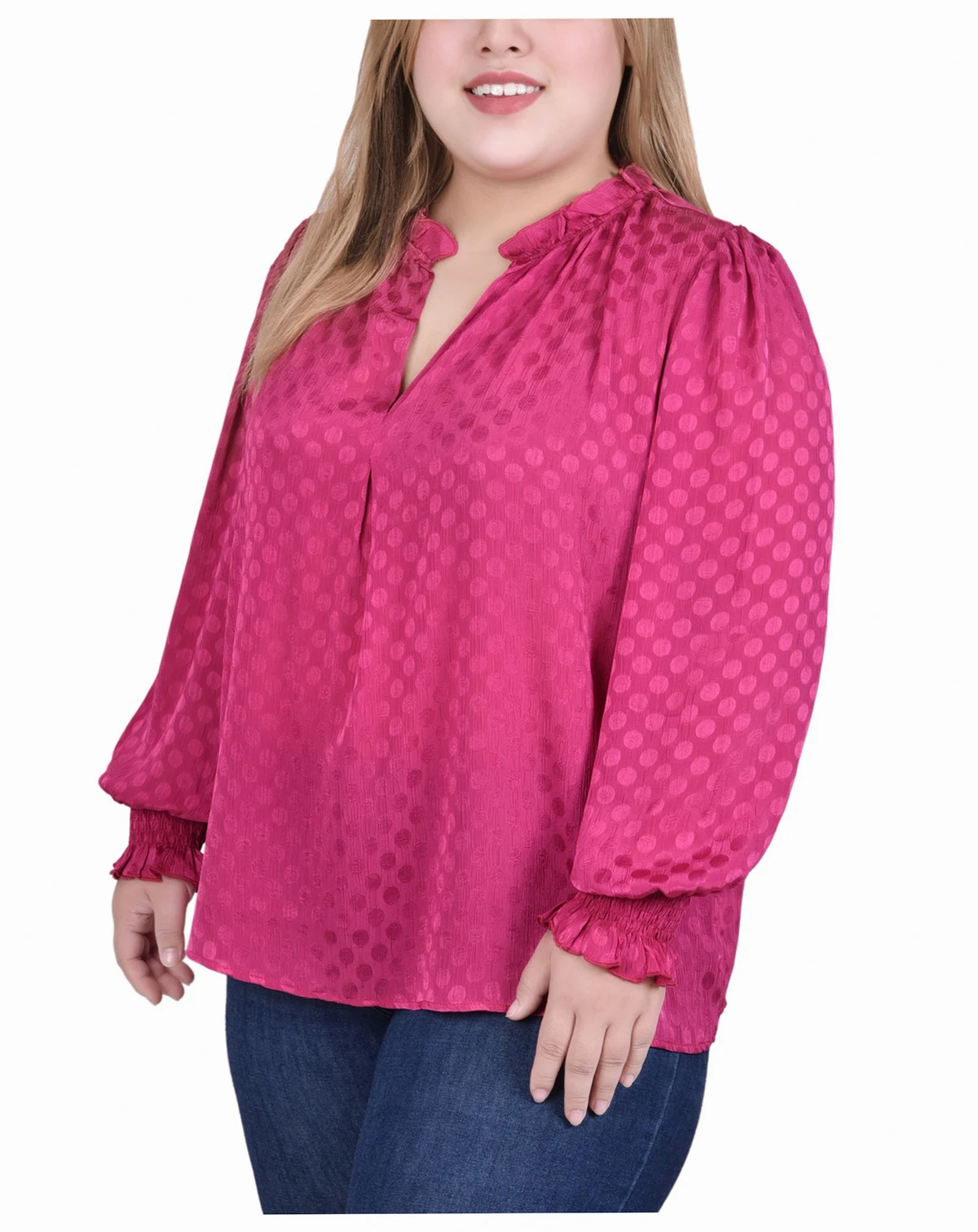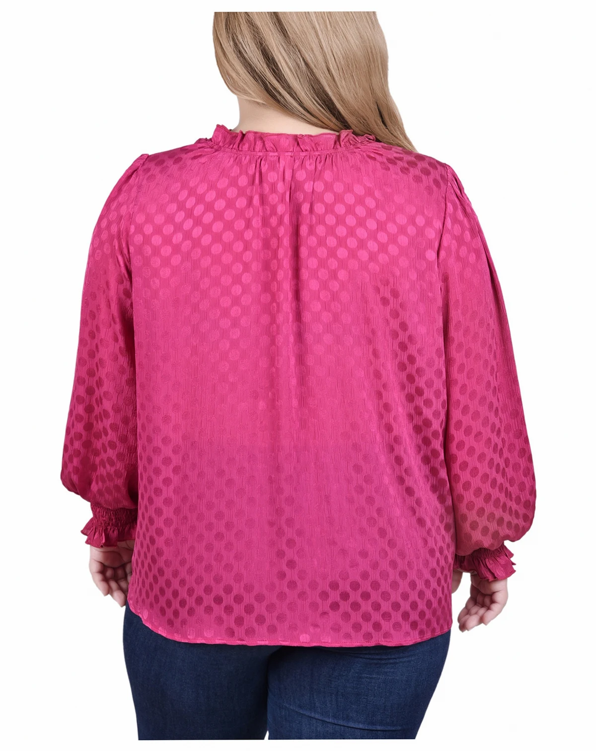 Whether heading to the office or to that special occasion, this satin dotted blouse from NY Collection will be the perfect addition to your outfit. The long sleeves feature smocked cuffs. The neckline has a pleated mock collar to highlight your face.