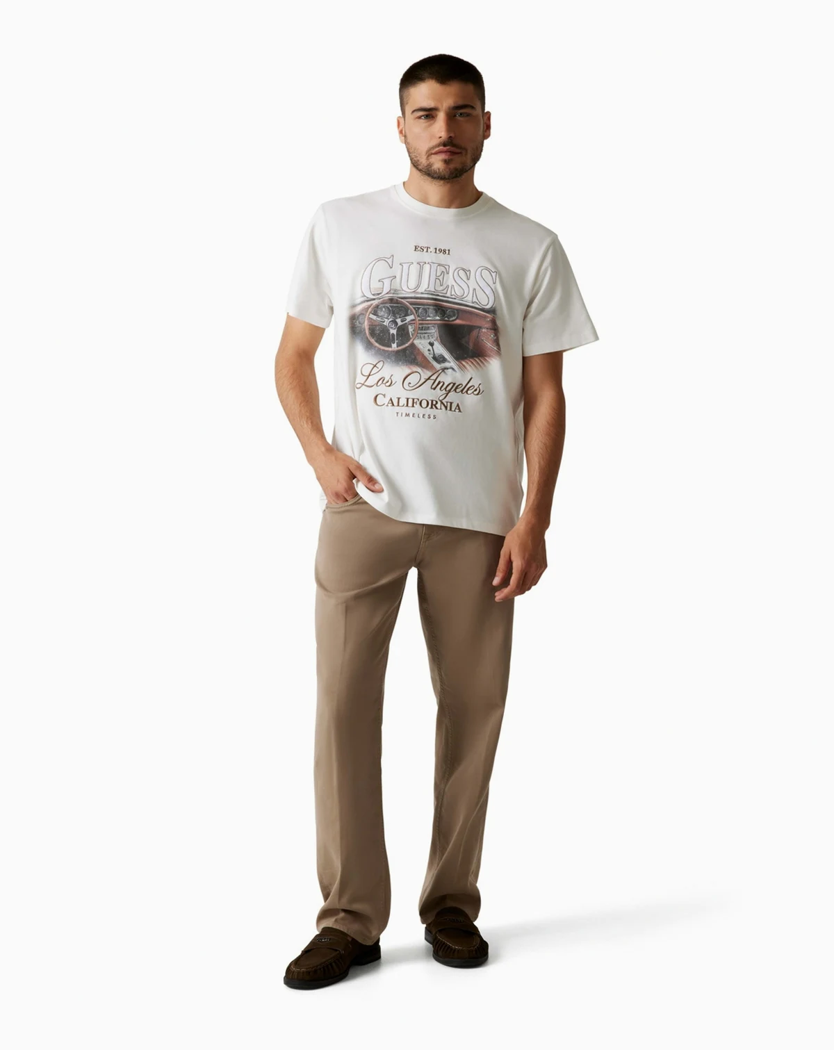 Channel vintage California vibes with this GUESS T-shirt, featuring a retro-inspired steering wheel and dashboard graphic. Bold lettering completes its homage to West Coast style.