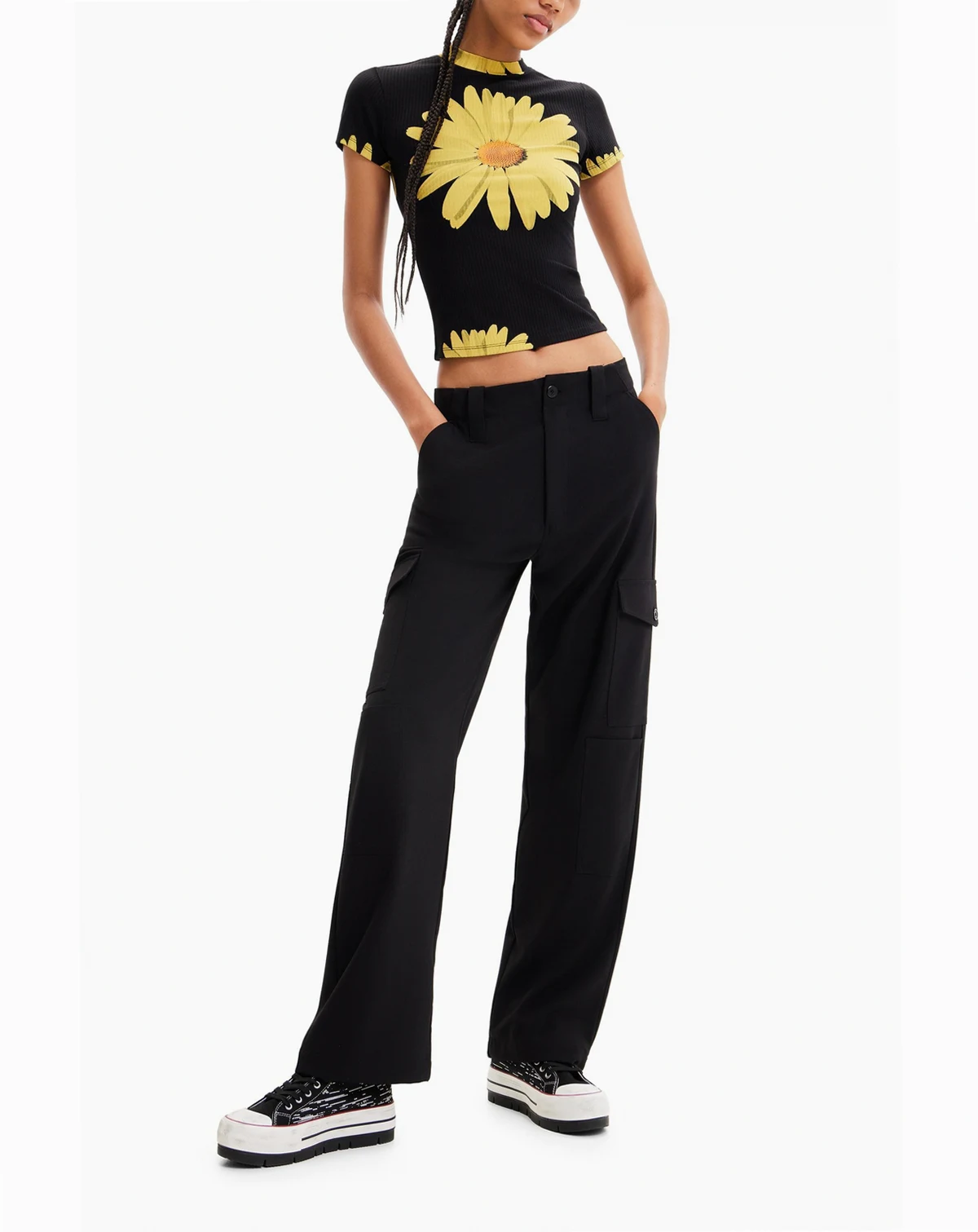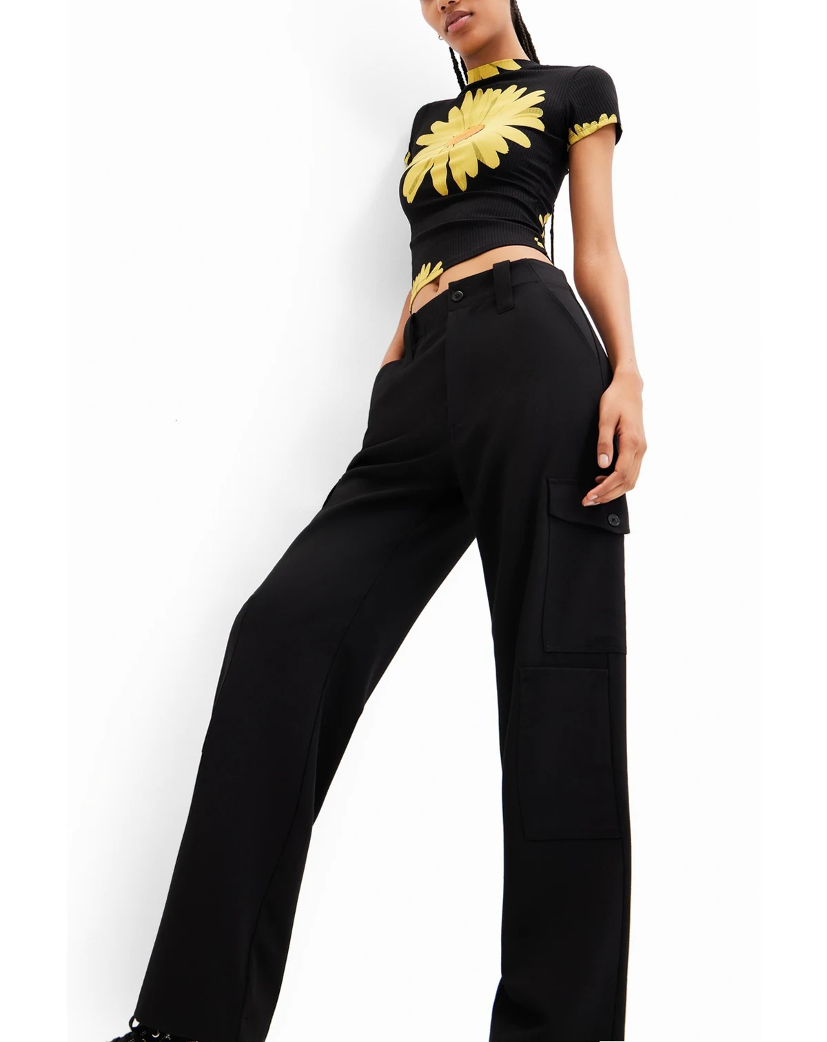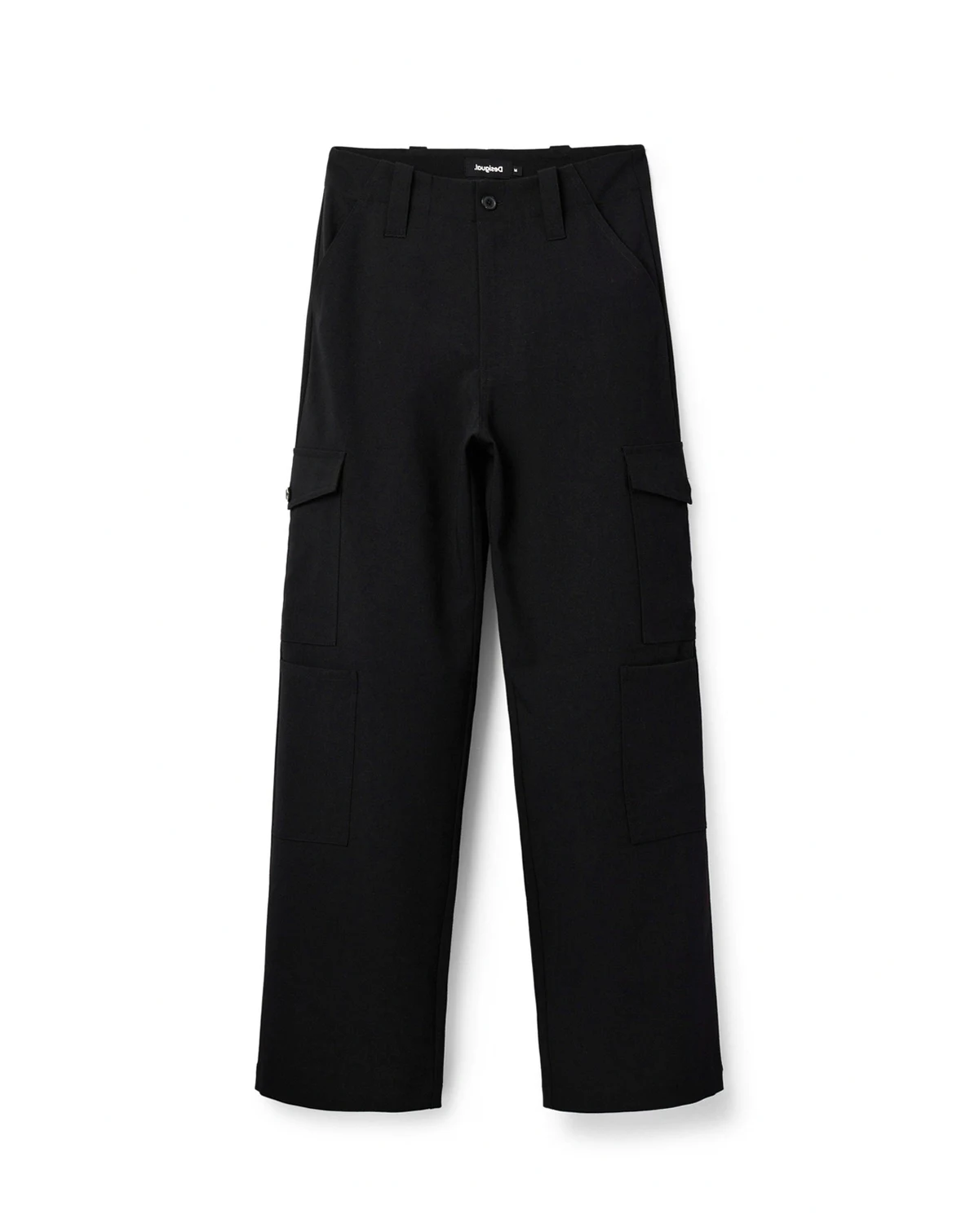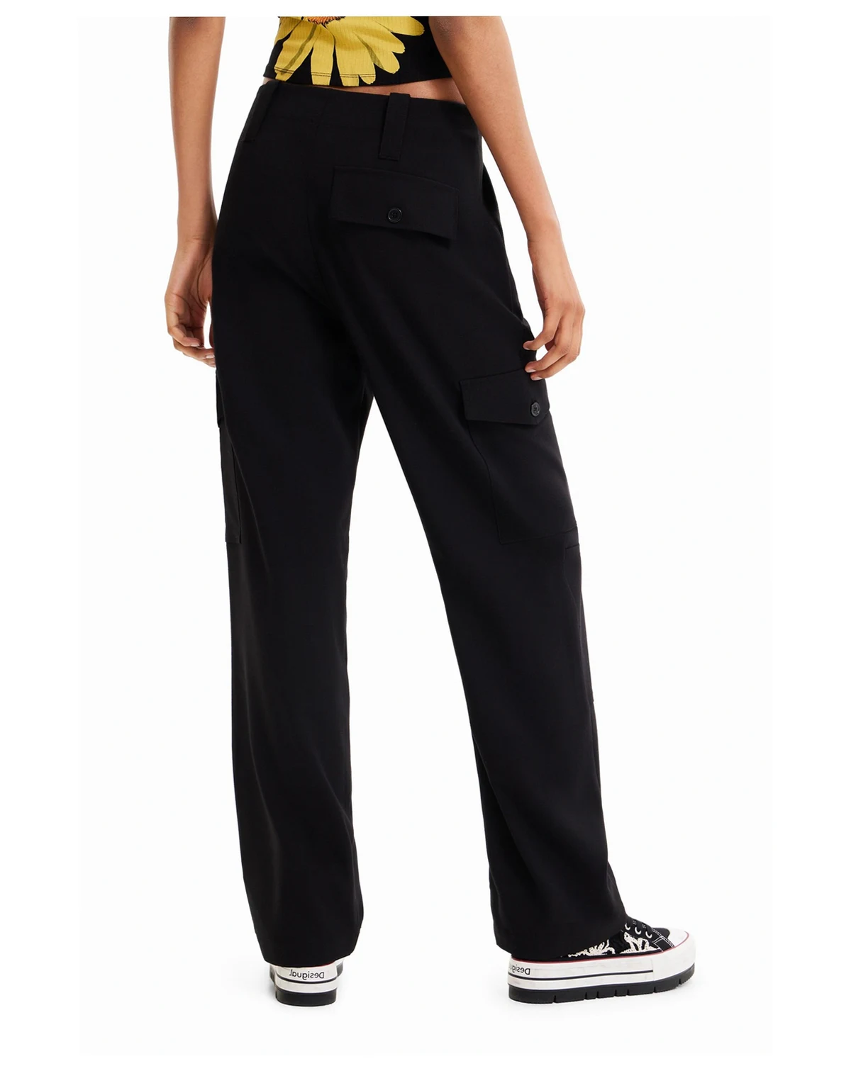 High-waisted, long, flowing trousers with cargo-style pockets.