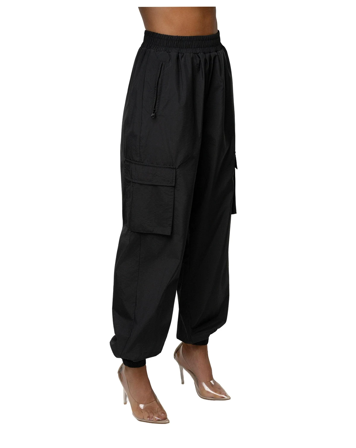 Meet your new essential for on-the-go style with our Endure Jogger. Designed for ultimate versatility, these high-waist joggers feature a smocked elastic waistband and matching cuffed ankles, creating a relaxed, tapered silhouette that moves with you. Crafted from a lightweight fabric, these joggers come with side zipper pockets and functional cargo pockets offering a touch of utilitarian style. Stretchy. Single lined.