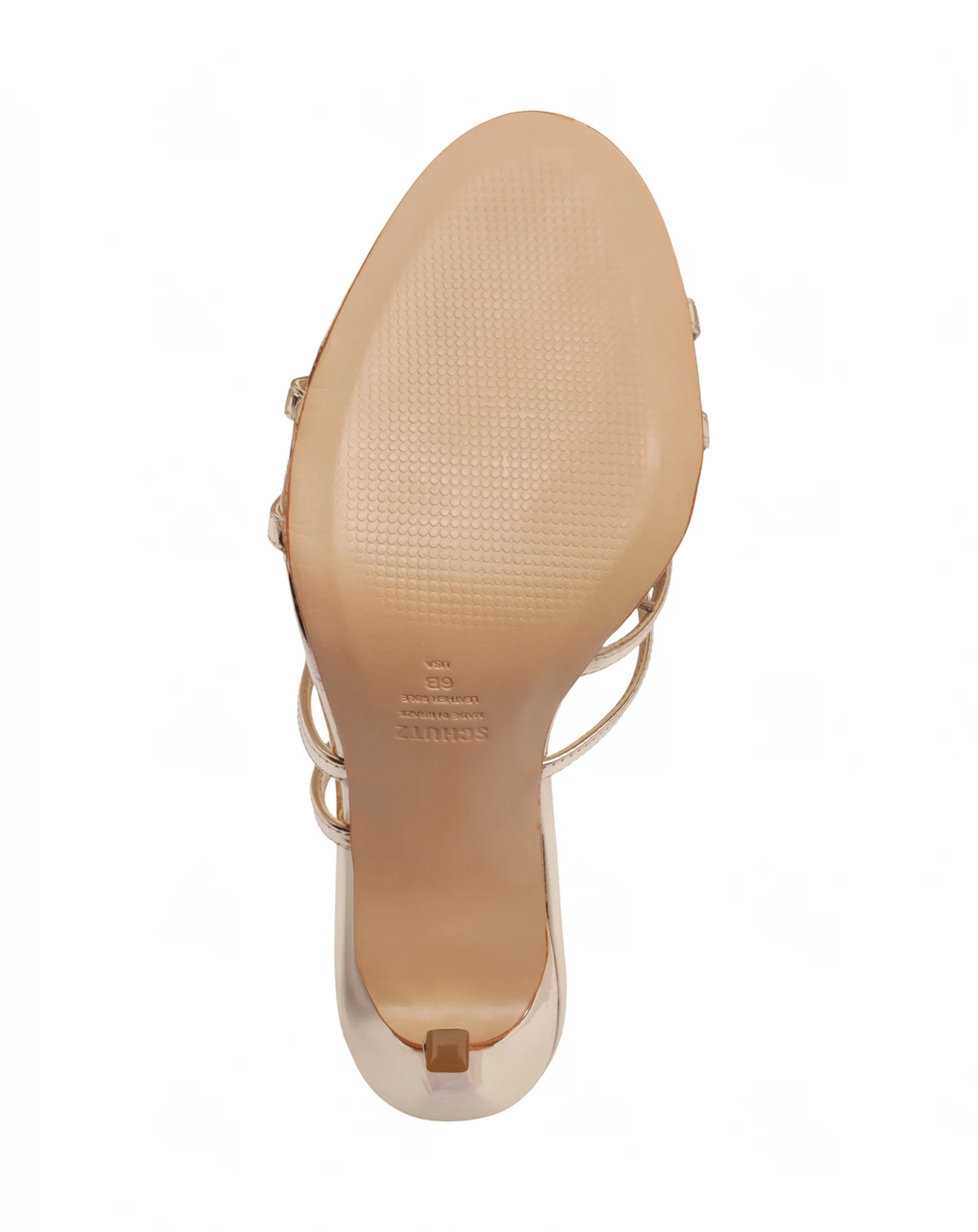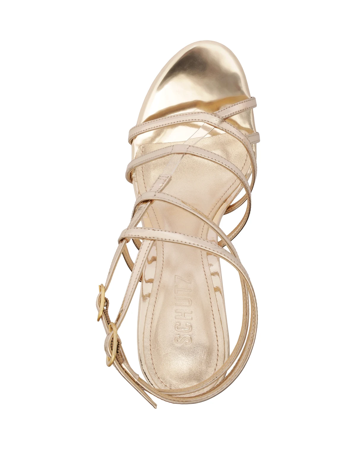A black strappy high-heel sandal with a sleek and glossy finish. It features thin crisscross straps around the ankle, complemented by a clear front strap. The design is completed with a slim stiletto heel, giving it a modern and elegant look.