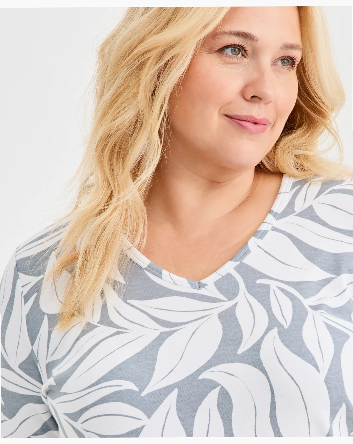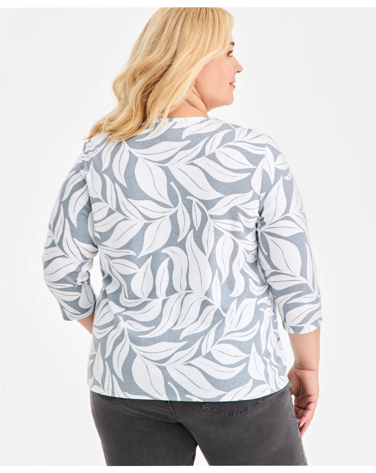 A pop of print refreshes the comfortable knit shape of this plus size 3/4-sleeve knit top from Style & Co.
