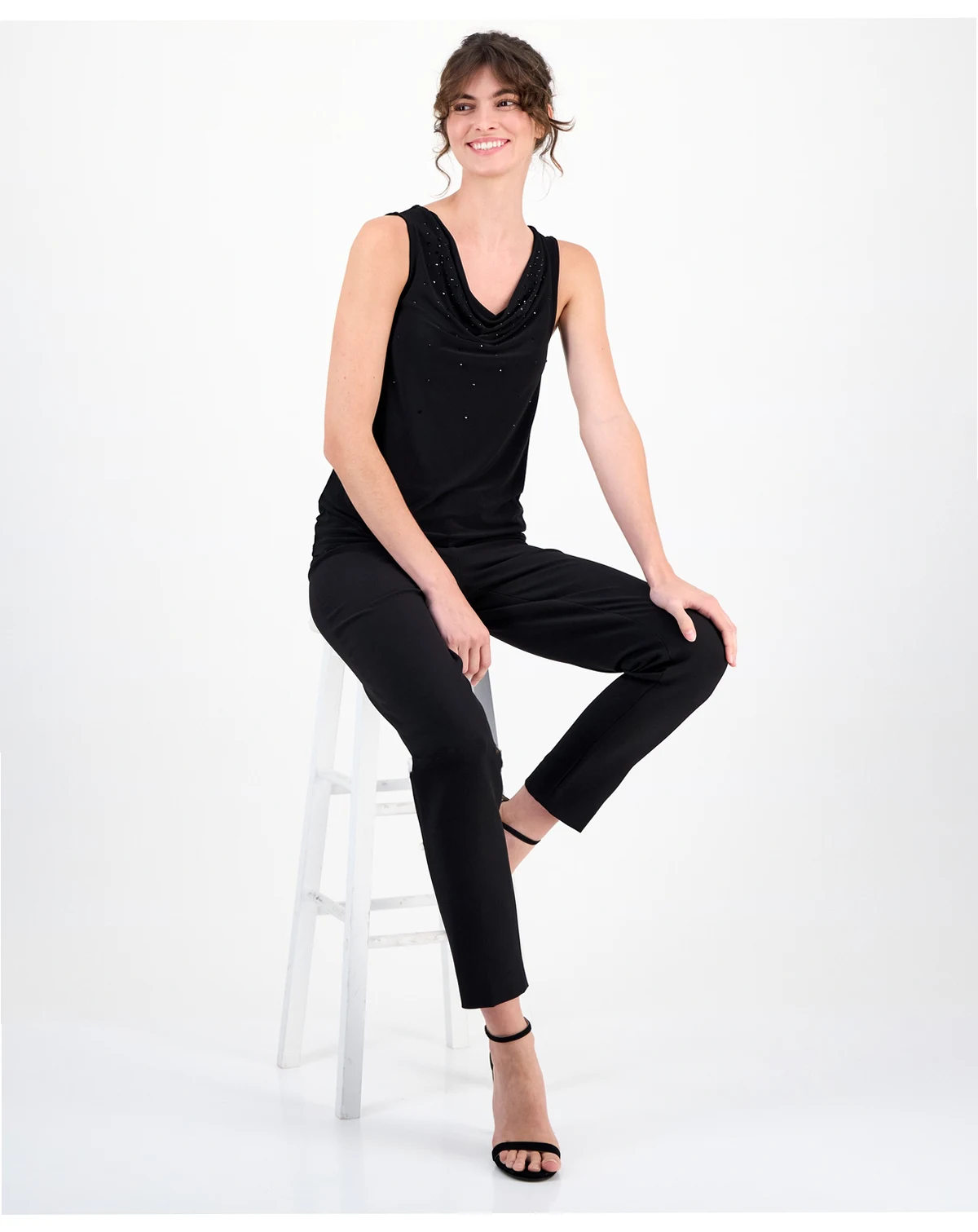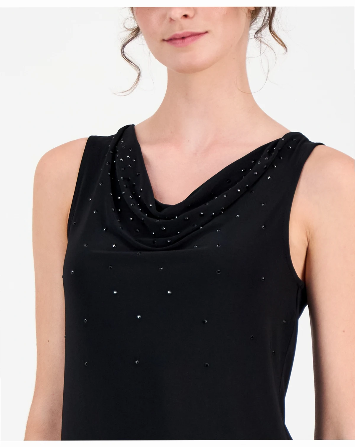 Subtle tonal stones stud the front of this flattering cowlneck tank from Anne Klein. Wear it alone or style it with a structured jacket on top.