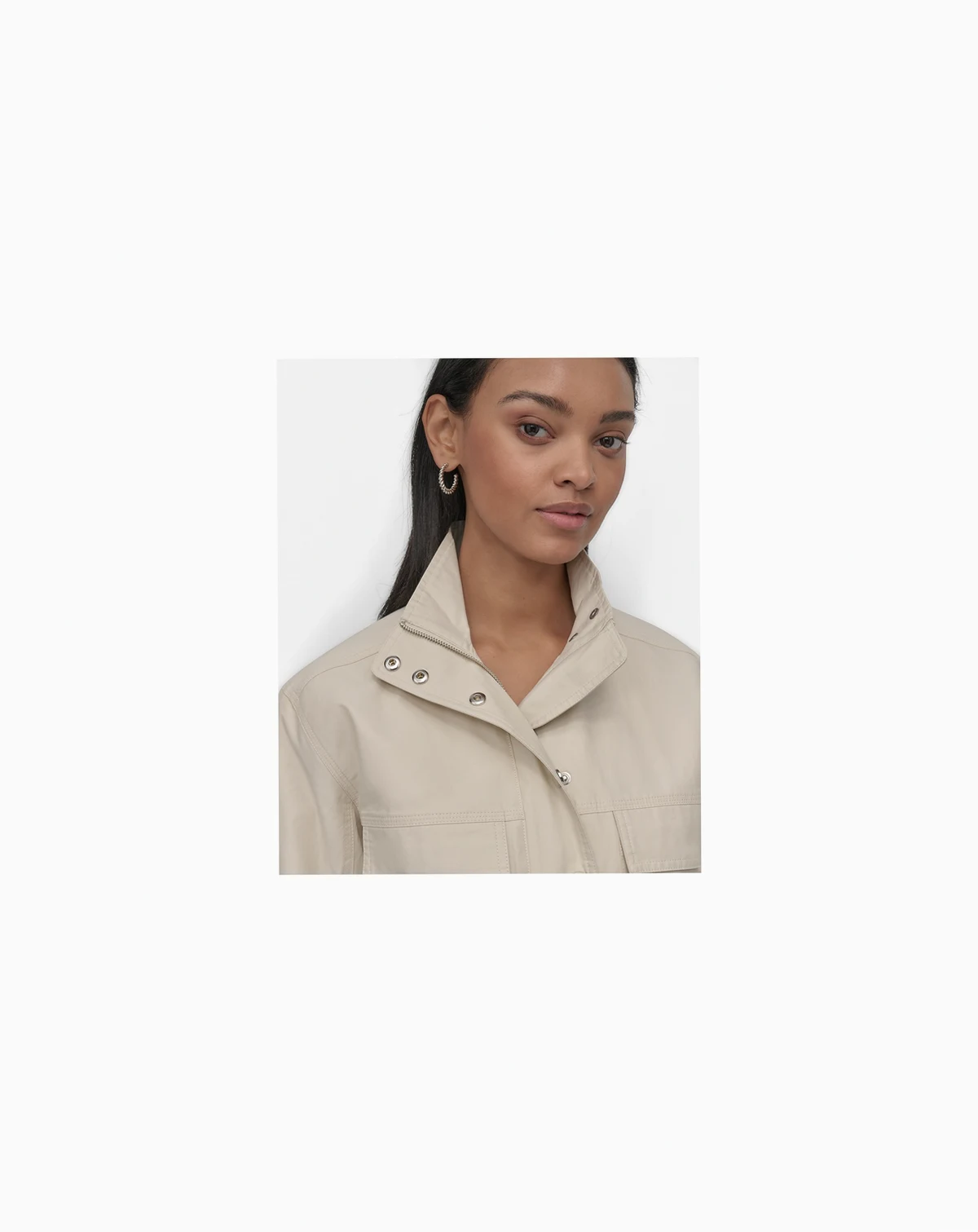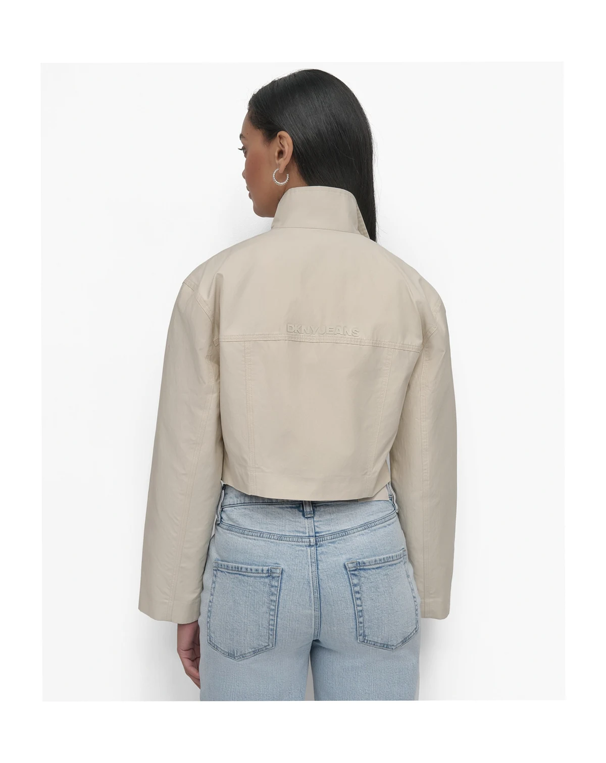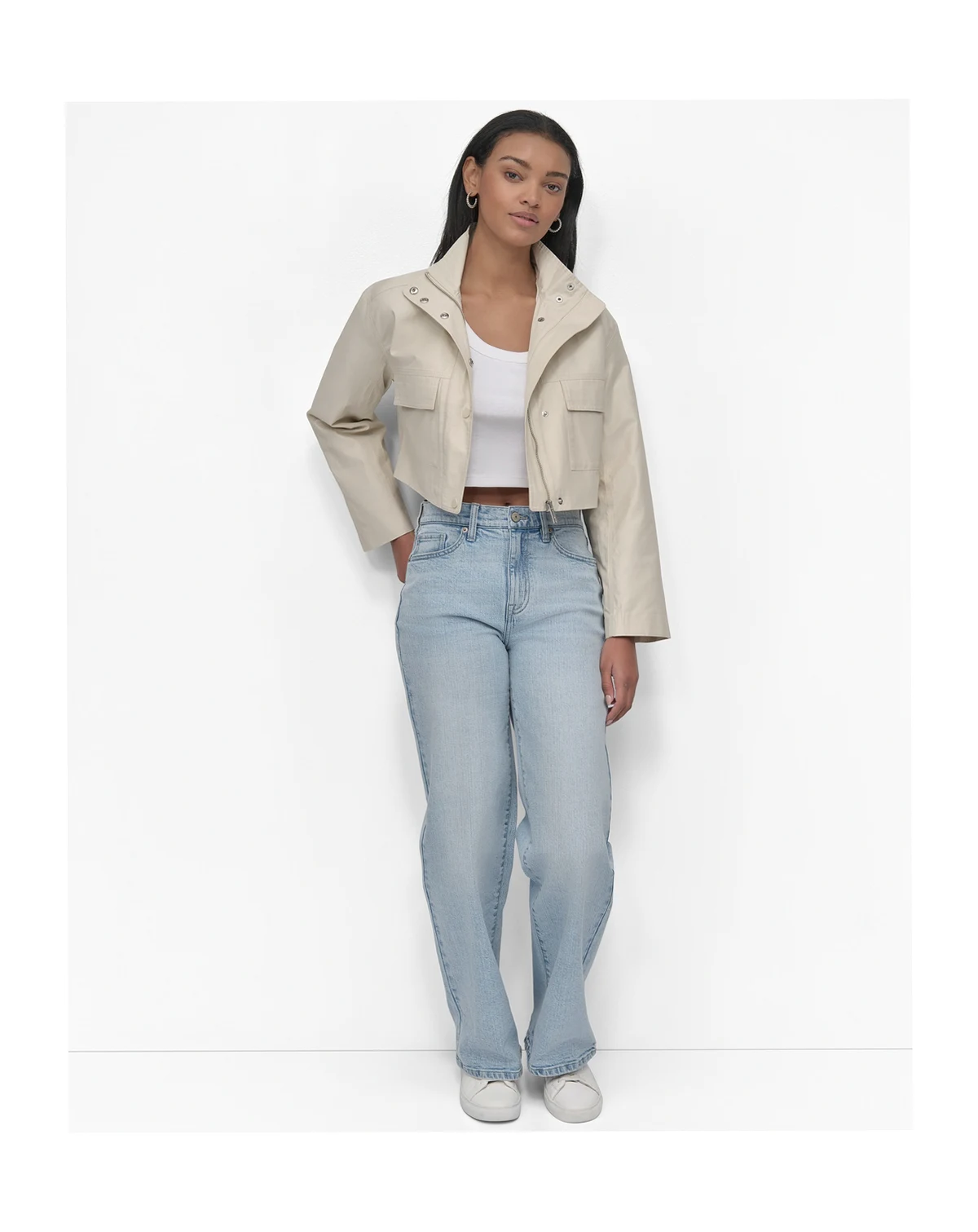 Experience the mix of urban style and functional design with this DKNY Jeans cropped coat, featuring a classic collared neckline and a secure zipper-and-snap closure. Two front flap pockets and a relaxed silhouette provide comfortable, organized layering.
