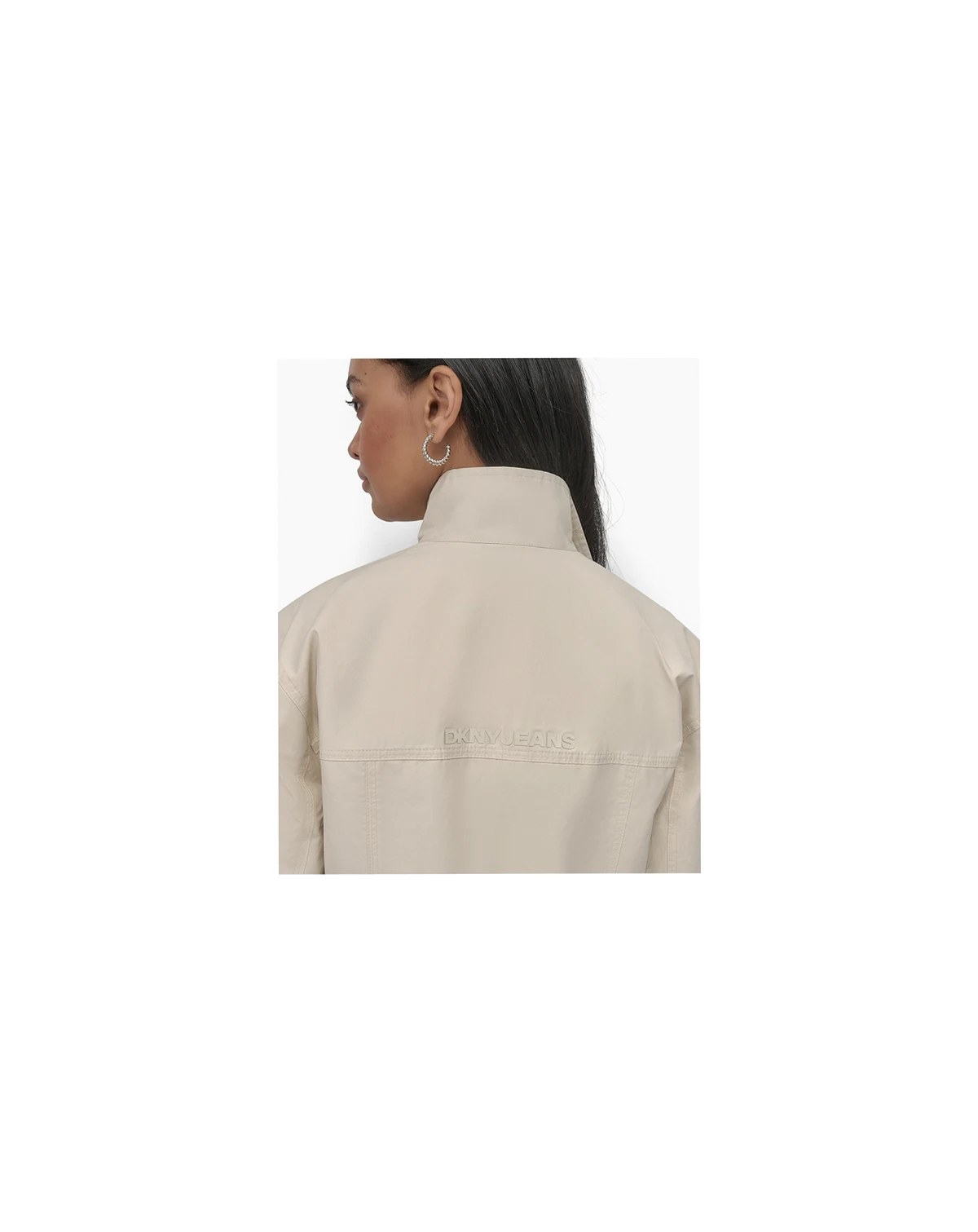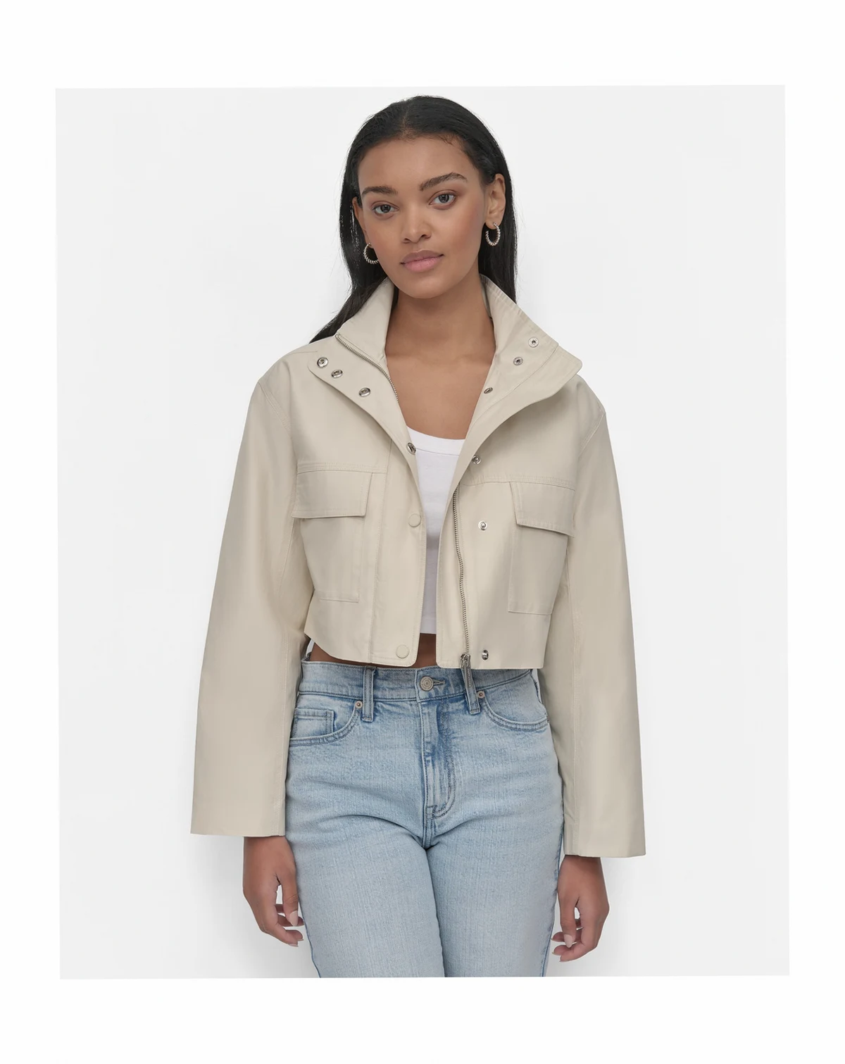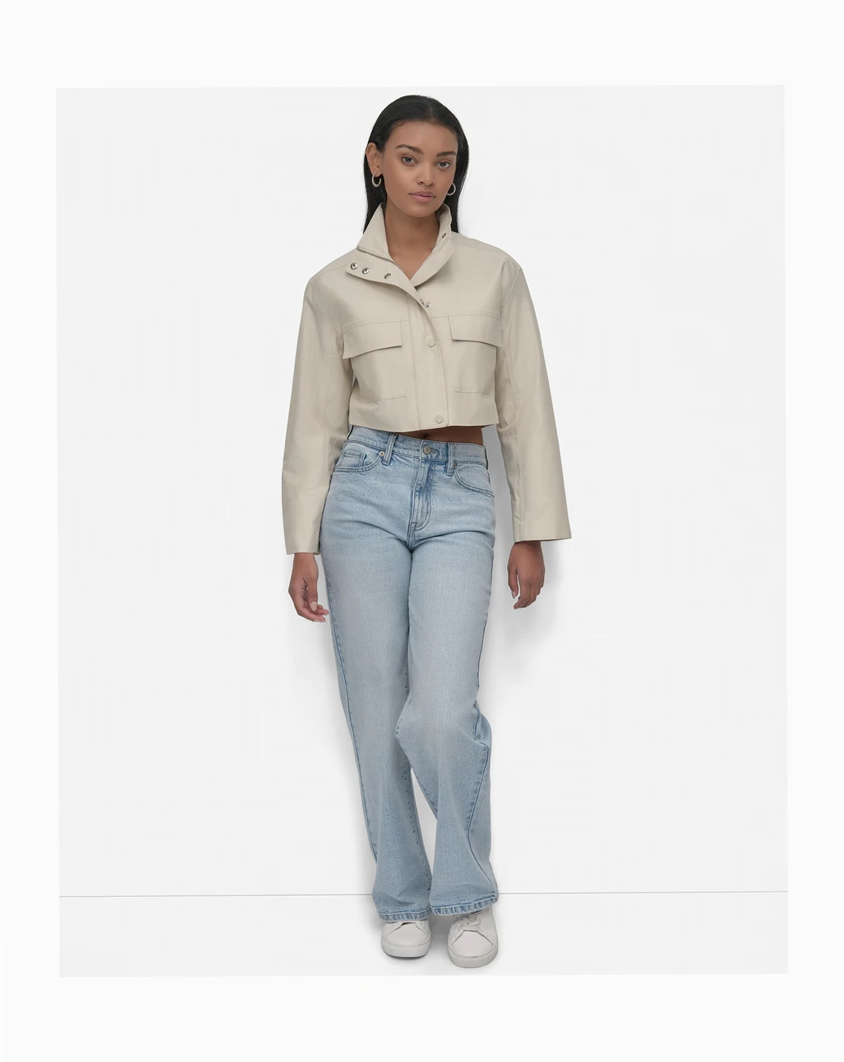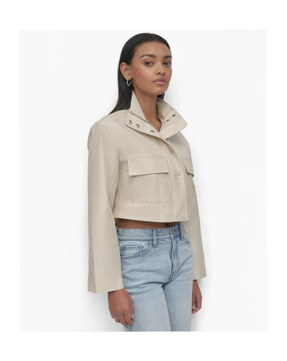 Experience the mix of urban style and functional design with this DKNY Jeans cropped coat, featuring a classic collared neckline and a secure zipper-and-snap closure. Two front flap pockets and a relaxed silhouette provide comfortable, organized layering.