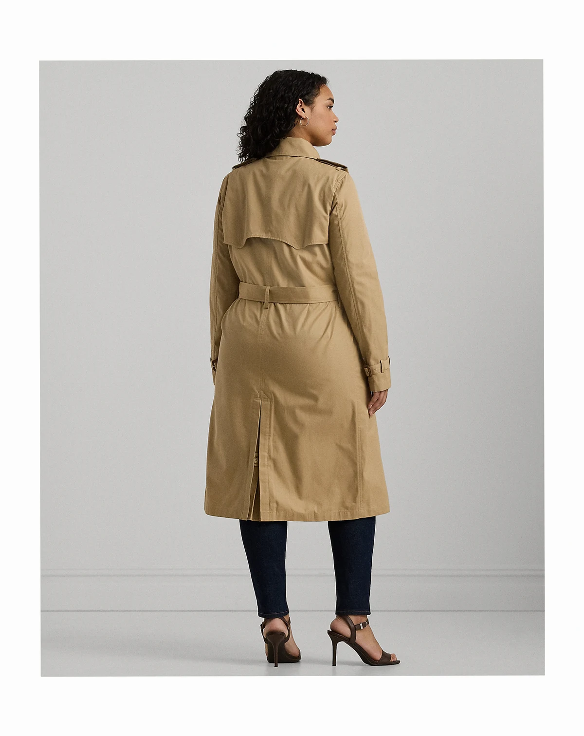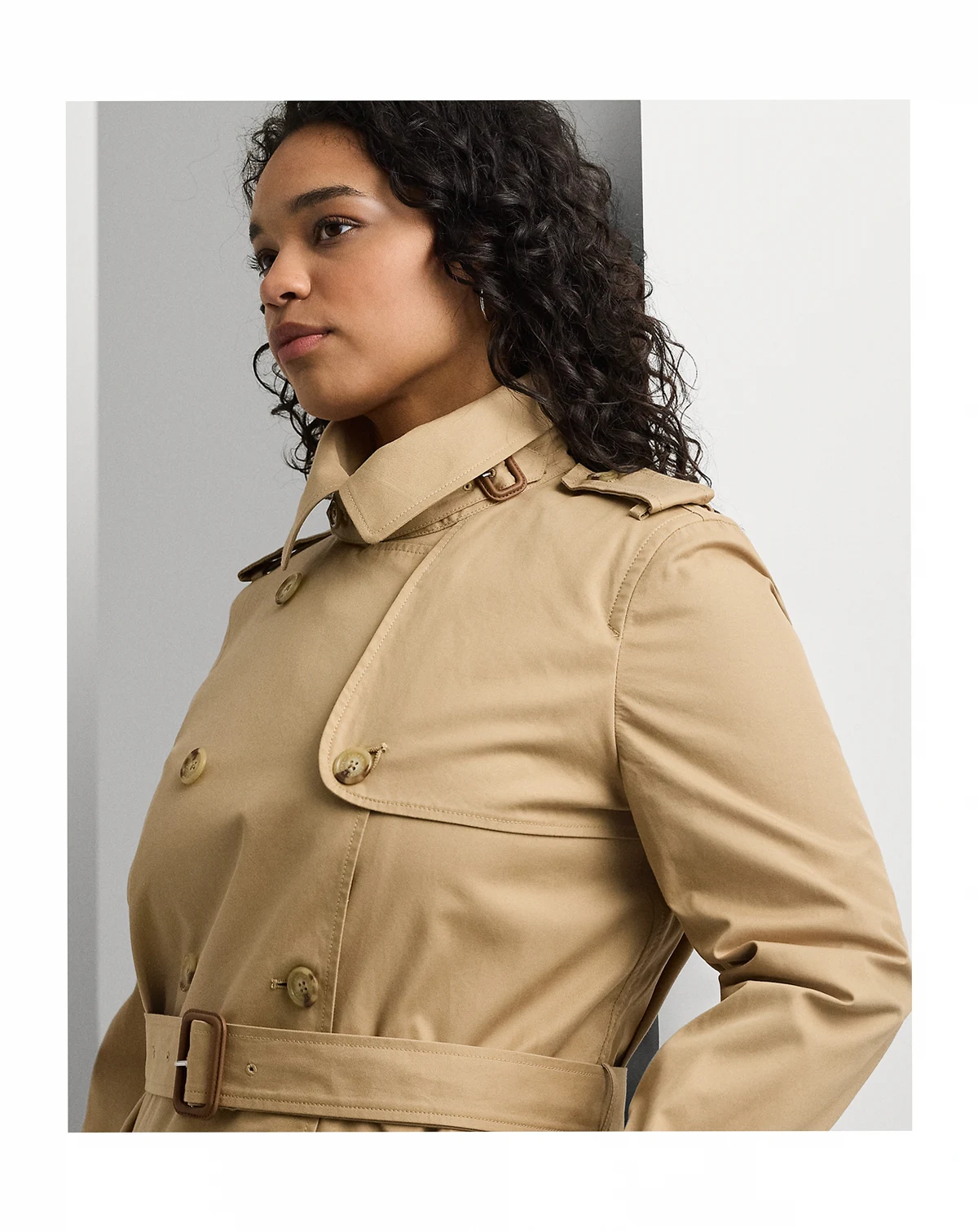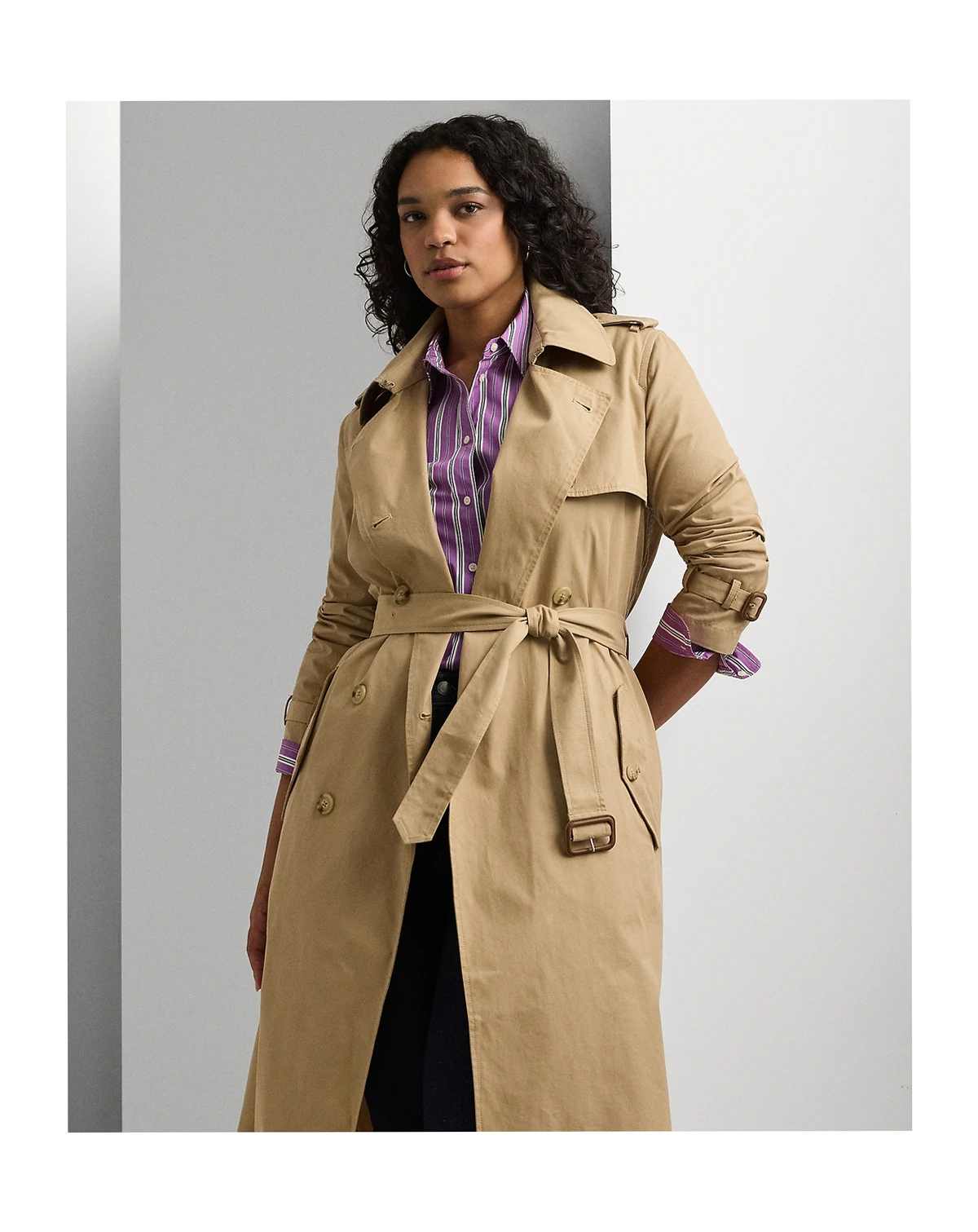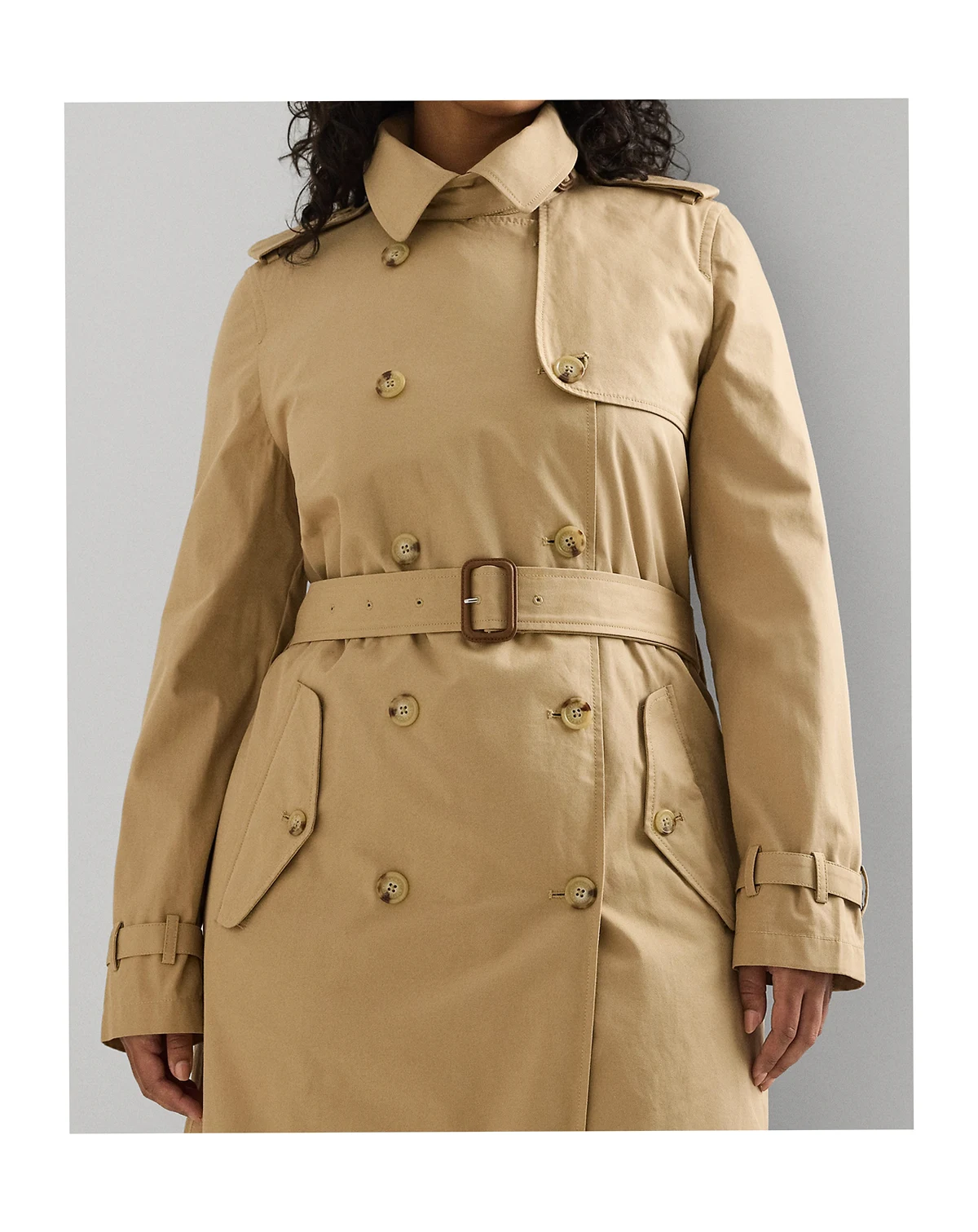 A classic outerwear staple, Lauren Ralph Lauren's double-breasted trench coat is detailed with traditional styling elements, including storm flaps, buttoned shoulder epaulets and a belted waist. It's crafted with lightweight cotton twill enhanced with water-repellent properties to keep you dry.
