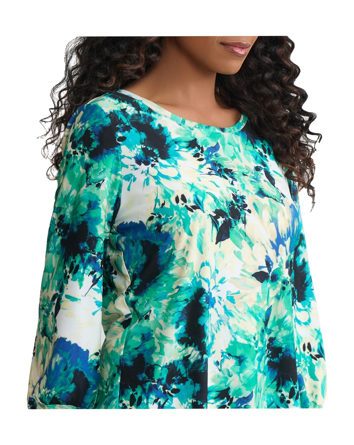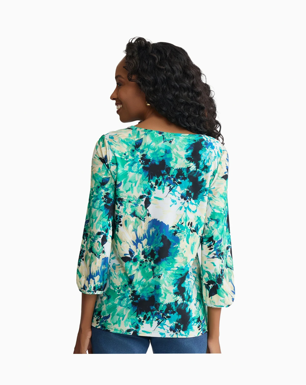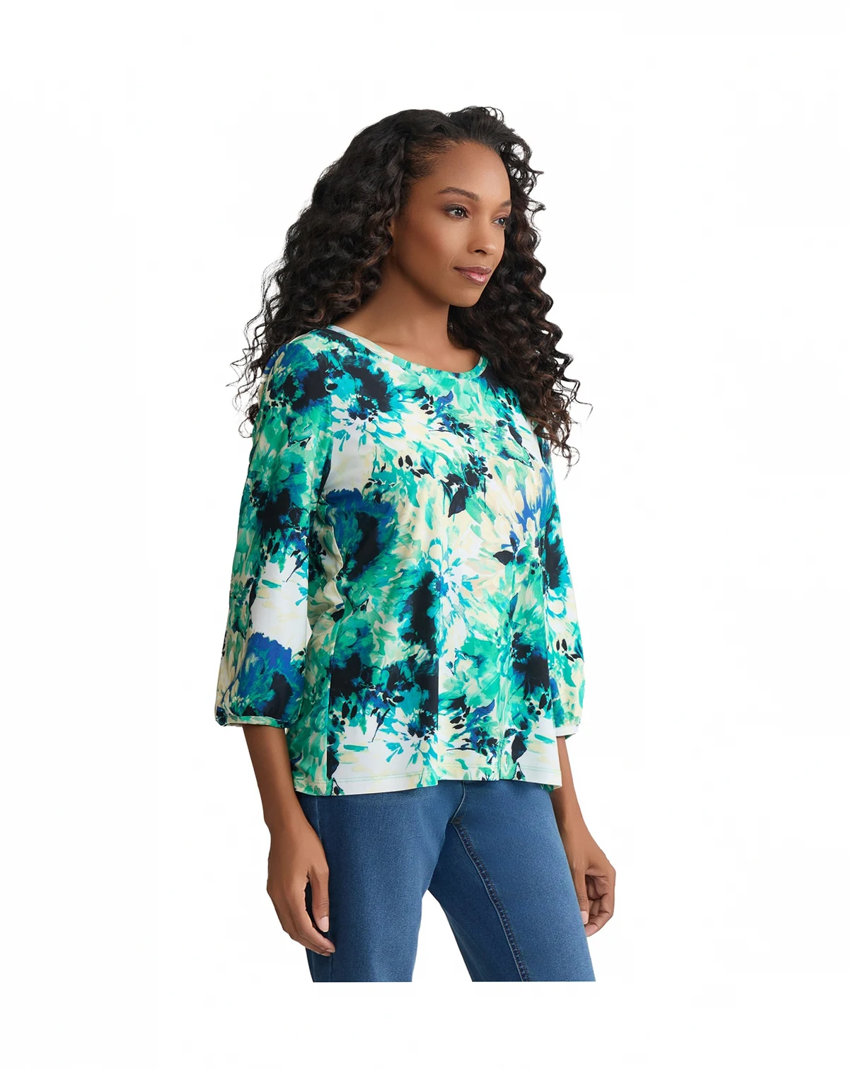 Designed with a crewneck and distinctive 3/4-length puff cuffs, this Jones New York top offers a playful silhouette. The printed moss crepe fabric provides a textured, comfortable feel.