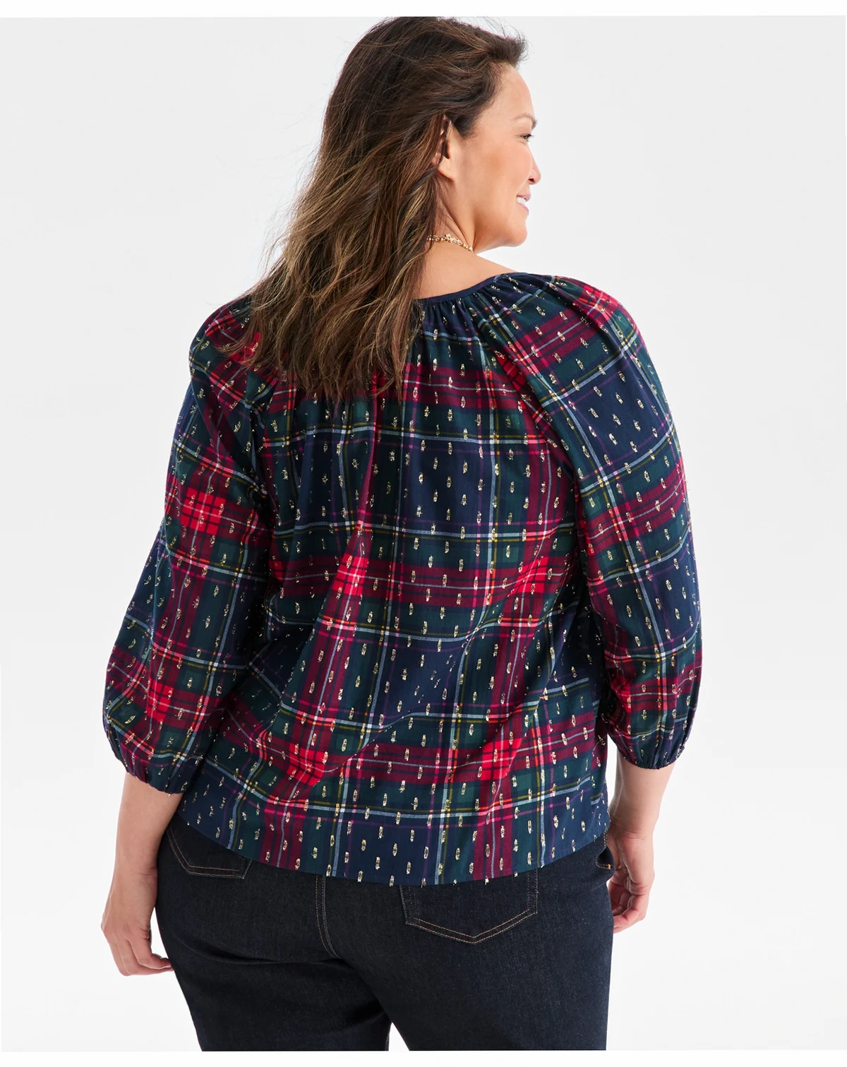Plus Size V-Neck Plaid Bubble-Sleeve Blouse, Macy's Exclusive