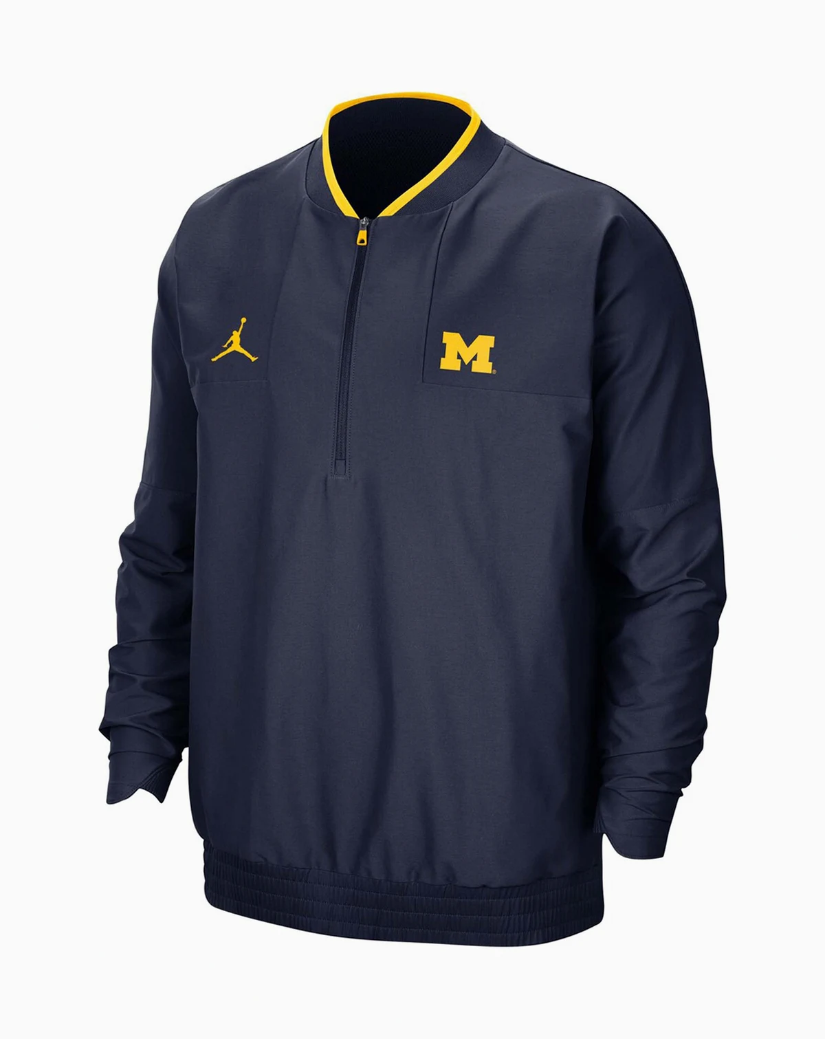 Layer up in authentic Michigan Wolverines fashion with this Coach half-zip jacket from Jordan Brand. This jacket features a bold graphic on the left chest and a striped, rib-knit collar. Best of all, this lightweight piece of outerwear is designed to look just like what the Michigan Wolverines wear.