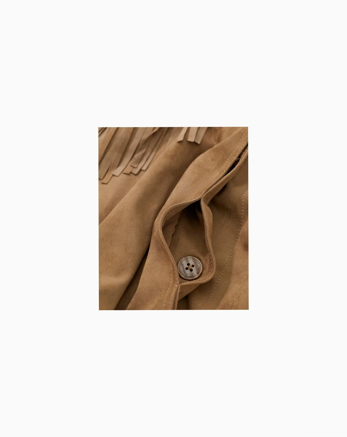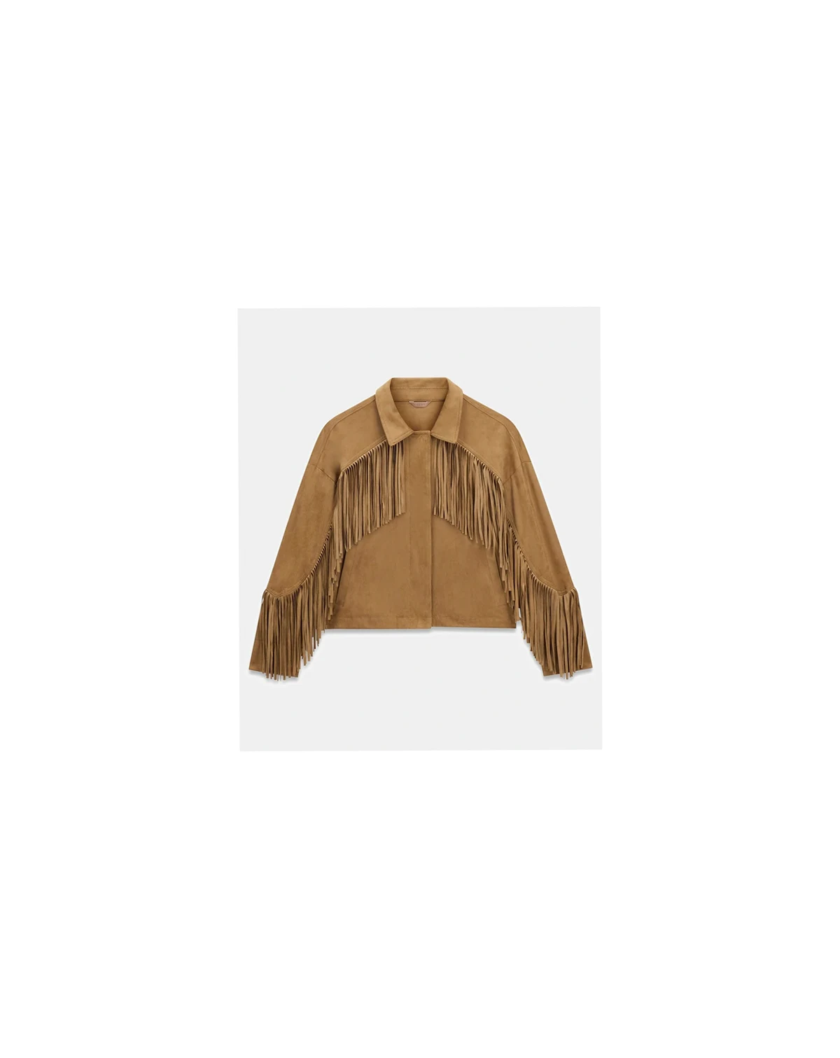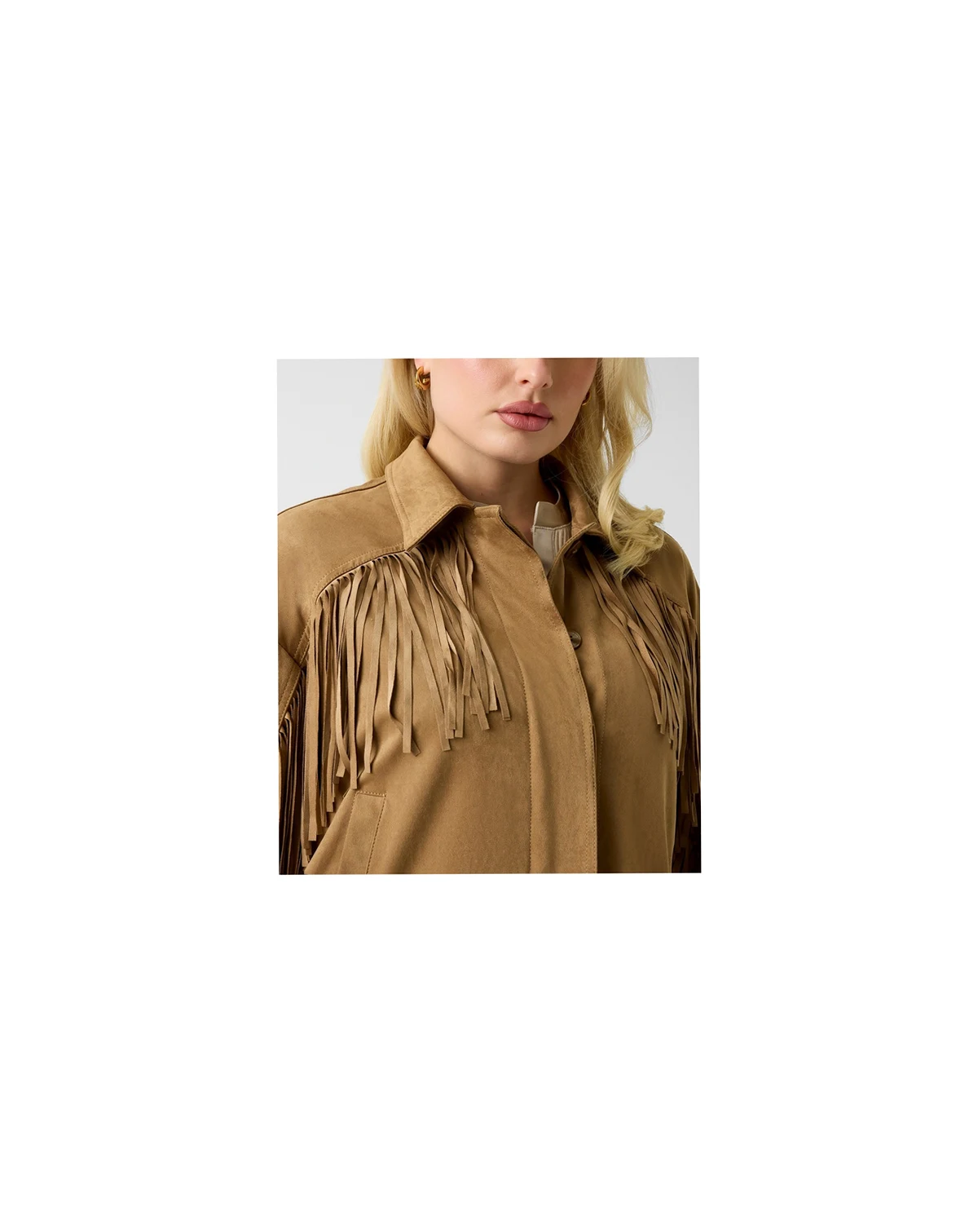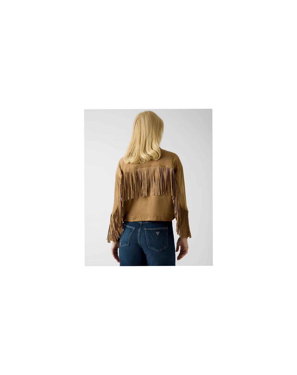 Crafted for bold, standout layering, this GUESS jacket features a collared neckline and long sleeves with fringe detailing on the chest. A button-front closure adds structure and timeless functionality to the design.