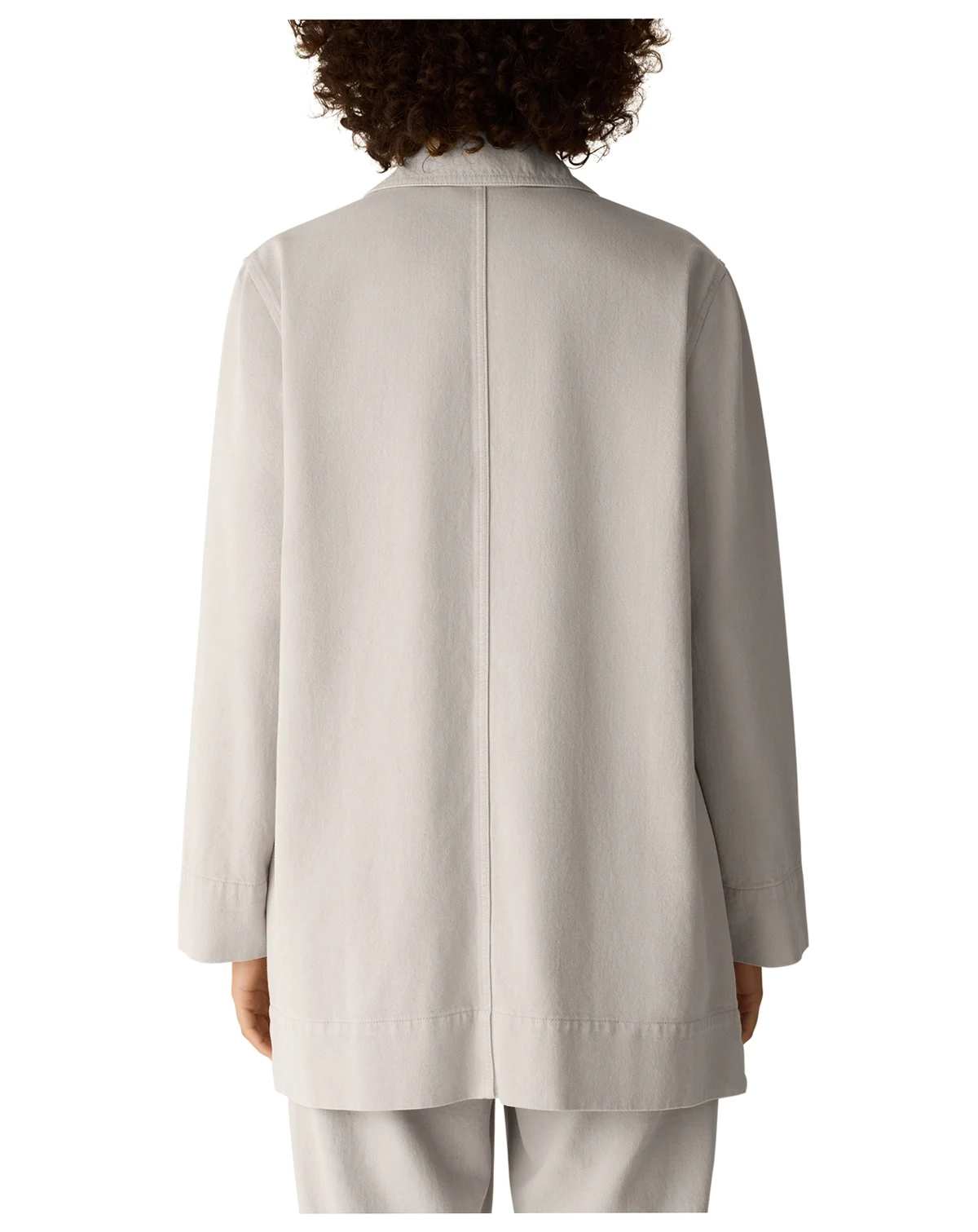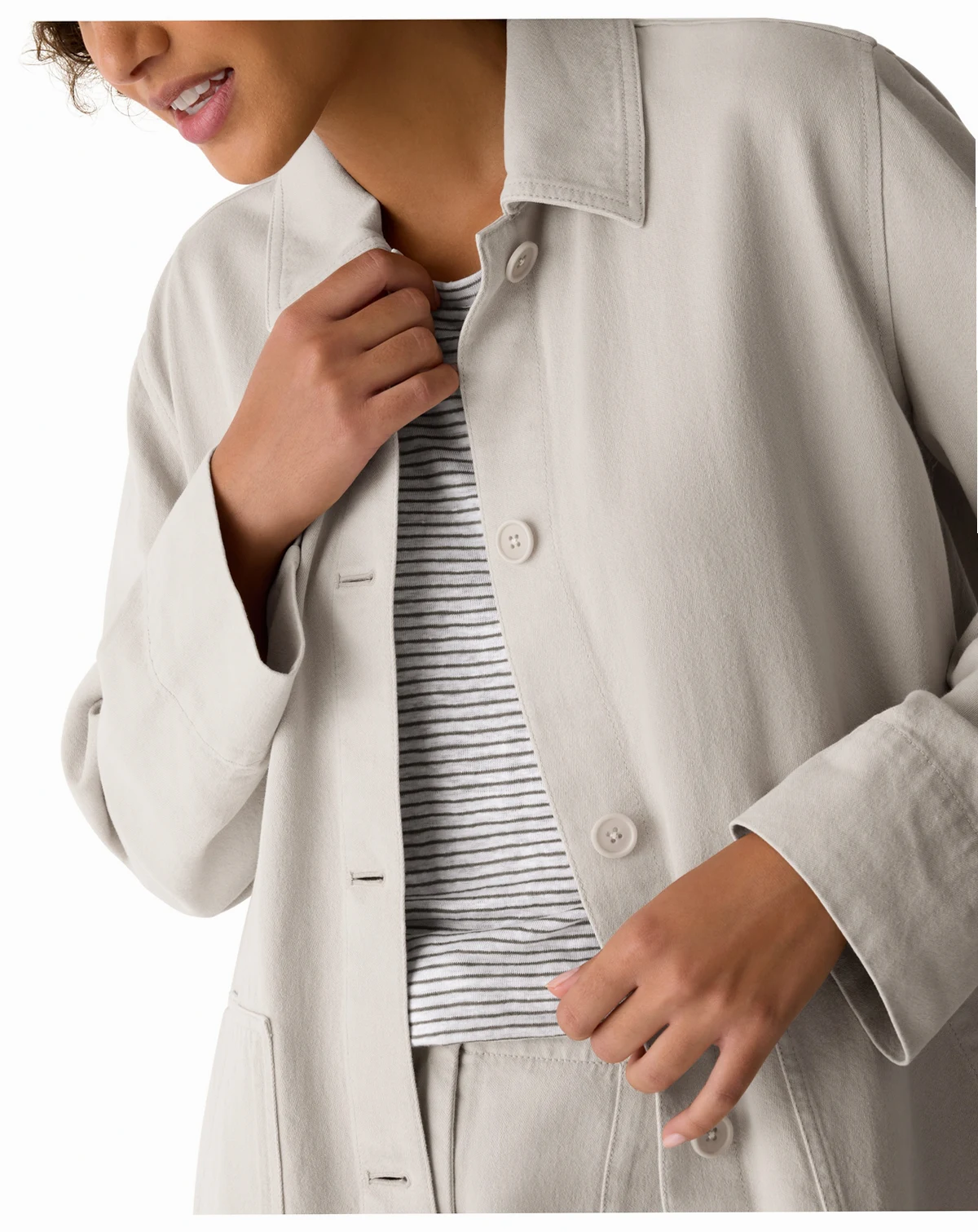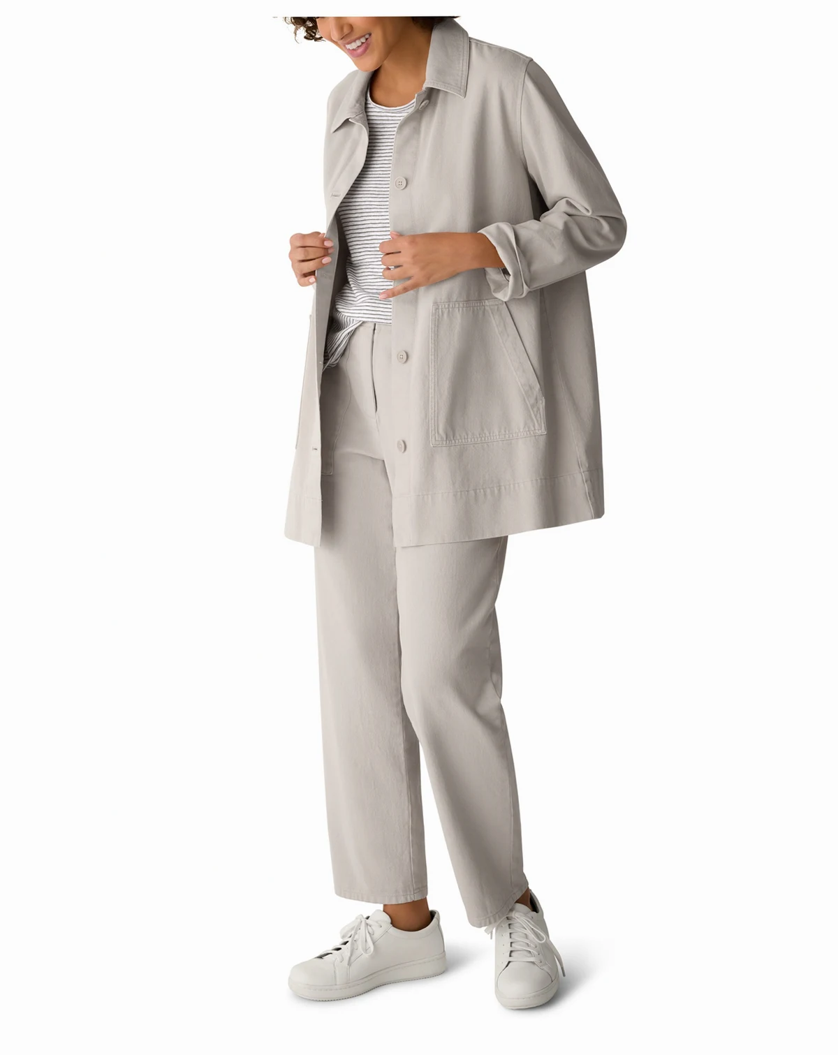 Channel workwear-inspired style with this Eileen Fisher jacket, featuring a classic collar for timeless appeal. Front pockets add practical, polished detail, making it both functional and stylish for everyday wear.