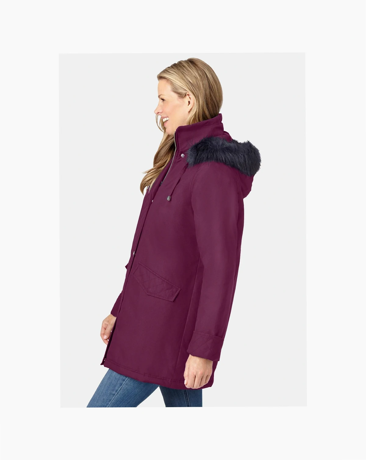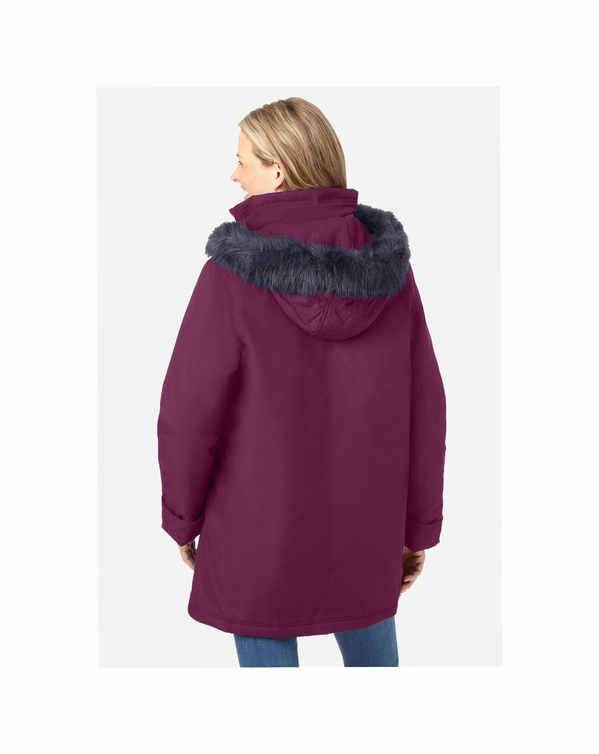 Stay warm this winter in our Faux Fur Down Parka filled with a super-light down and feather blend. A detachable hood with faux-fur trim adds extra warmth and protects against the elements. A drawstring hem can be cinched to keep your body heat in.Flap pockets. Front zip with snap placket32” length hits at the mid thigh. Poly shell down/feather filling poly lining acrylic trim imported. Machine washable