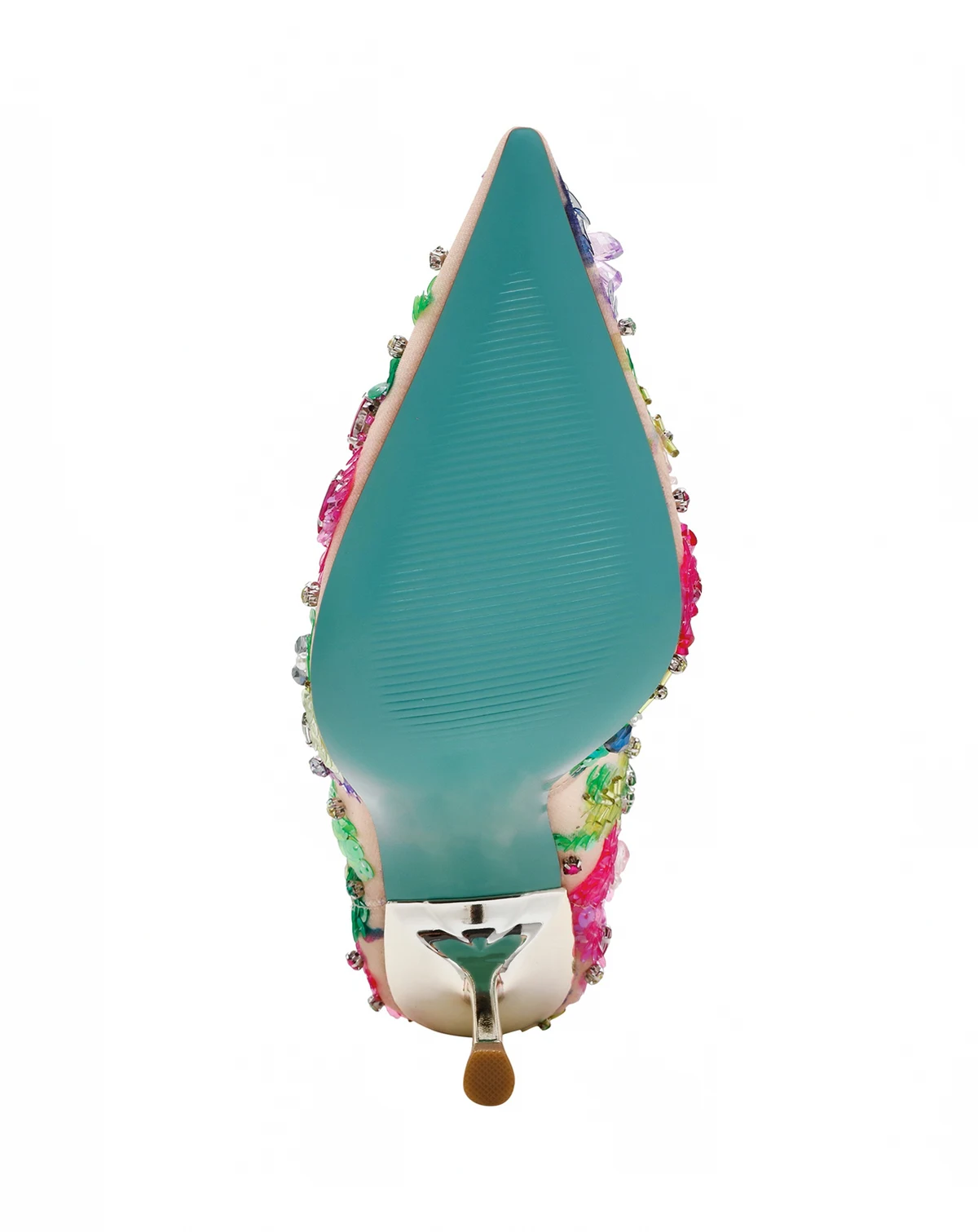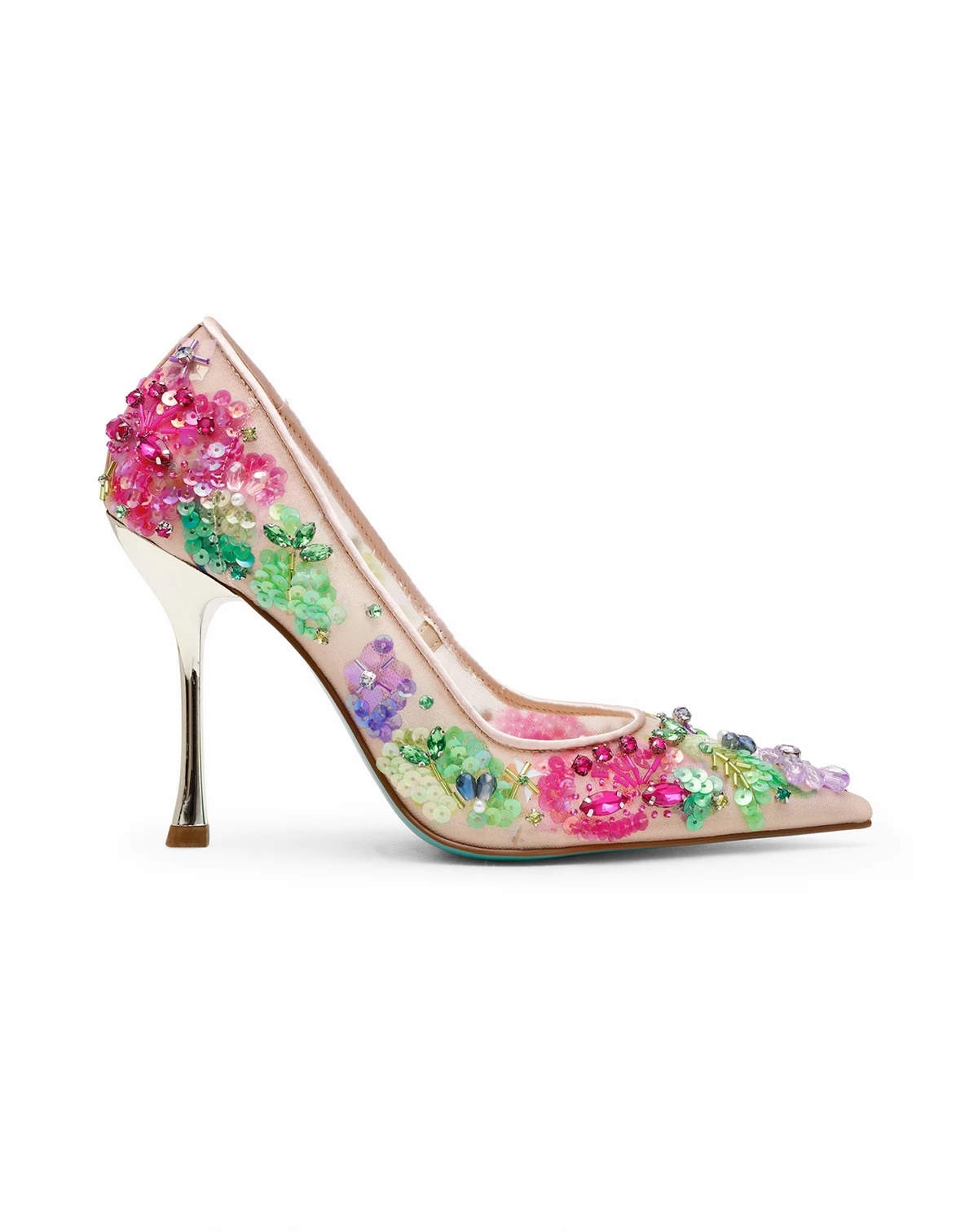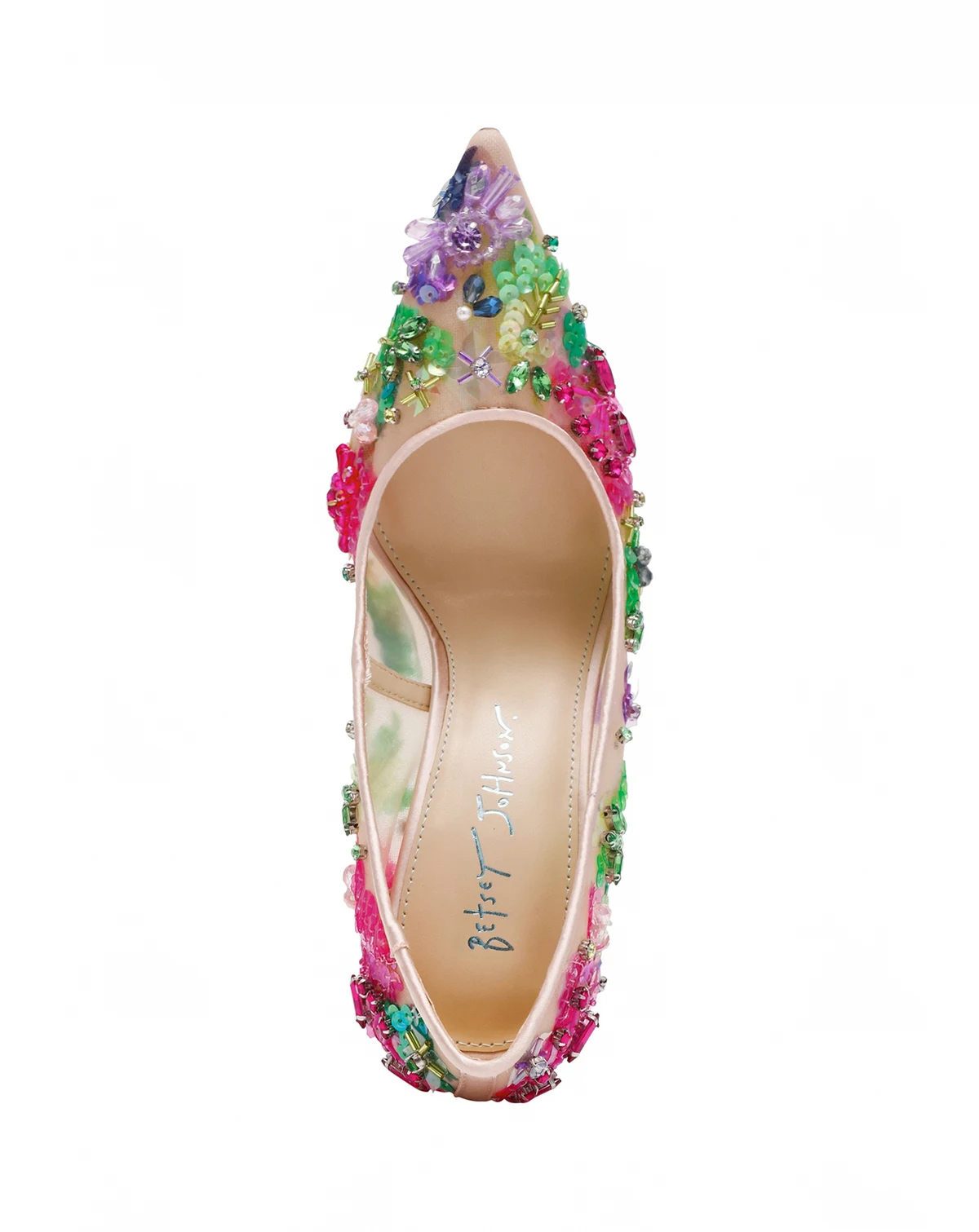 Vibrant florals and jeweled accents give a royal touch to these Netta stiletto pumps from Betsey Johnson. The pointed toe and slip-on design create a dramatic, glamorous look.