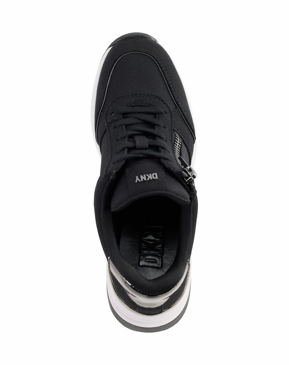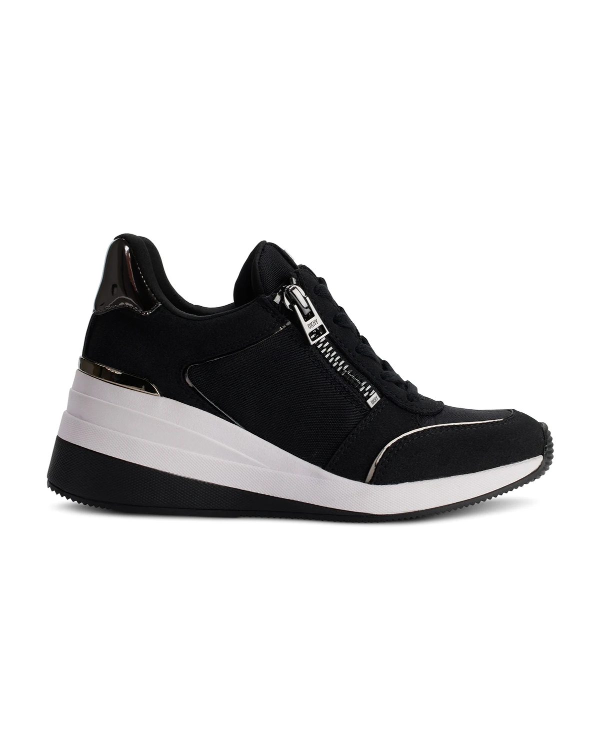 Exposed zips bring modern flash to a sporty laced look in the Kaden wedge sneakers by DKNY.