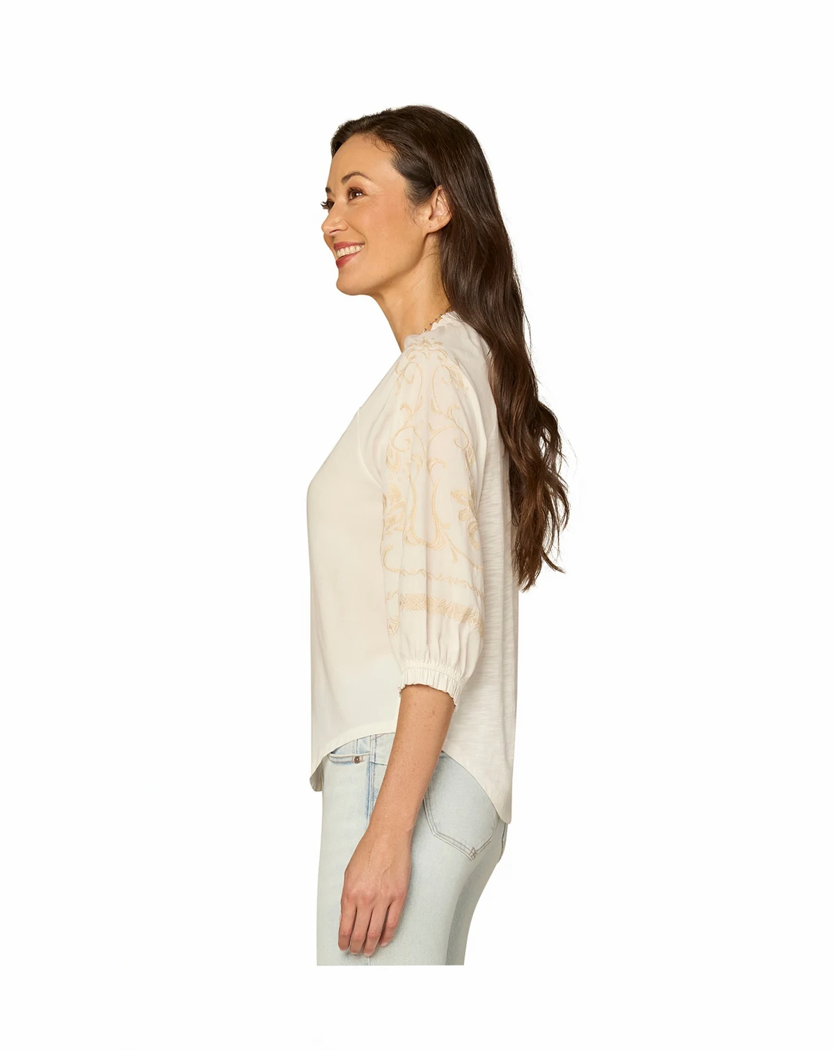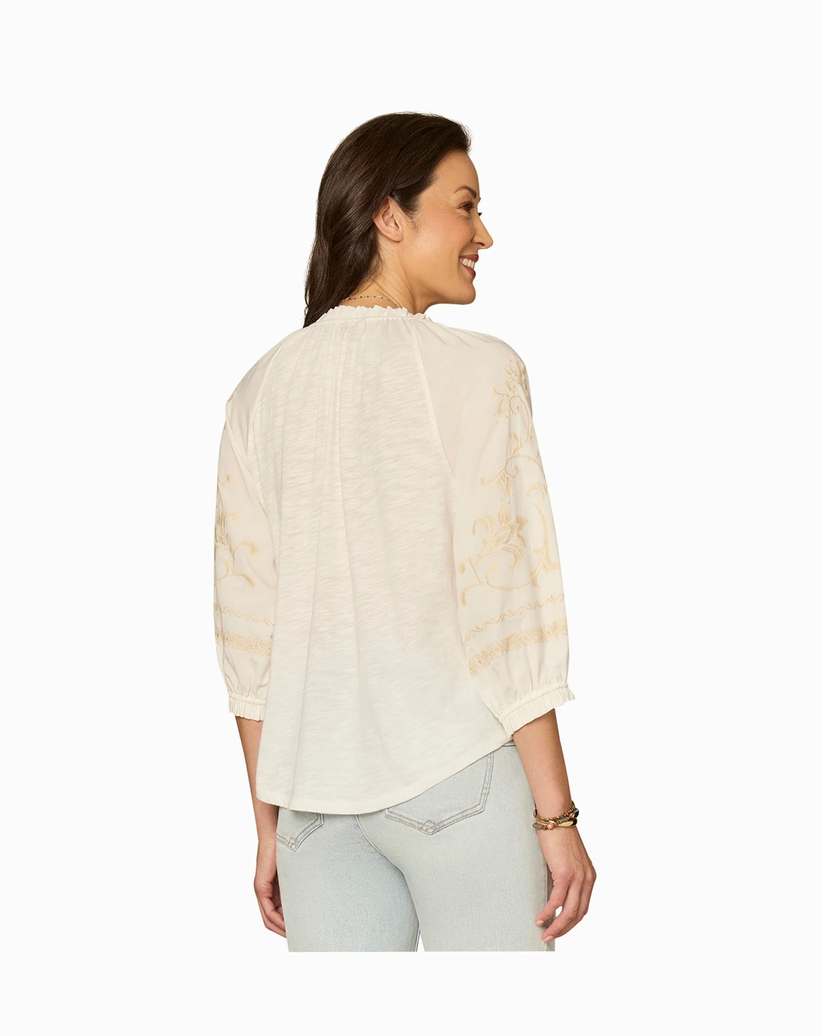 Textured femininity shines through this Democracy mixed-media top, adorned with embroidery and soft ruffle-edge detailing. 3/4-blouson sleeves and a half-placket finish the layered look.