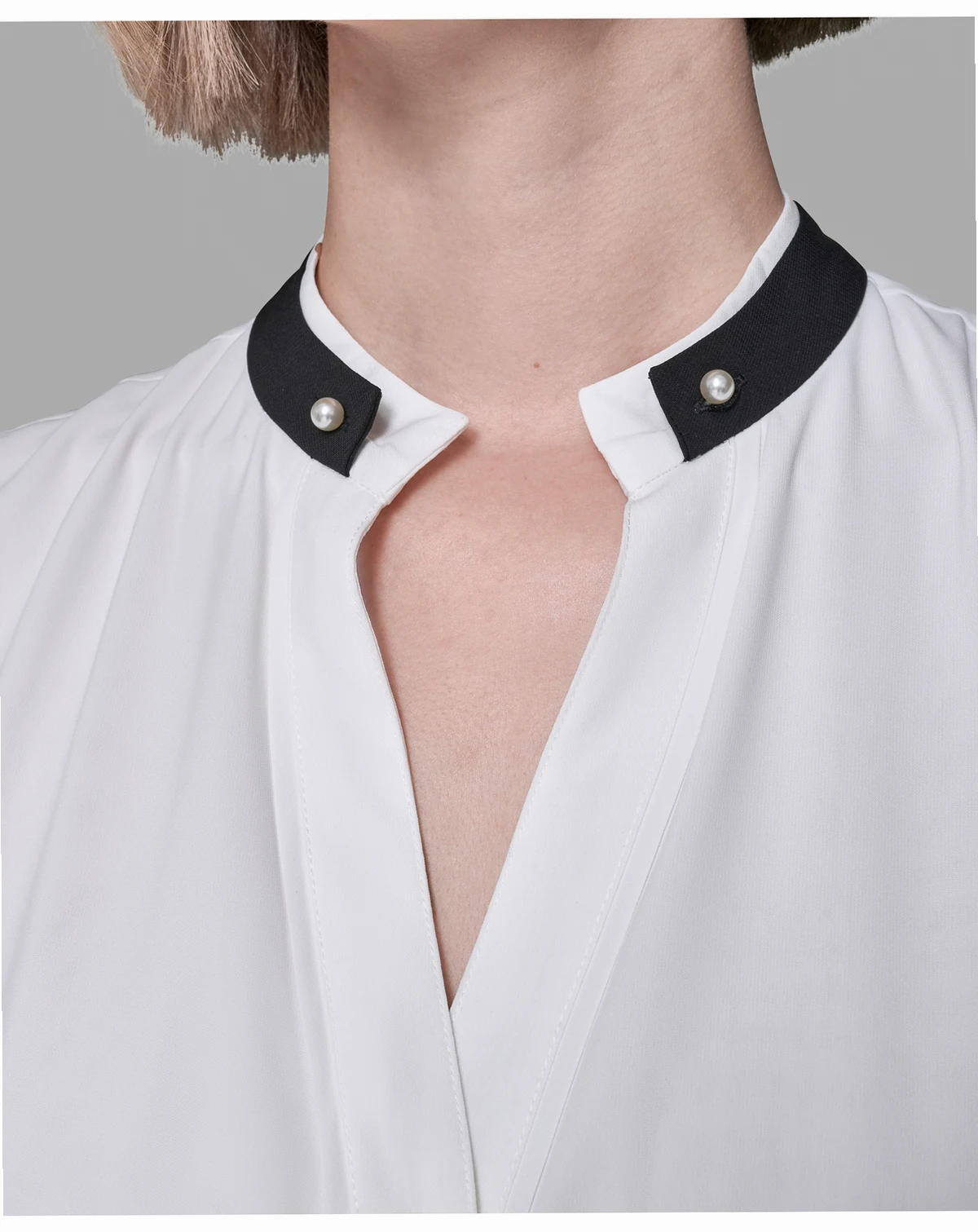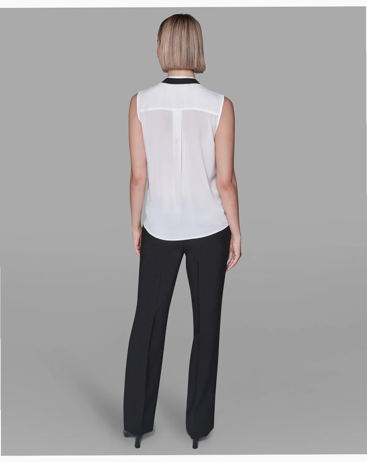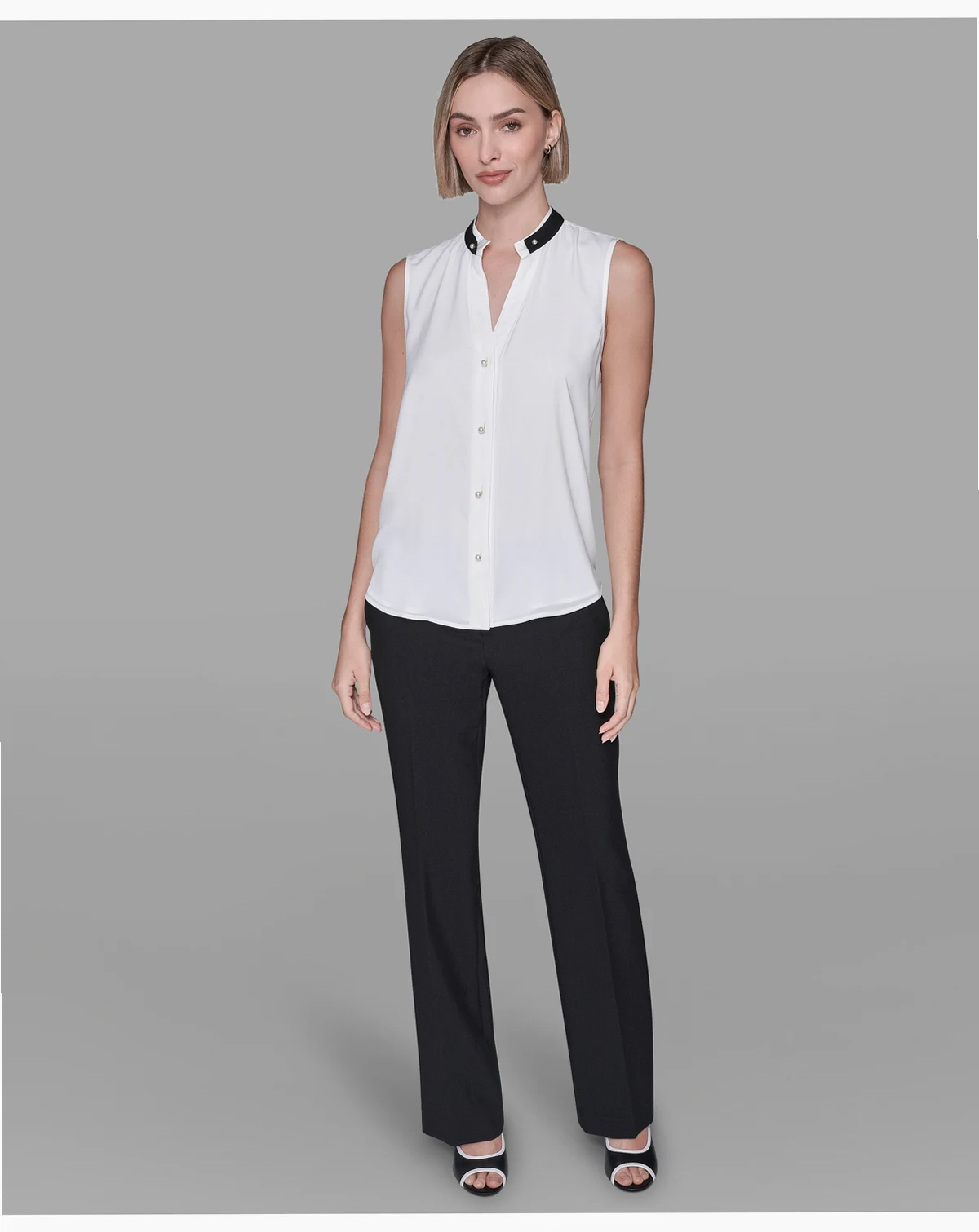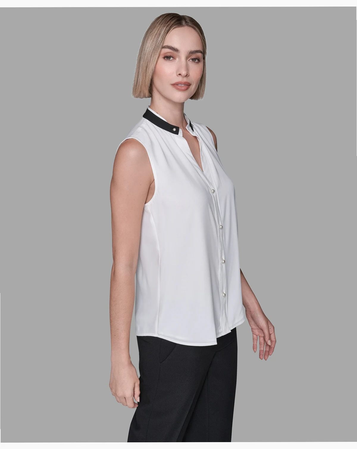 Designed with chic imitation pearl accents, this sleeveless blouse from KARL LAGERFELD PARIS brings a touch of luxury to your wardrobe. The button-down closure ensures a clean and modern look for professional styling.