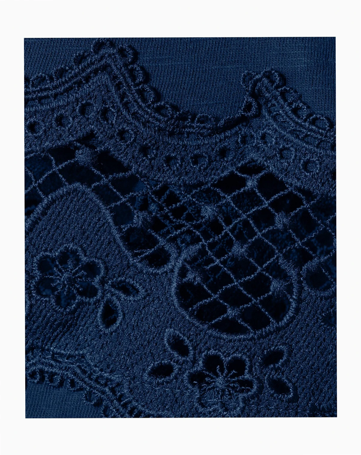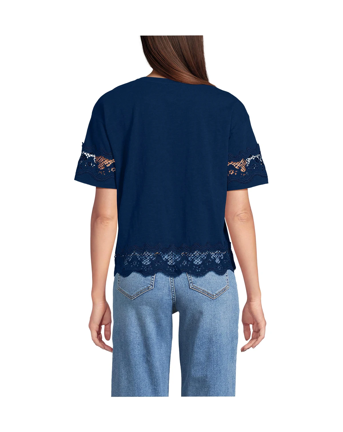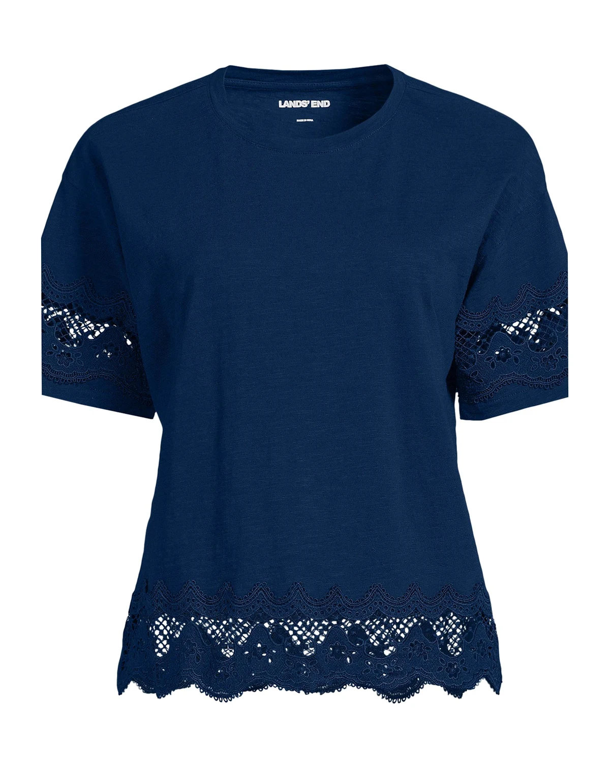 This isn t your average tee. Crafted from textured all-cotton slub jersey, it s designed with a boxy, relaxed fit for that effortless, laid-back vibe. Feminine lace cutwork at the sleeves and hem adds a soft, special touch, while the crew neckline keeps it casual. Pair it with denim, shorts or skirts – it s made to go with everything..