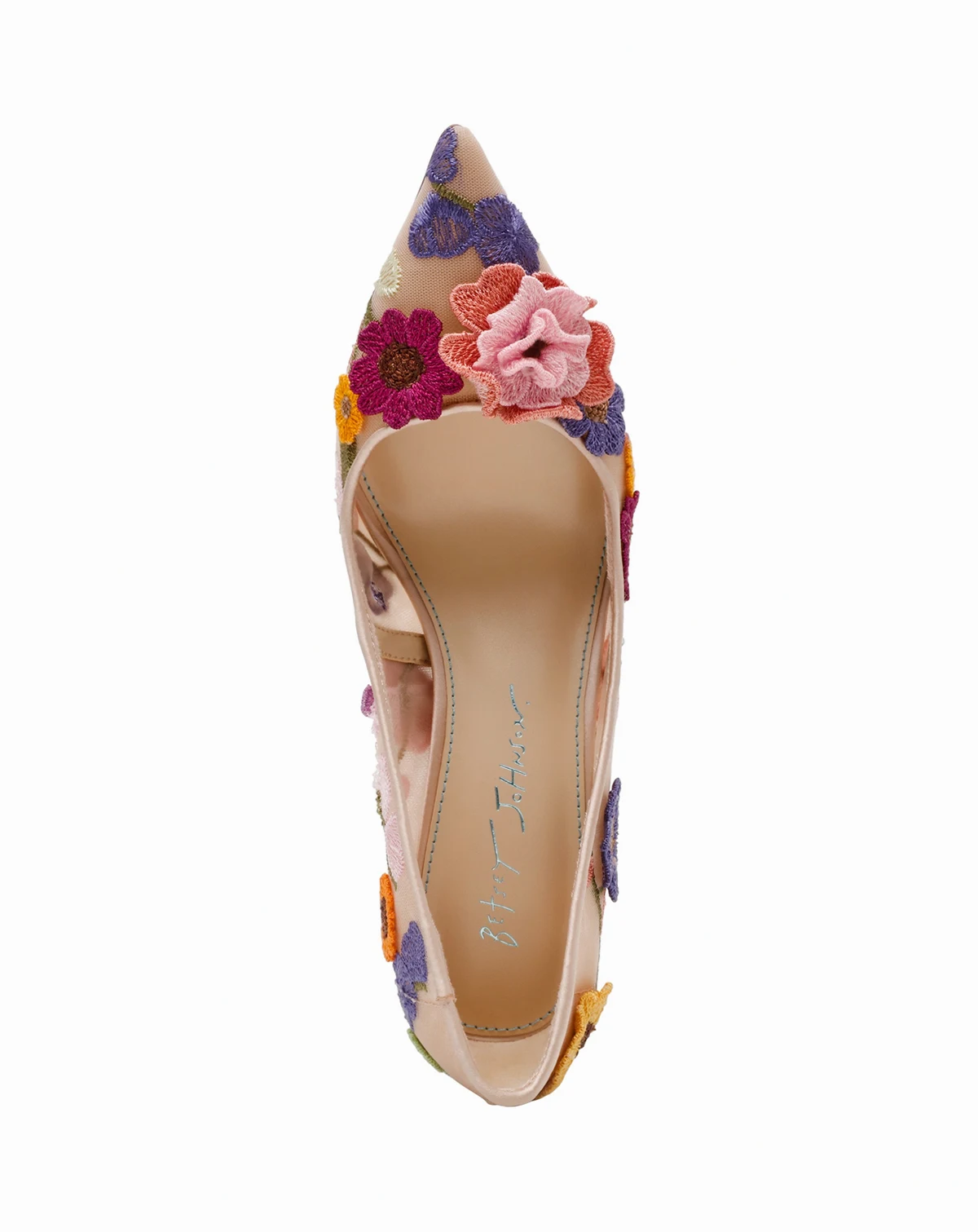 A sleek silhouette is made feminine with flower appliques. Betsey Johnson's new Aimey pump is sure to be a new favorite in your closet.