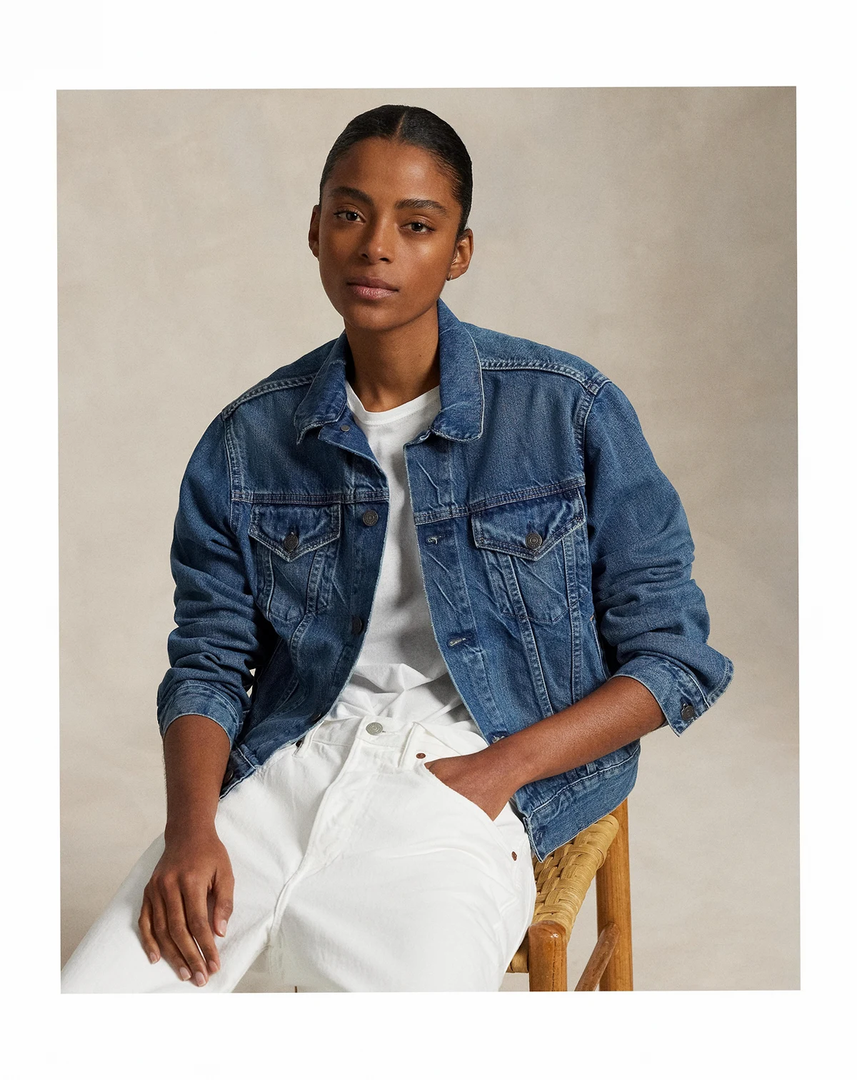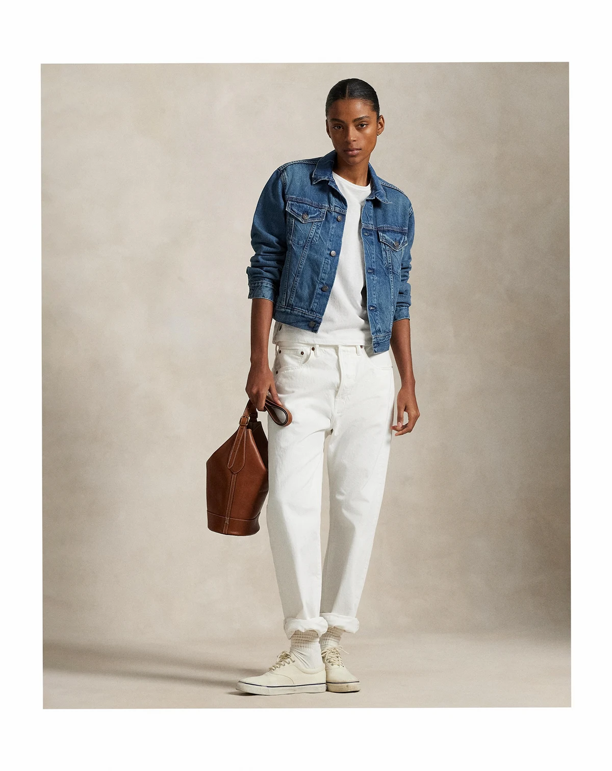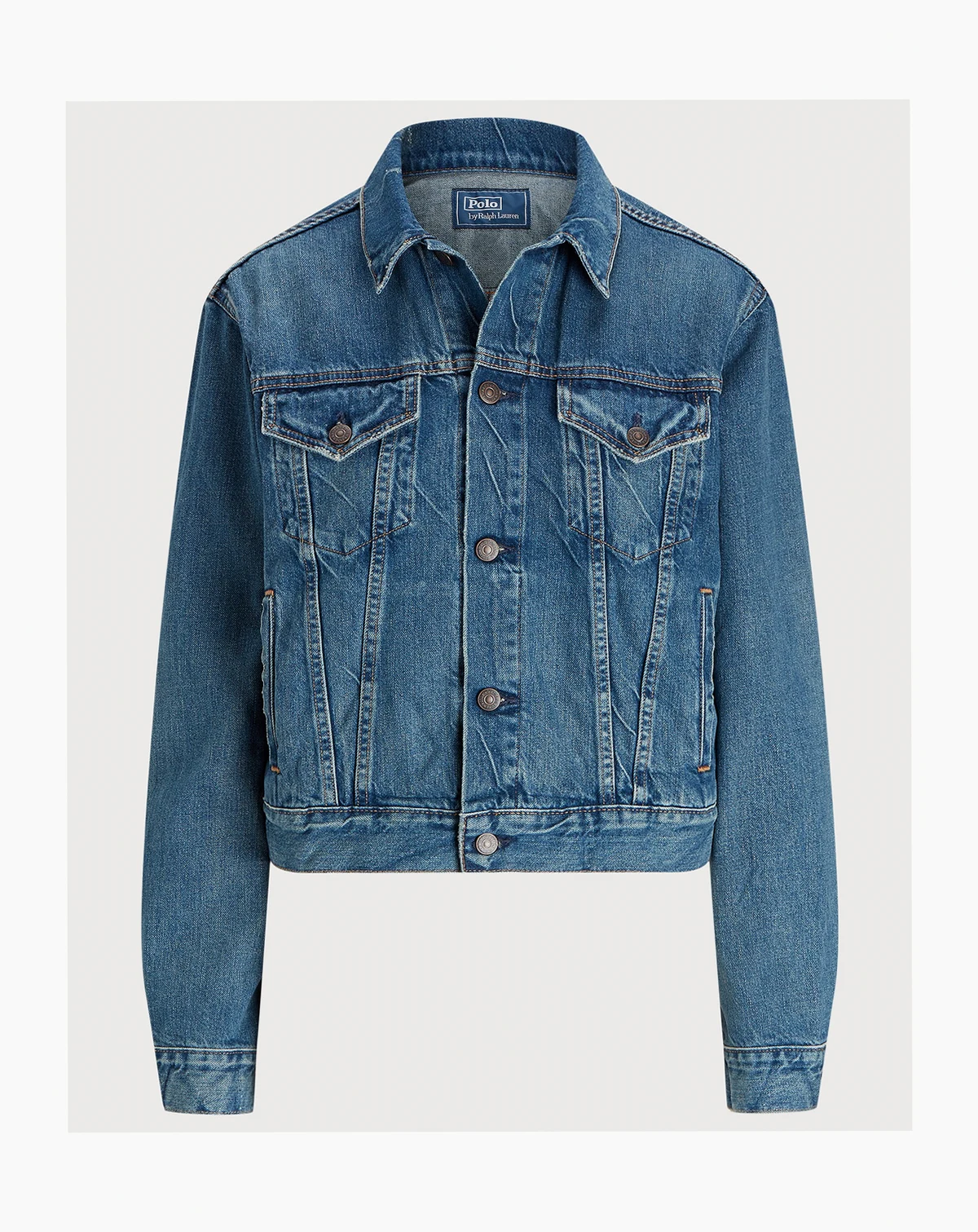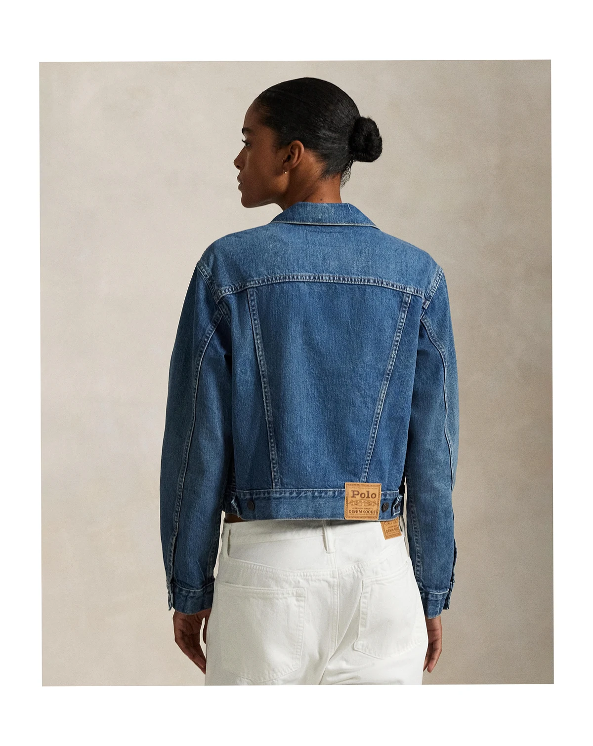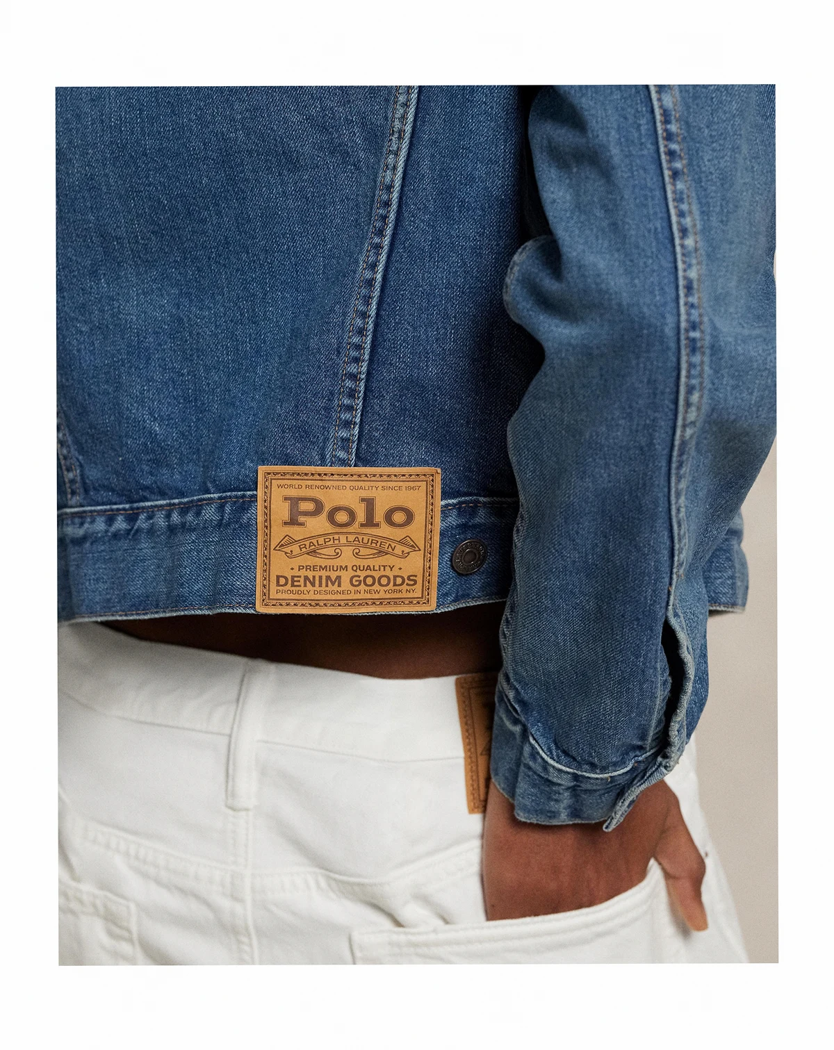 82% cotton, 18% lyocell; Signature engraved buttons; adjustable buttoned waist tabs; signature leather patch at back