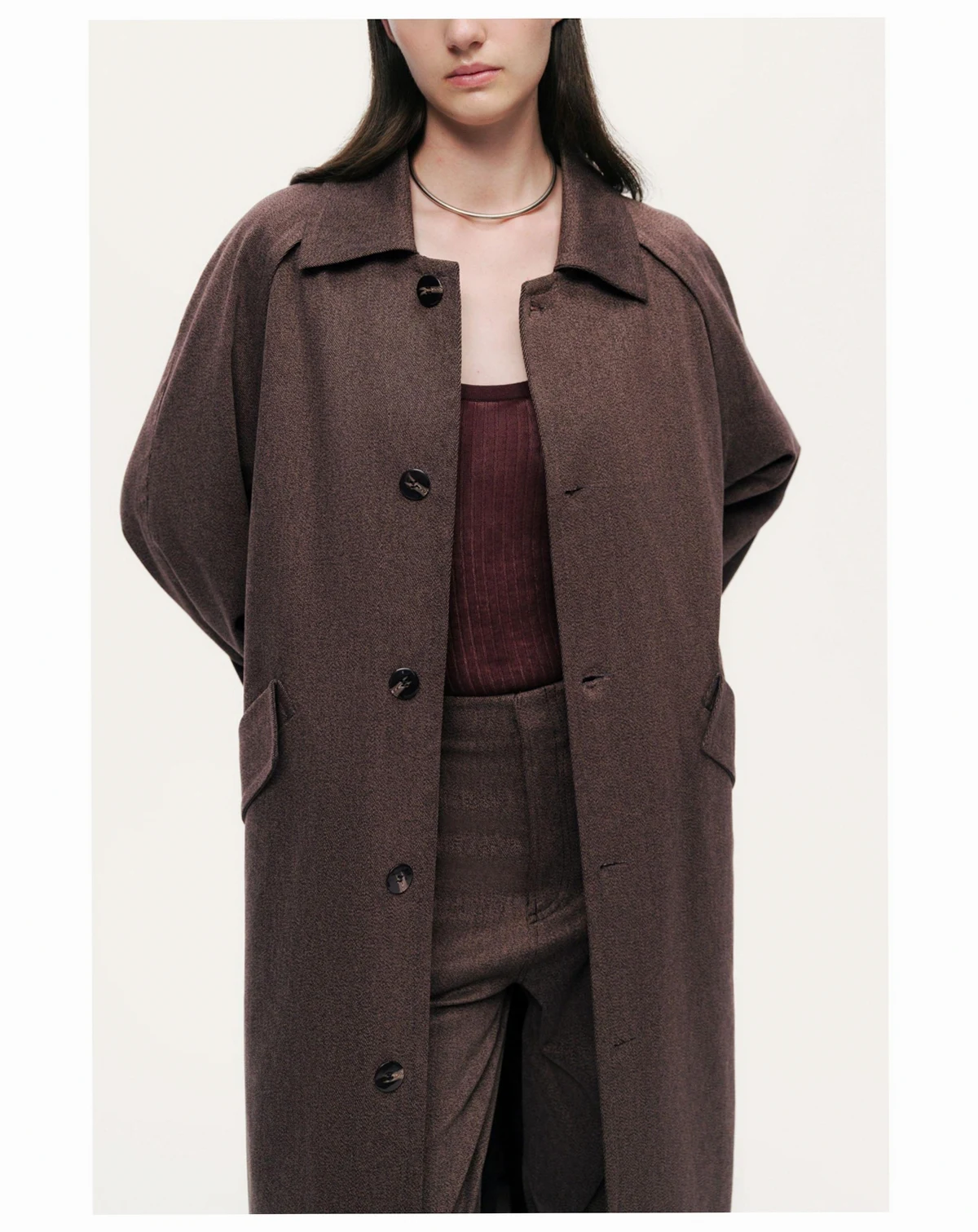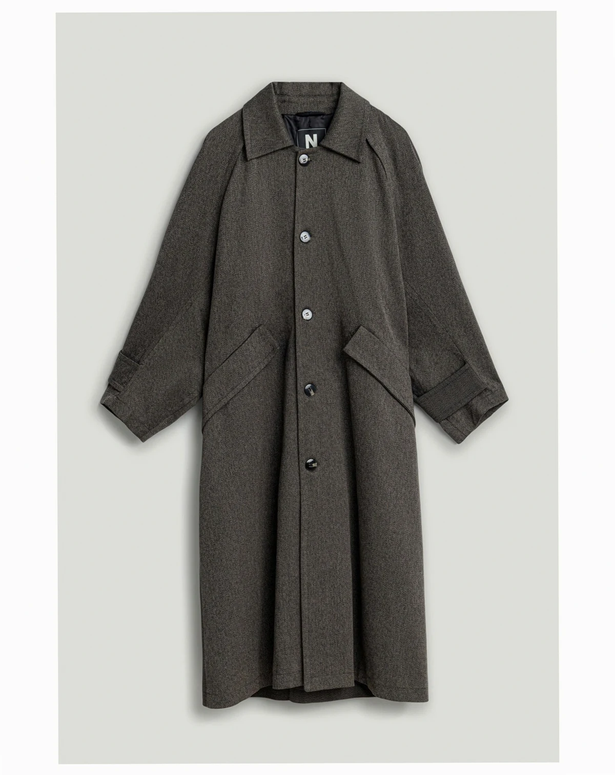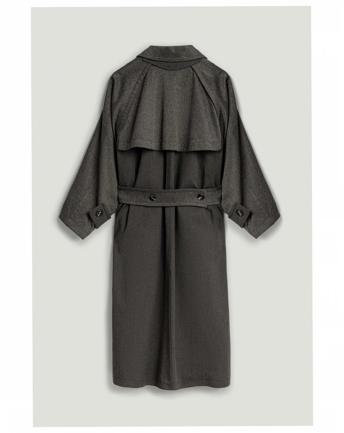 The pointed collar and clean button front highlight its classic appeal, complemented by a functional back storm flap for subtle structure. Button-tab cuffs and a back half-belt add tailored detailing, while side pockets bring everyday practicality.; Dry clean